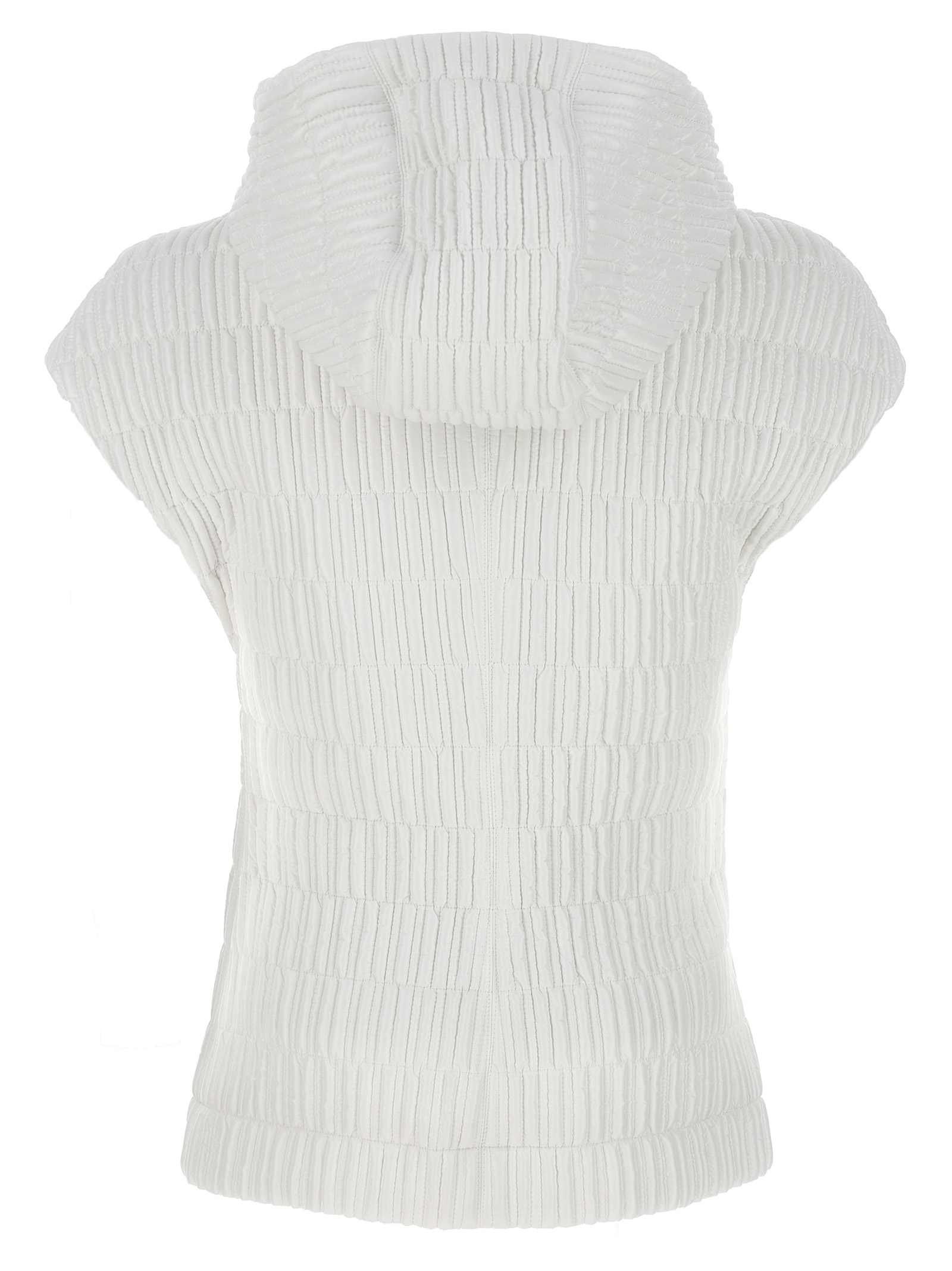 Padded nylon hooded vest, zip closure, pockets, front logo patch.