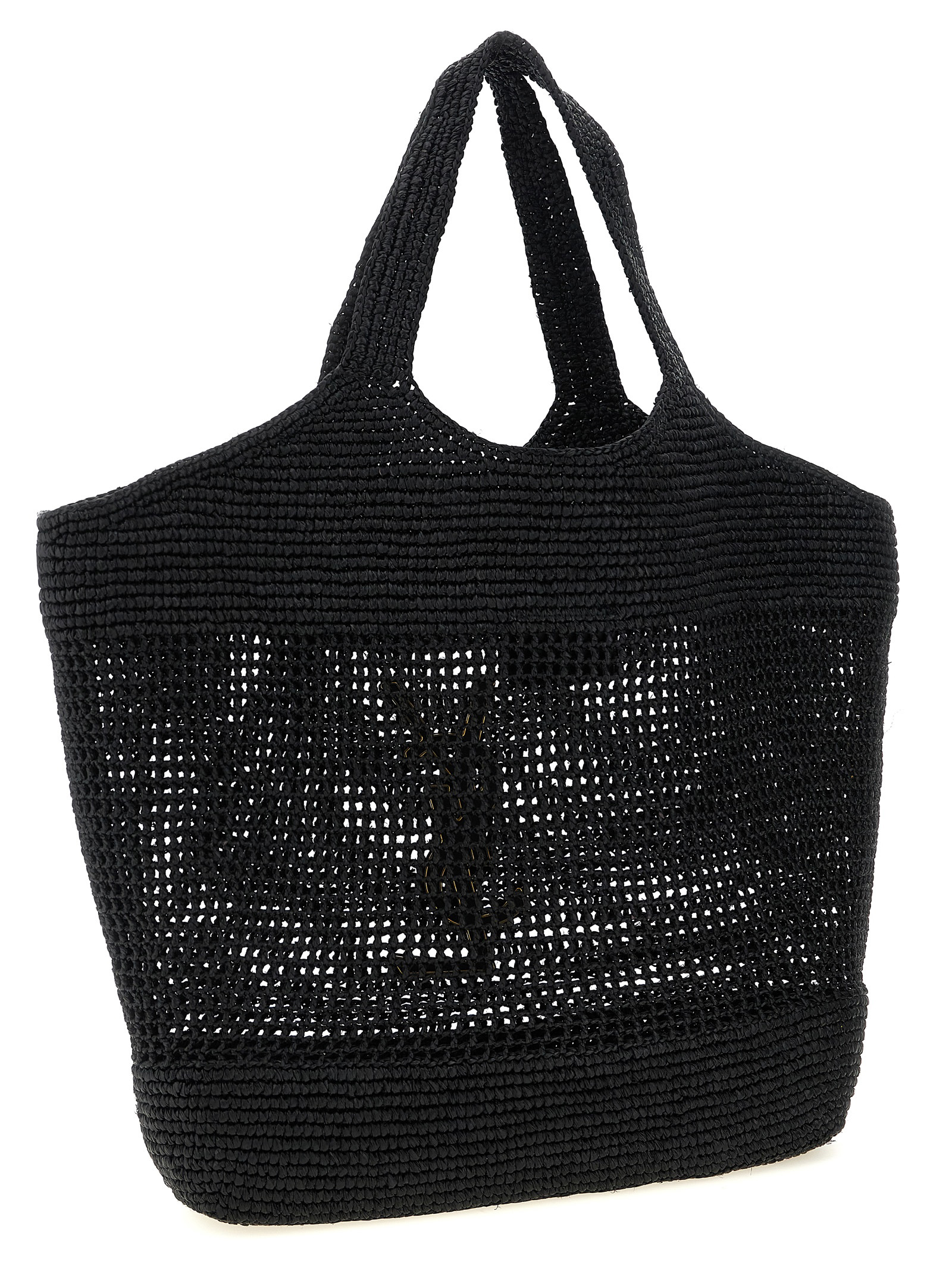 'Icare' shopping bag in natural raffia and hand-crocheted vegetable tanned leather, oversized metallic Cassandre logo with antiqued effect on the front, double fixed handle, inner chain to fold or widen the sides as desired, removable matching glasses clutch bag. Handcrafted product, any imperfections are to be considered characteristics of uniqueness.