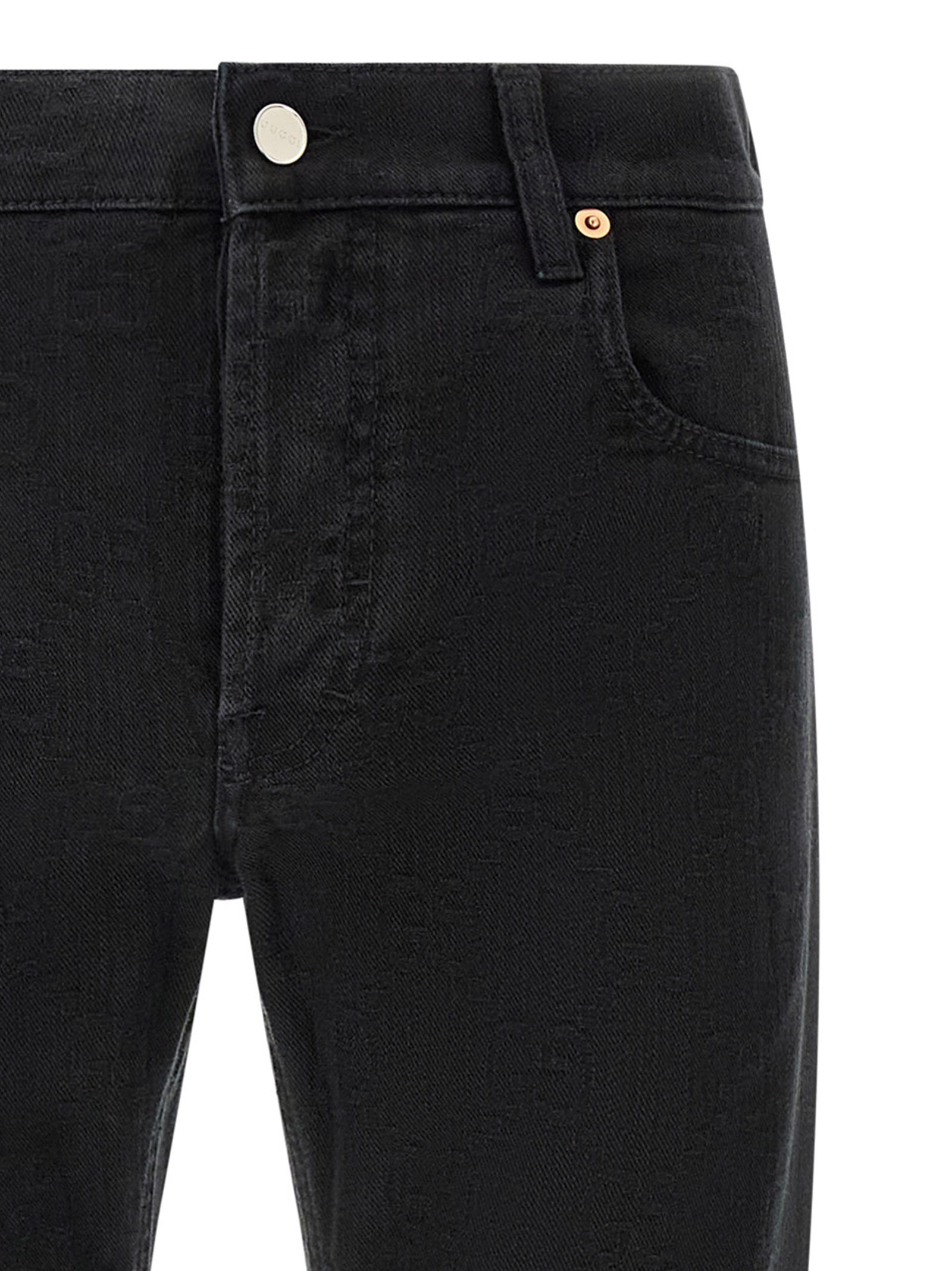GG jacquard denim jeans, straight leg, front button closure, five pockets, 'Gucci Rosso Ancora' naplak logo label at the back.