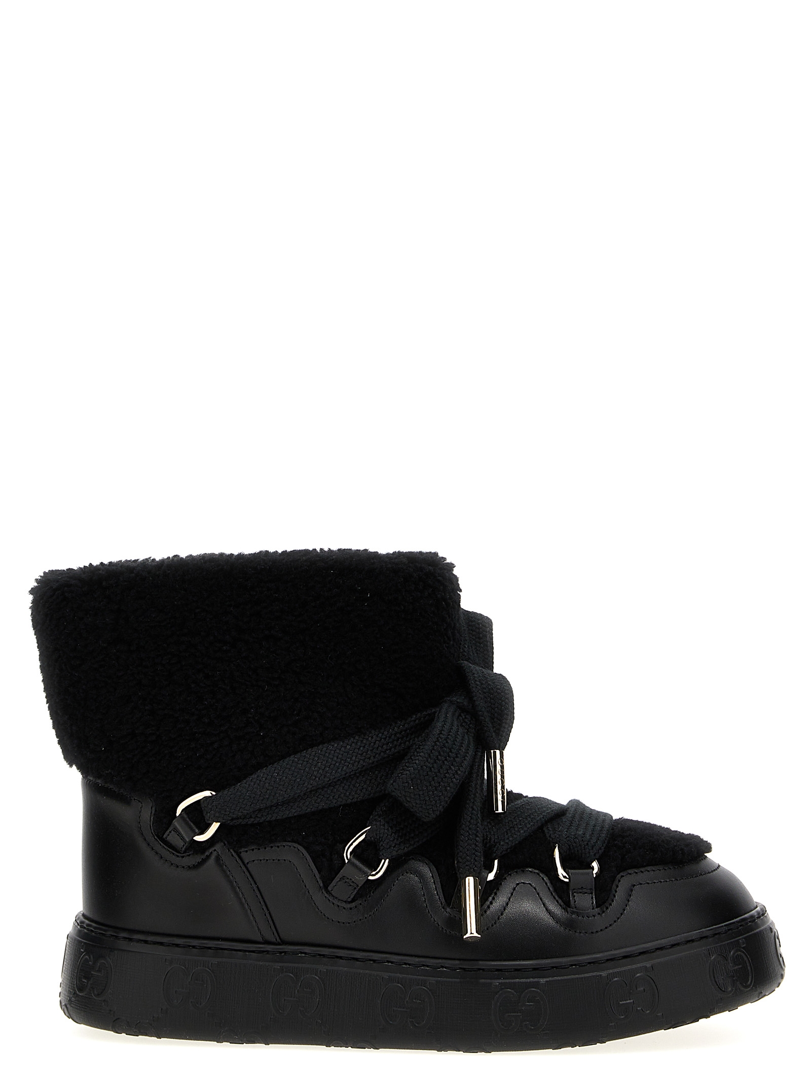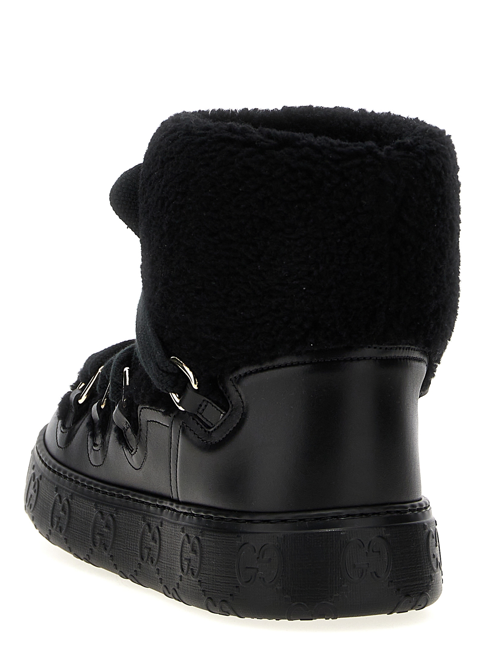 Teddy fabric ankle boots, leather details, laces, rubber sole with tone-on-tone logo pattern.