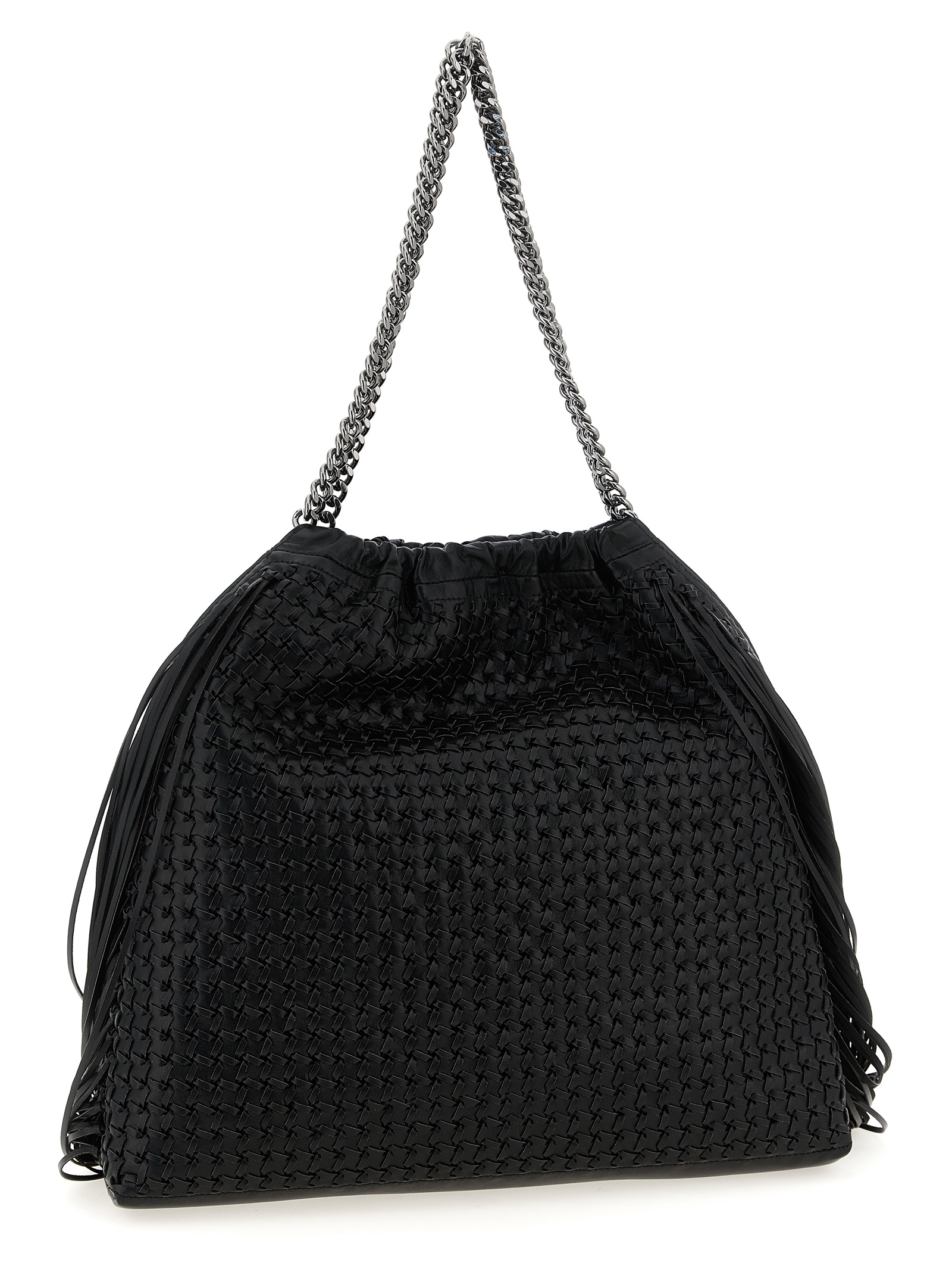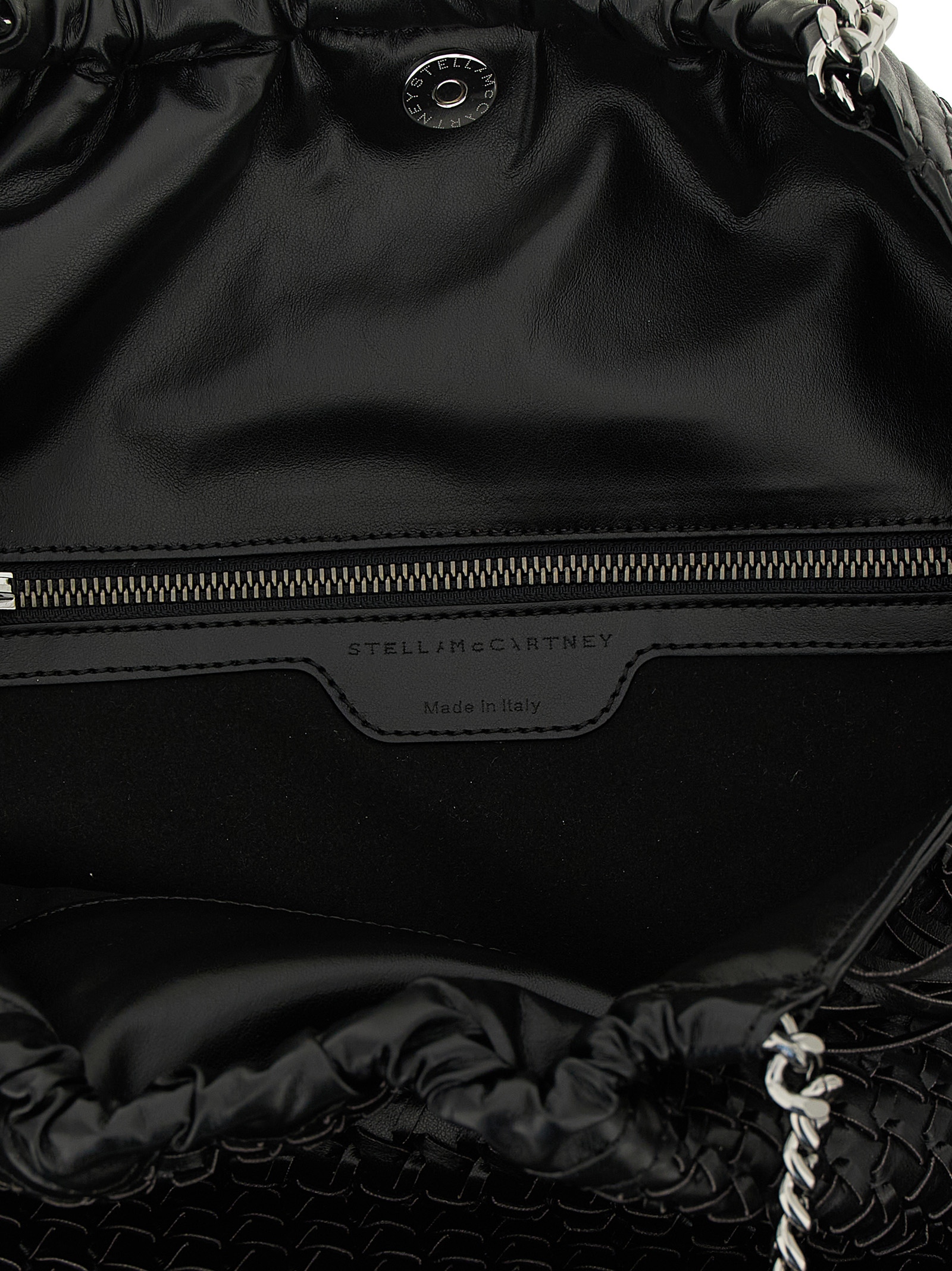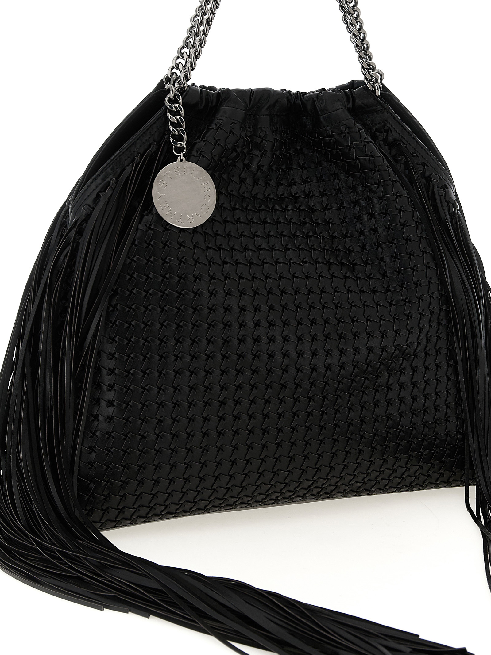 Средняя сумка через плечо «Falabella» из ткани с эффектом плетеной веганской кожи, боковые бахромы в тон, двойная фиксированная ручка из нержавеющей стали Airlite с алмазной огранкой, внутренняя магнитная застежка, мятая верхняя часть, медальон с выгравированным логотипом, подкладка, один внутренний карман. ЭКОЛОГИЧНОСТЬ: Изделие изготовлено без использования кожи, в соответствии с принципами этичного производства без жестокости по отношению к животным.Характеристики товара