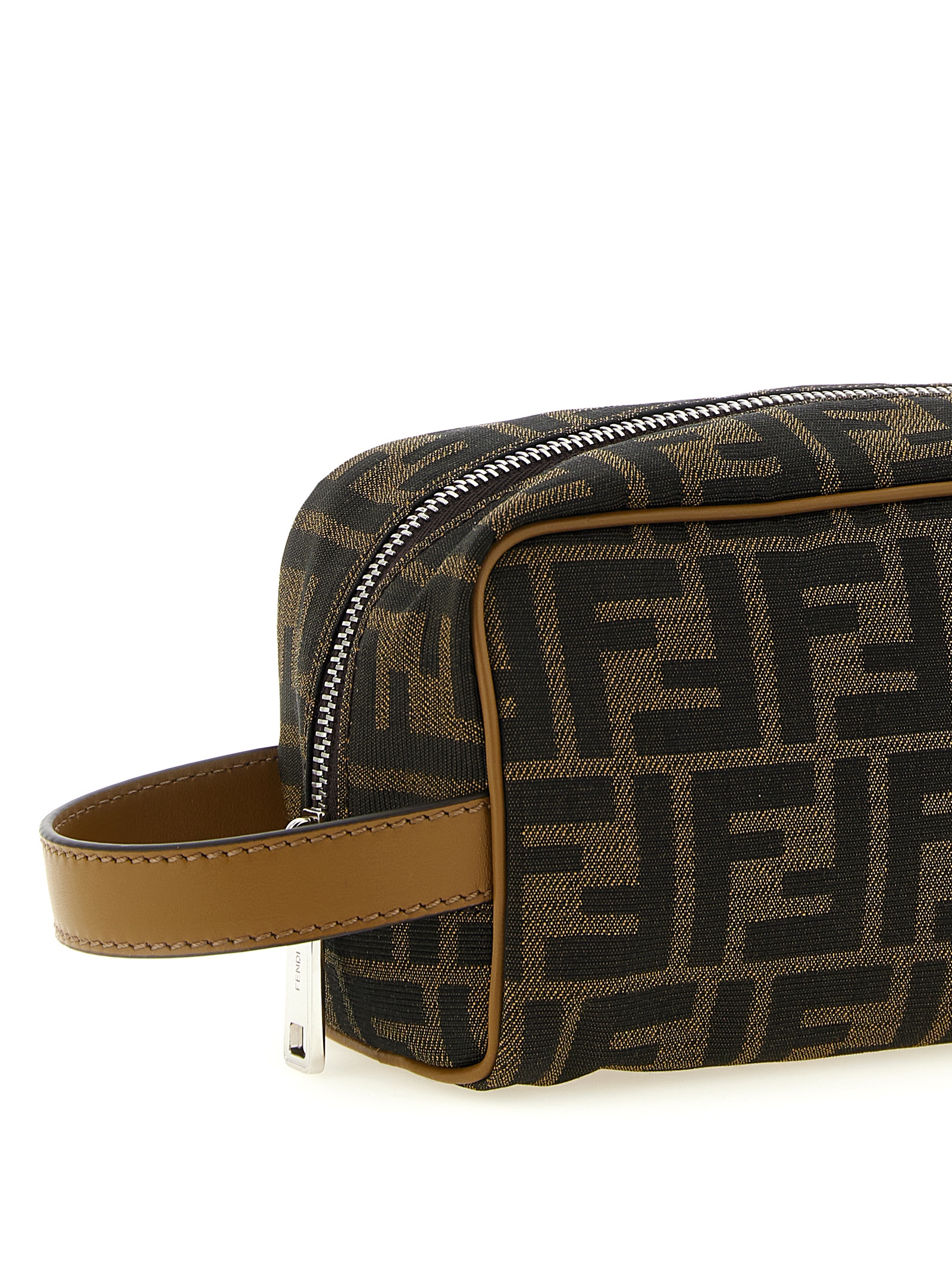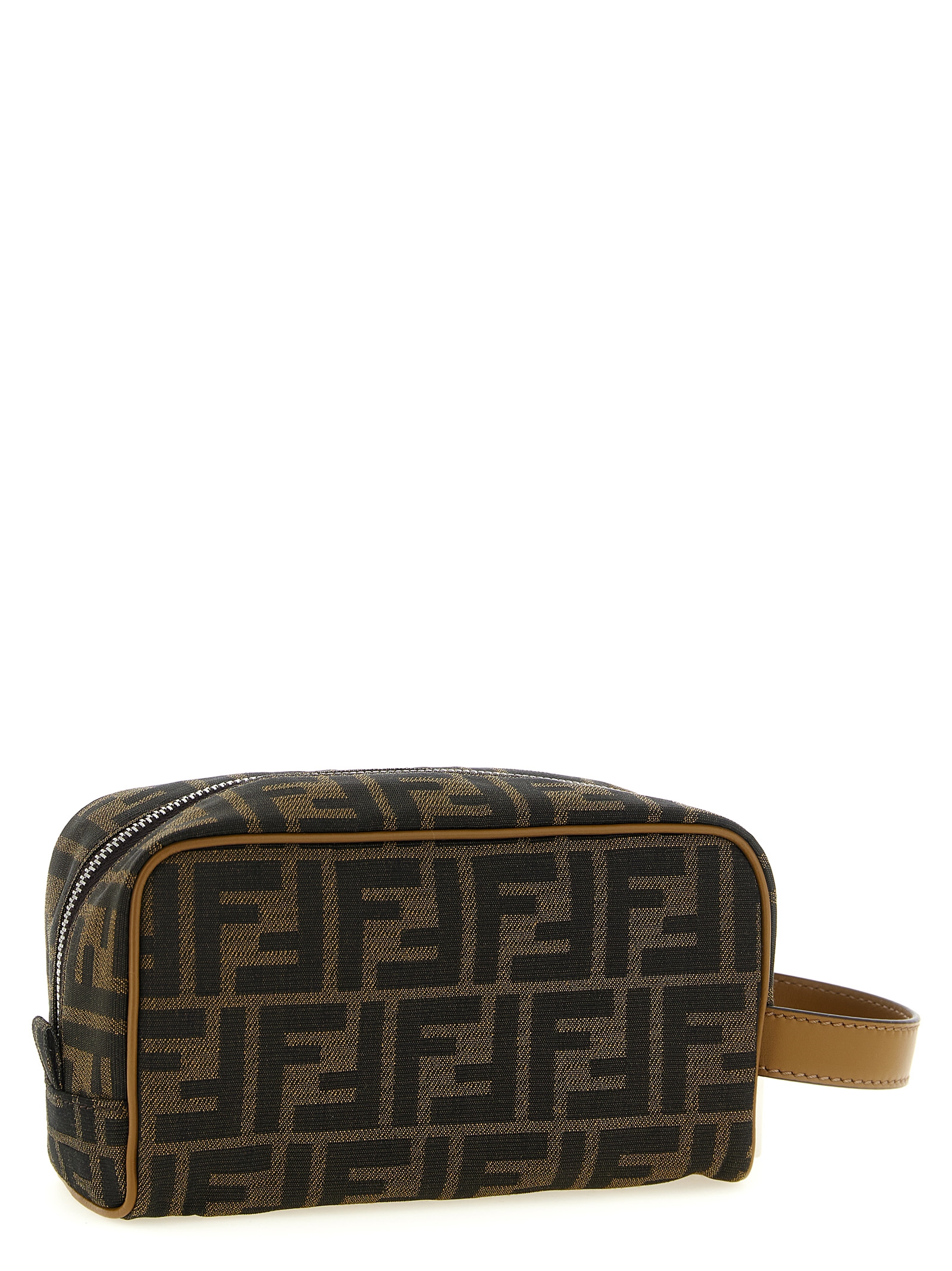 Small fabric 'FF' beauty bag with all-over logo pattern, leather details and handle, and zip closure.