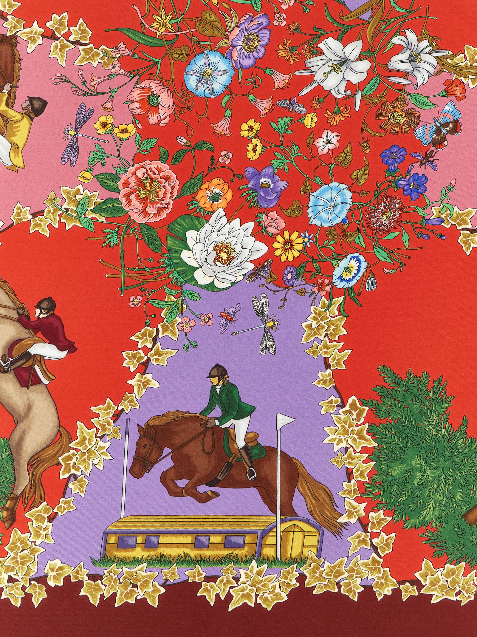 Платье-трапеция «Жокей» из шелкового твила с принтом на конную тематику и цветочными мотивами по всей поверхности.