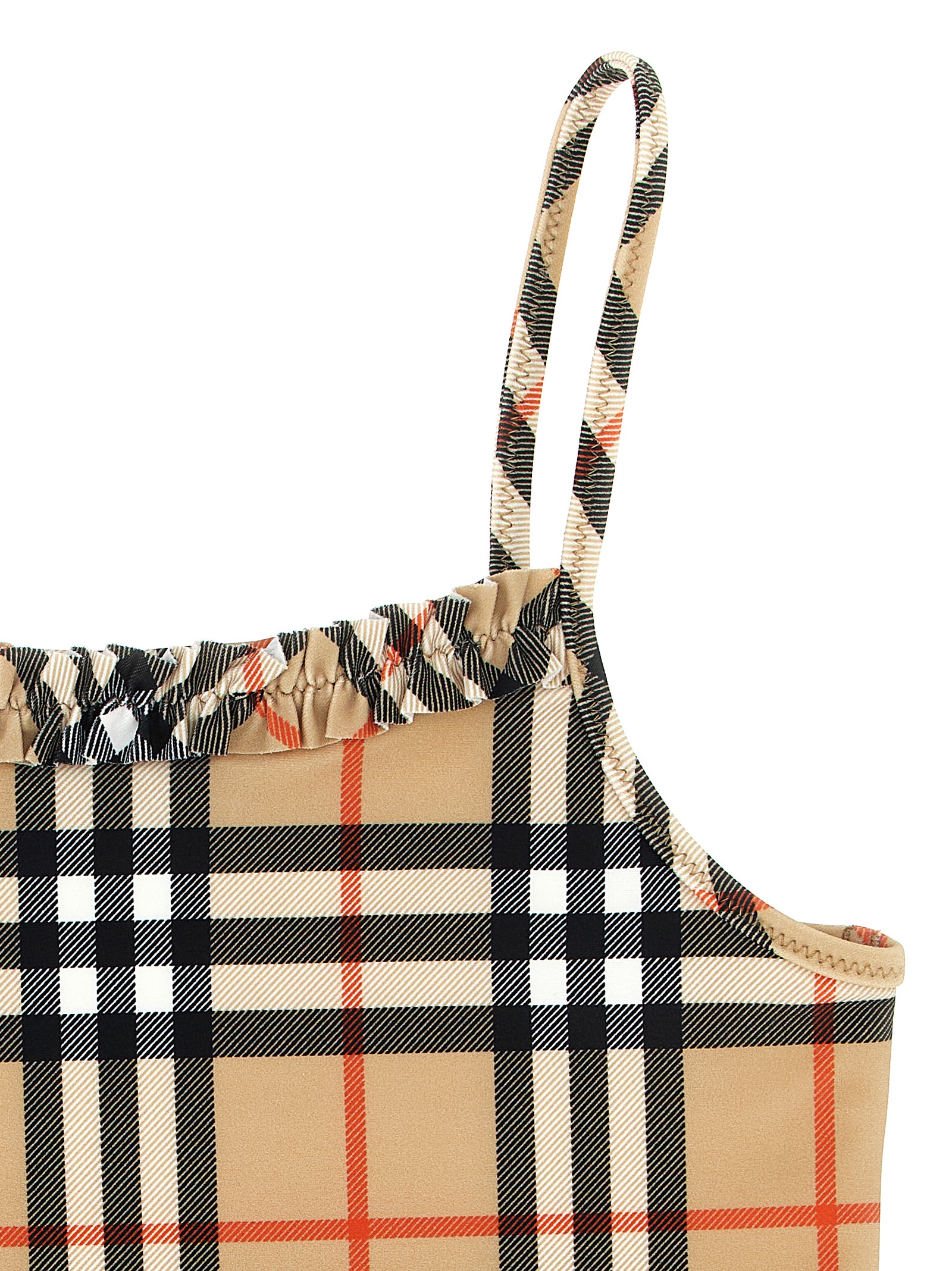 KIDS Burberry Check stretch nylon bikini Babette with ruffles consisting of a sporty top with square neckline, thin straps and classic bottoms.