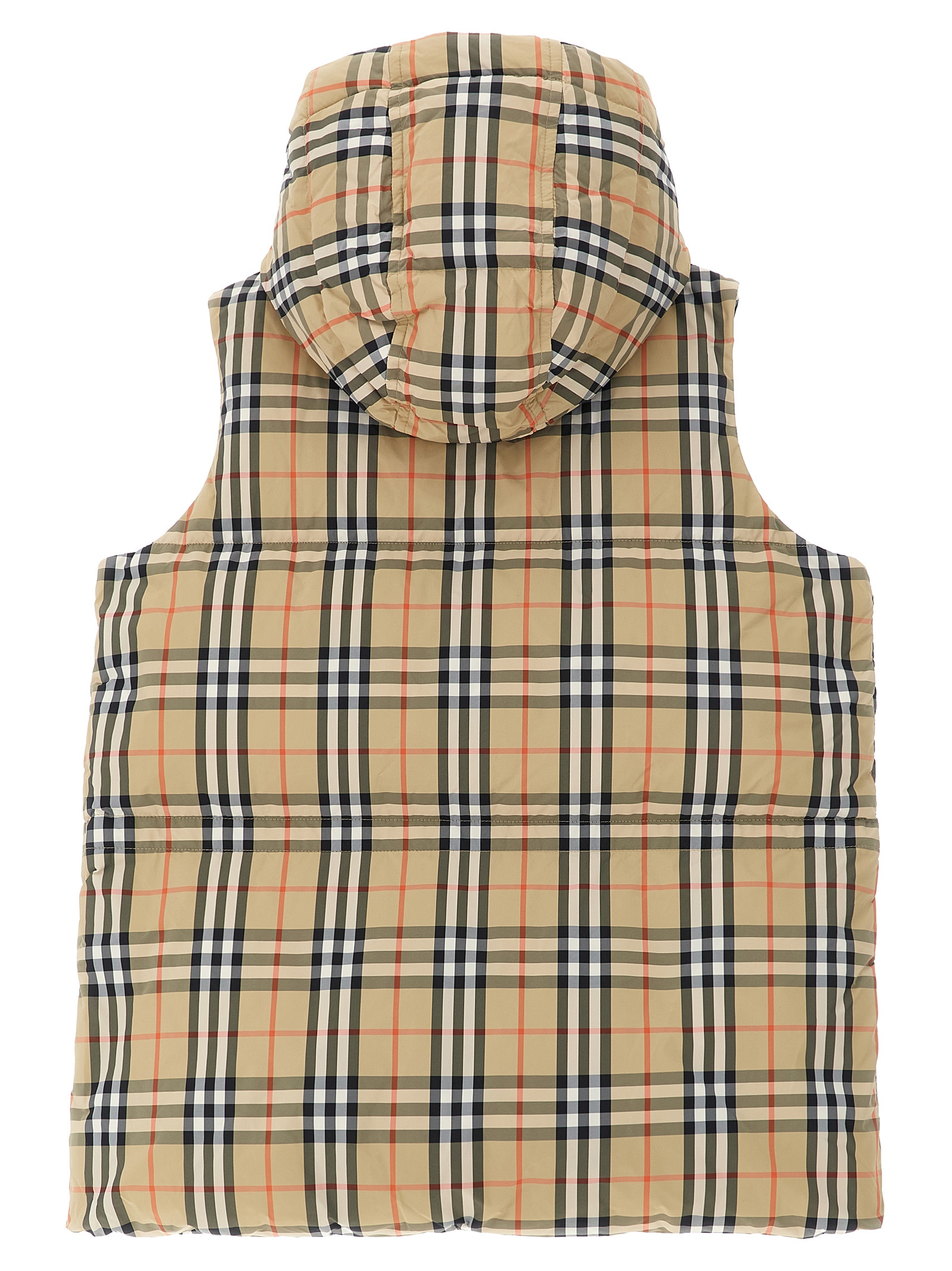 Burberry Check shiny nylon 'Franklin' vest quilted and goose down padding, hood, zip and snap button closure on the front, pockets, drawstring at the waist.