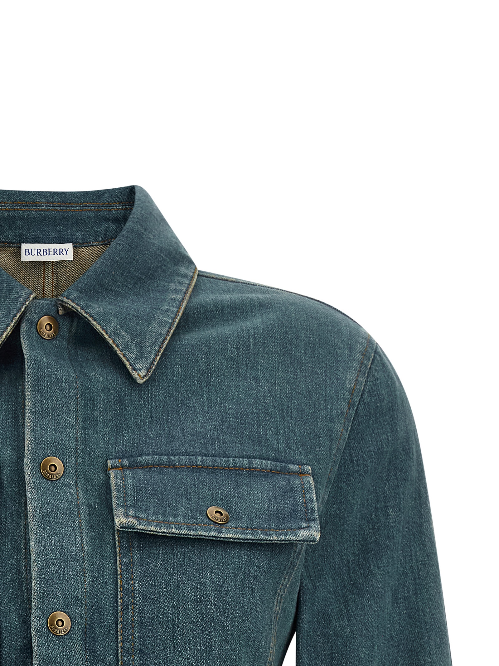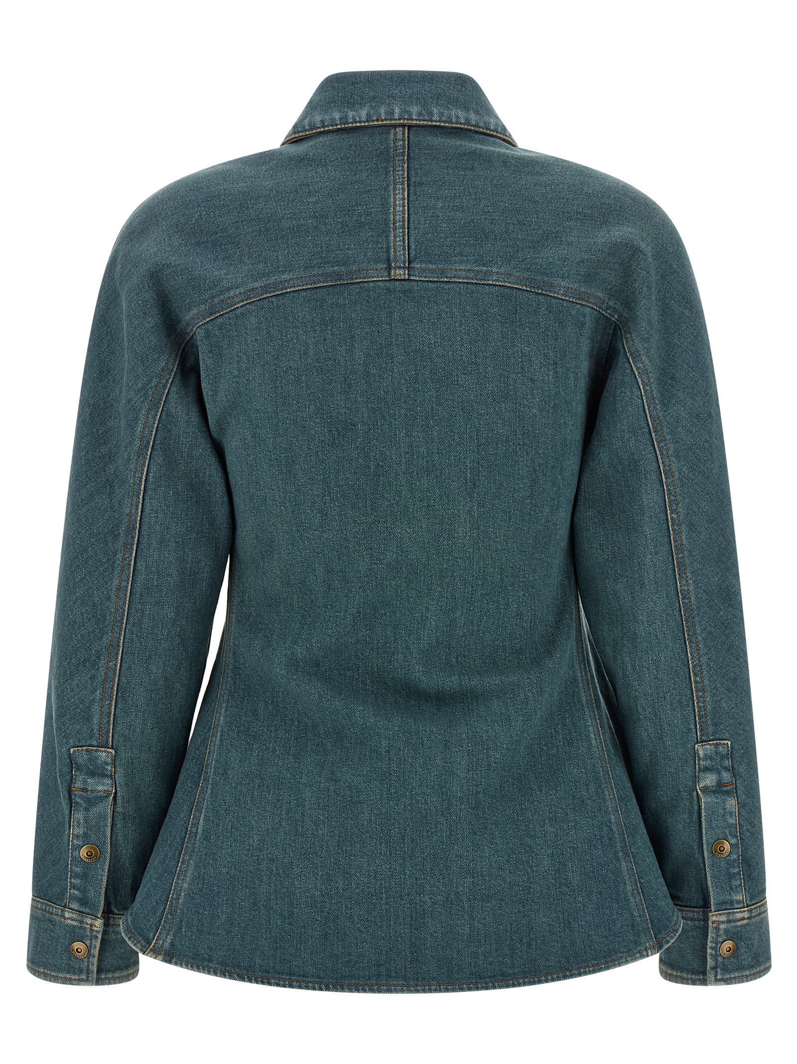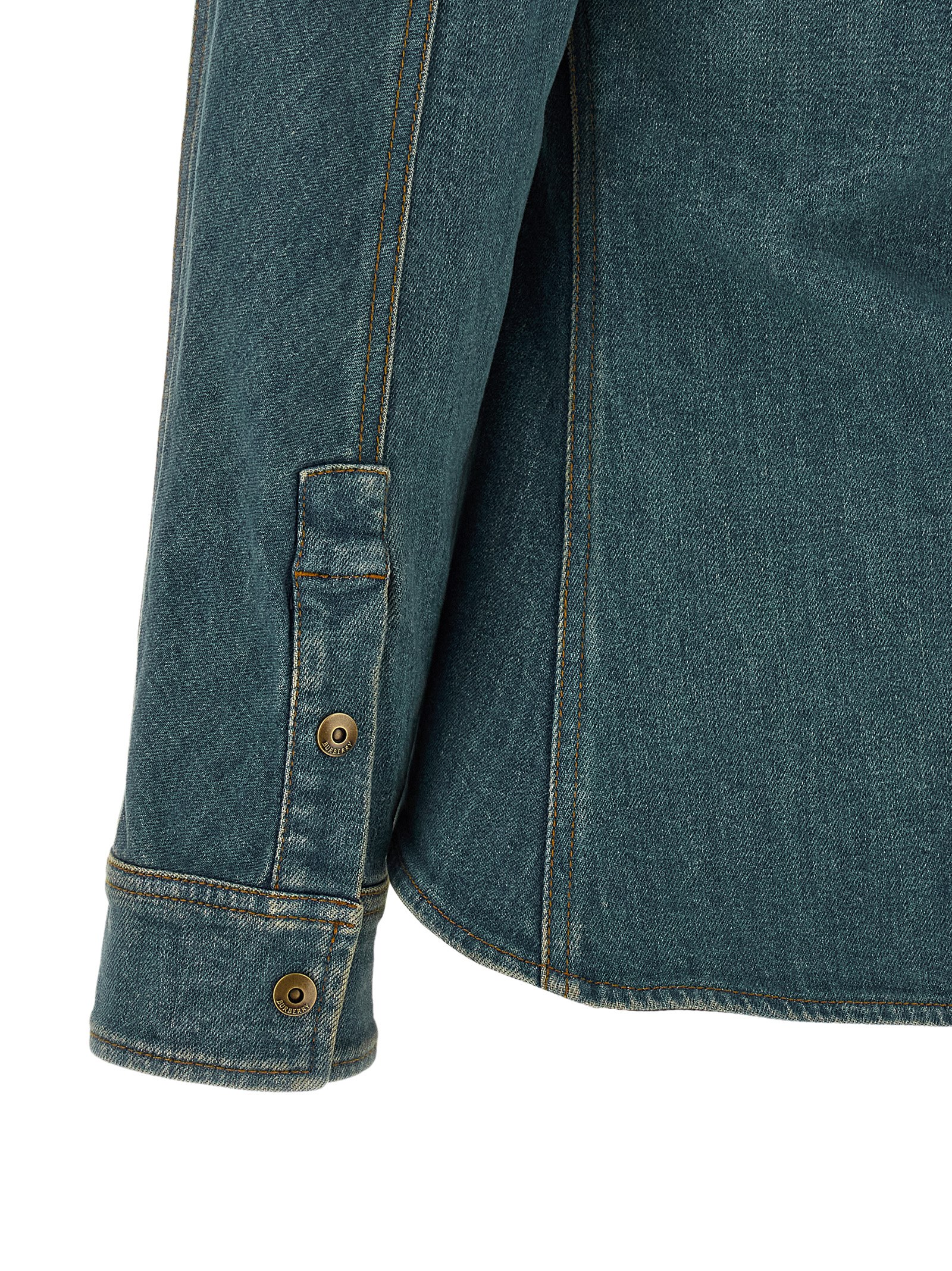 'Dakota' shirt in heavy cotton denim with contrast stitching, hourglass silhouette, pointed collar, front snap button closure, pockets, long cuffed sleeves, rounded hem.