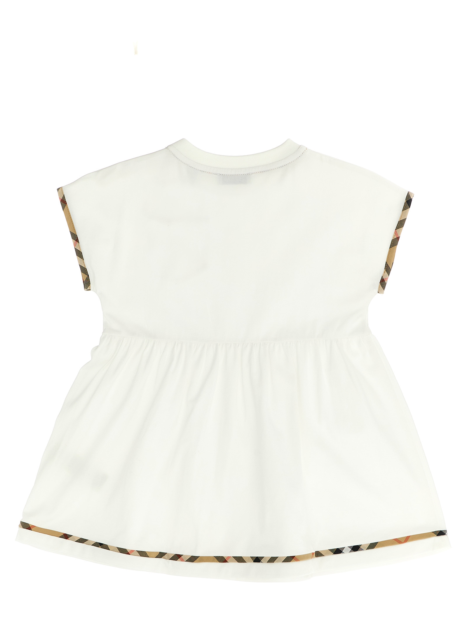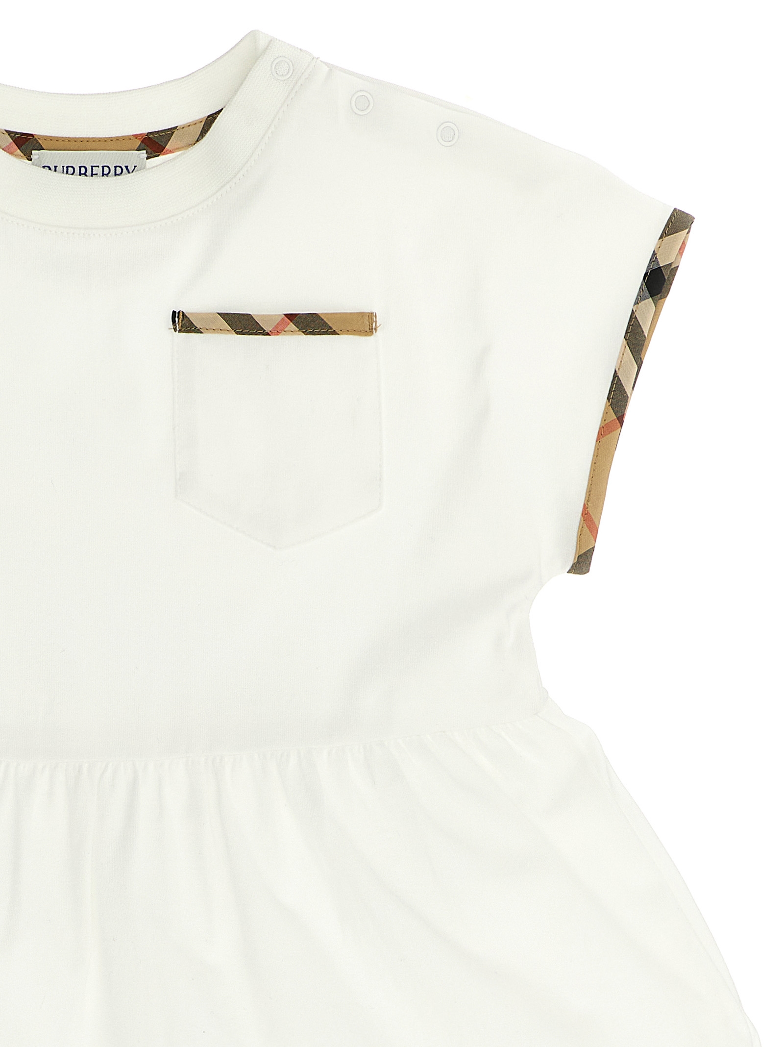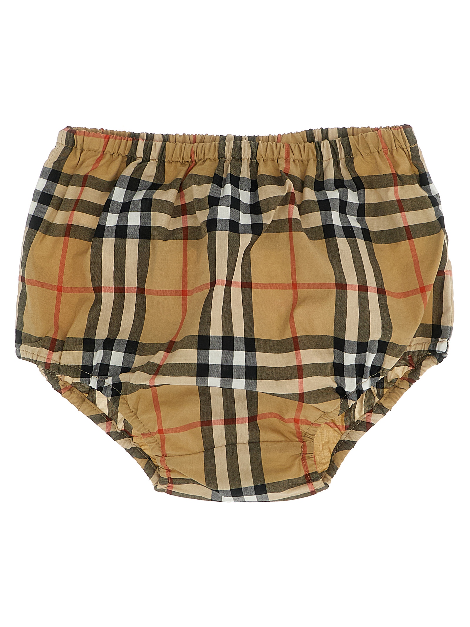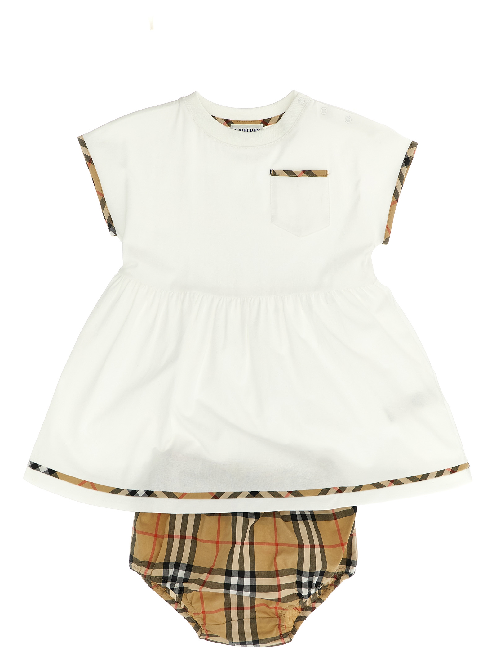 Детский костюм «Lea» состоит из платья из хлопкового трикотажа с клетчатым узором Burberry, круглым вырезом, нагрудным карманом, короткими рукавами, кнопками на левом плече и хлопковых шорт с клетчатым узором Burberry, модели «блумер», с эластичным поясом.Характеристики товара