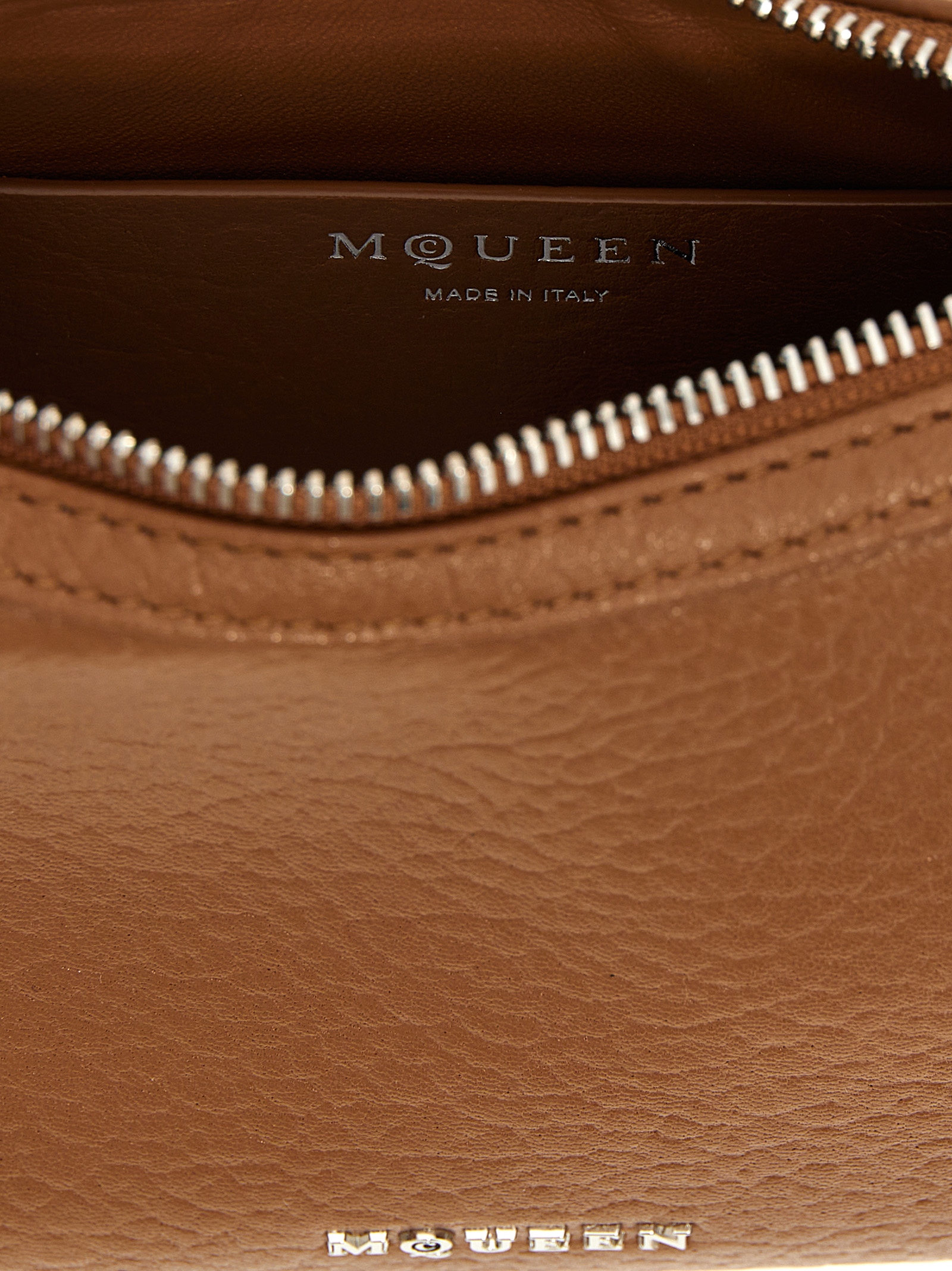 'McQueen T-bar Mini' handbag in grainy leather, foldable chain handle with T-hook, zip closure, front metal logo.