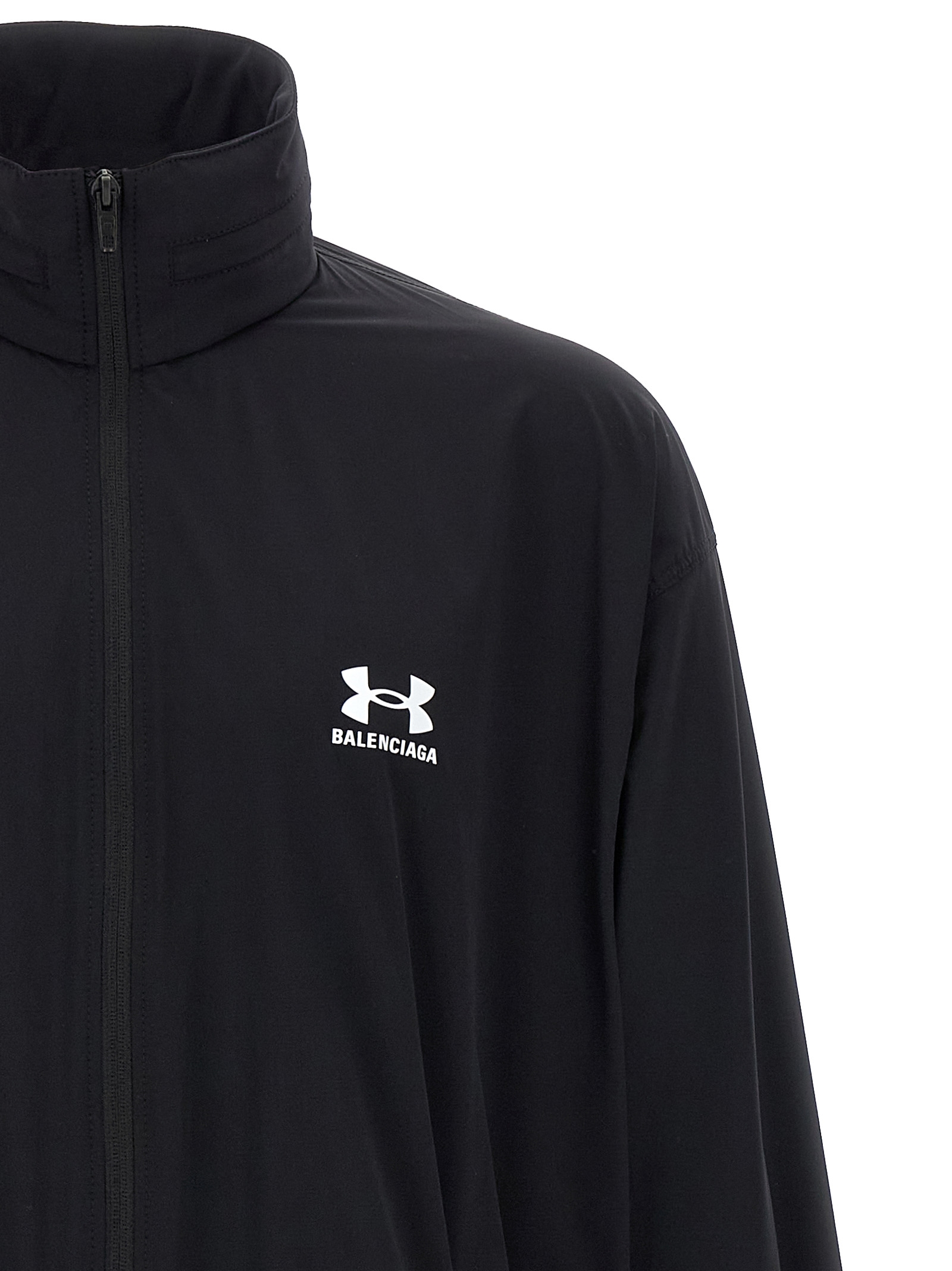 Under Armour® windproof jacket in technical fabric with front and back logo print, zip closure, high neck with removable hood, elastic hem, long sleeves with elastic cuffs.