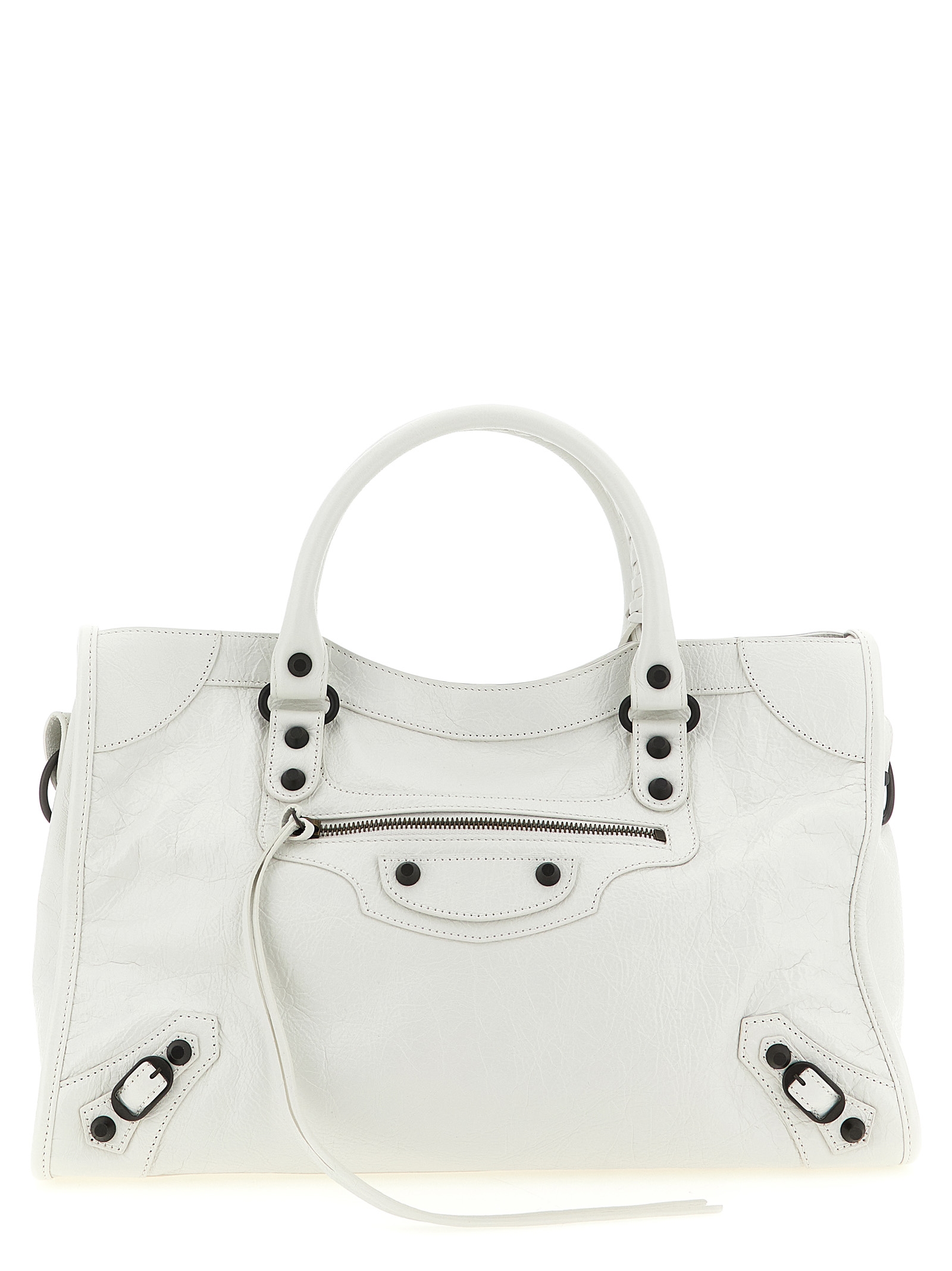 Сумка Arena Storico 'Le City M' из овечьей кожи с латунными заклепками, двумя фиксированными ручками, застежкой-молнией сверху, передним карманом на молнии, подкладкой из хлопкового холста, регулируемым и съемным плечевым ремнем.