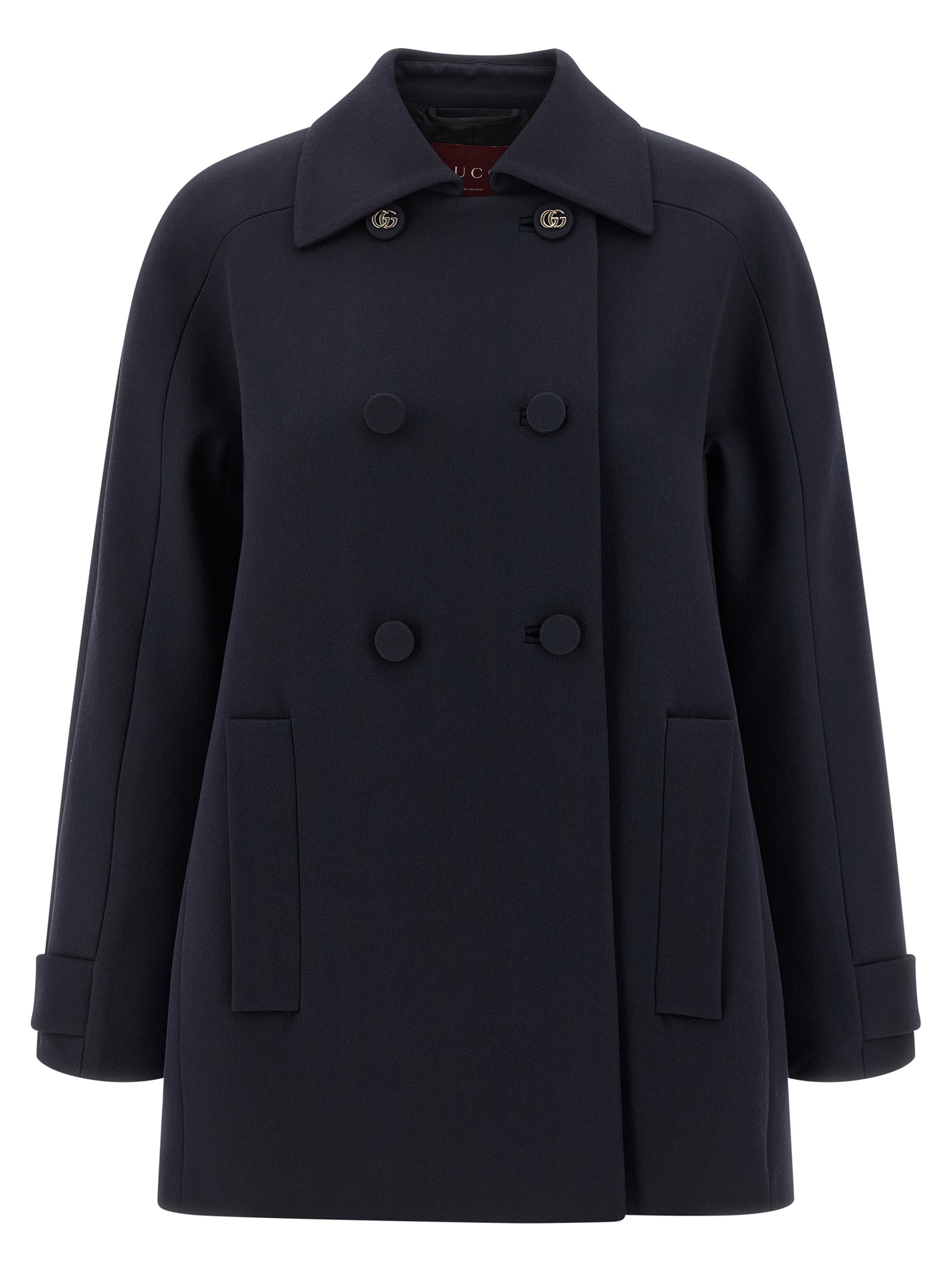 Wool coat, slightly padded monogram cupro lining, trapeze silhouette, double-breasted style with front button closure, shirt collar, long cuffed sleeves.