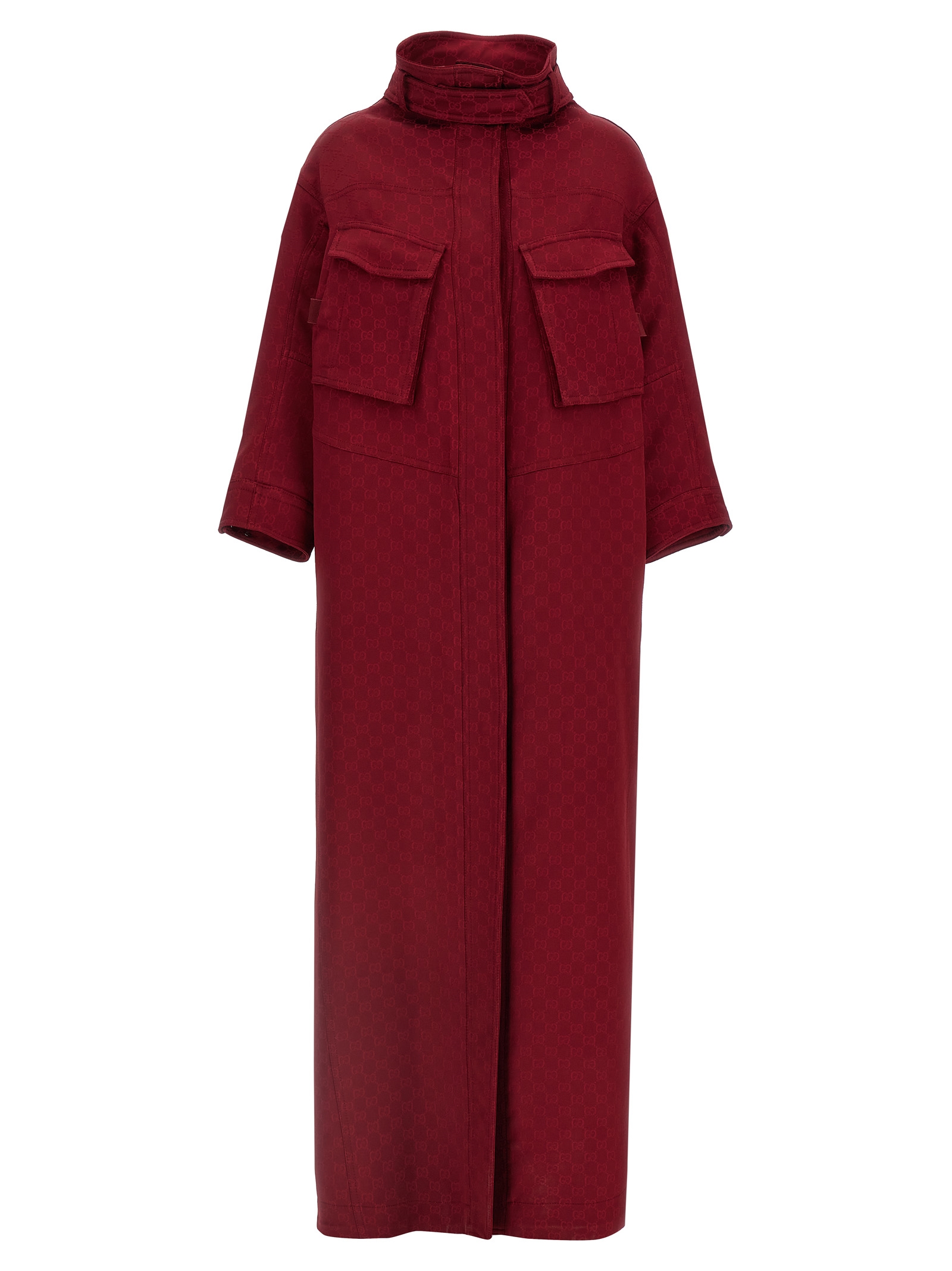 Long coat in GG jacquard 'Gucci Rosso Ancora' fabric, viscose lining, high neck, zip closure and front snap buttons, drawstring at the waist, long sleeves with cuffs and dropped shoulder, back split.