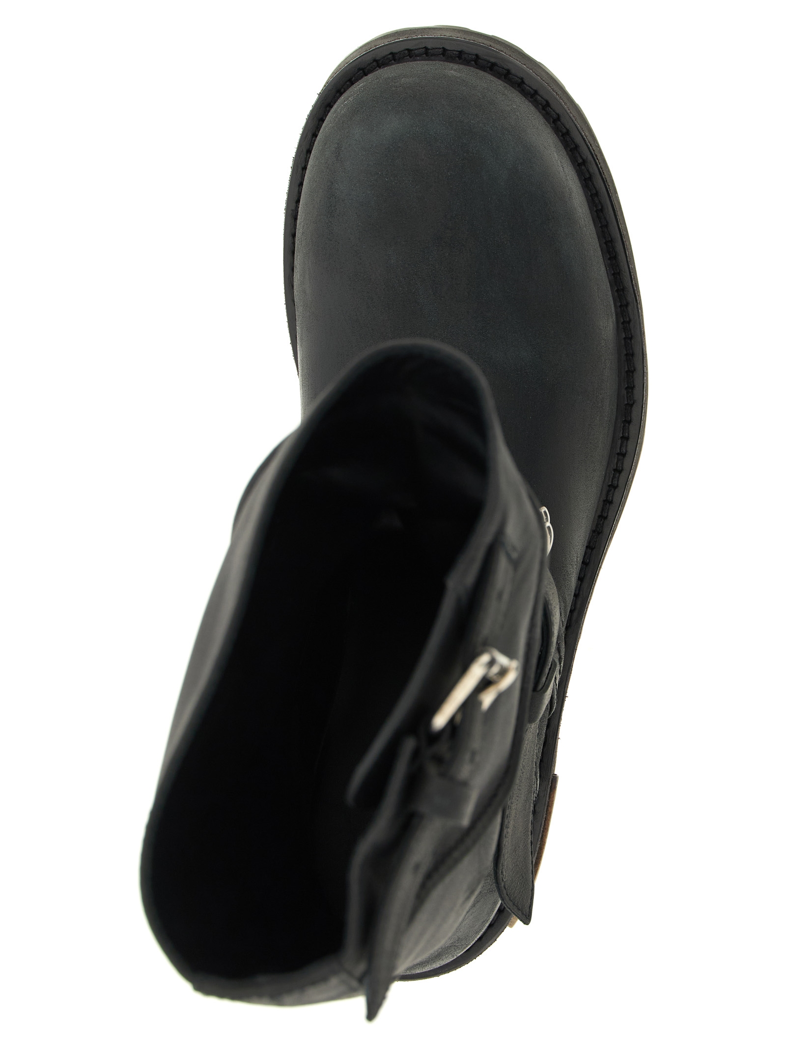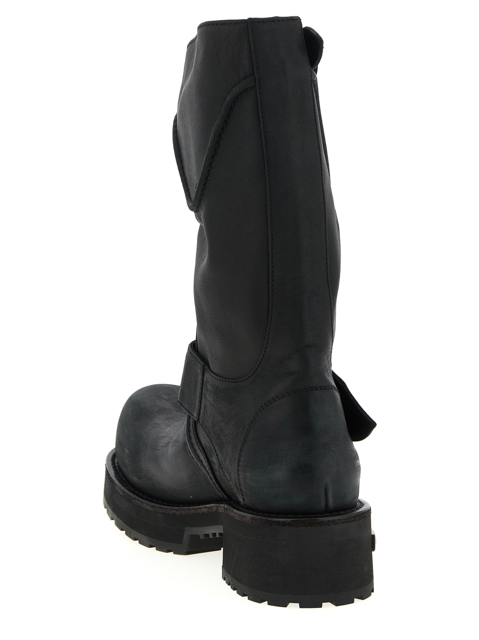 'Venom' used-effect leather boots, ultra-rounded toe, straps with adjustable buckles, embossed side logo, thick notched rubber sole.