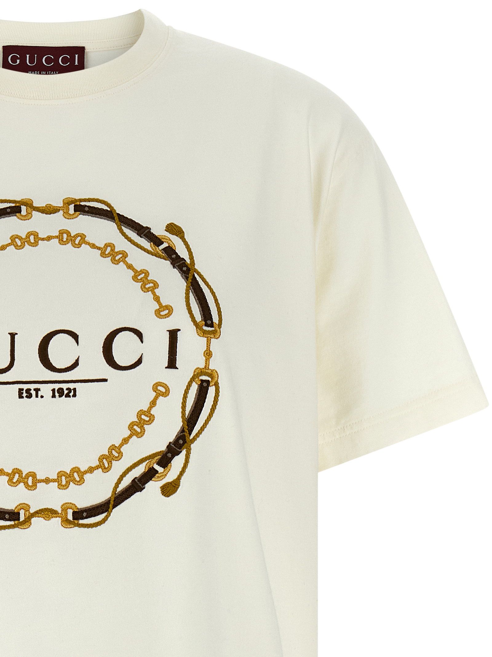 Футболка из хлопкового трикотажа средней плотности, с вышитой надписью «Briglie Gucci Est 1921» на передней части, круглый вырез, короткие рукава со спущенными плечами.Характеристики товара