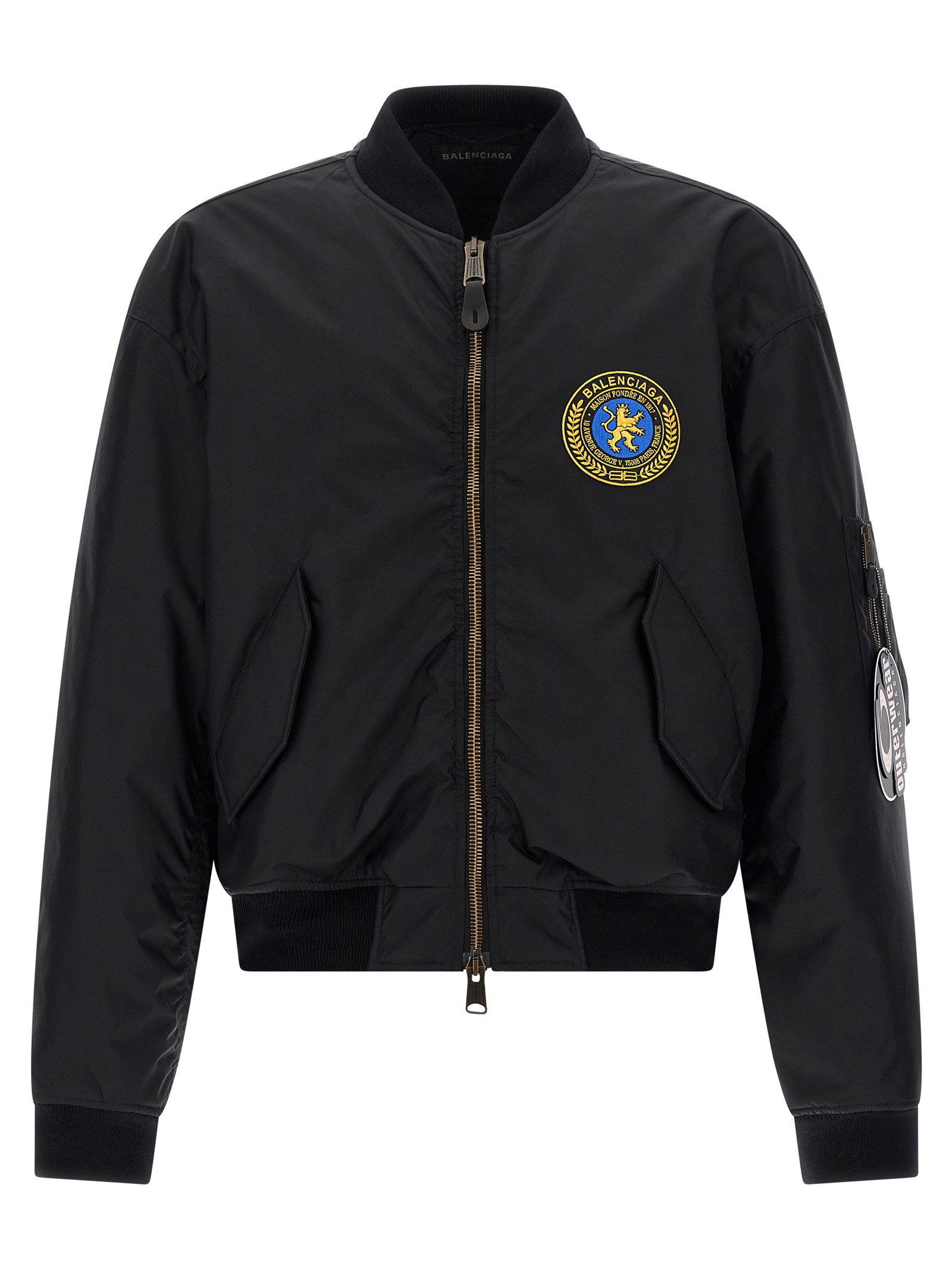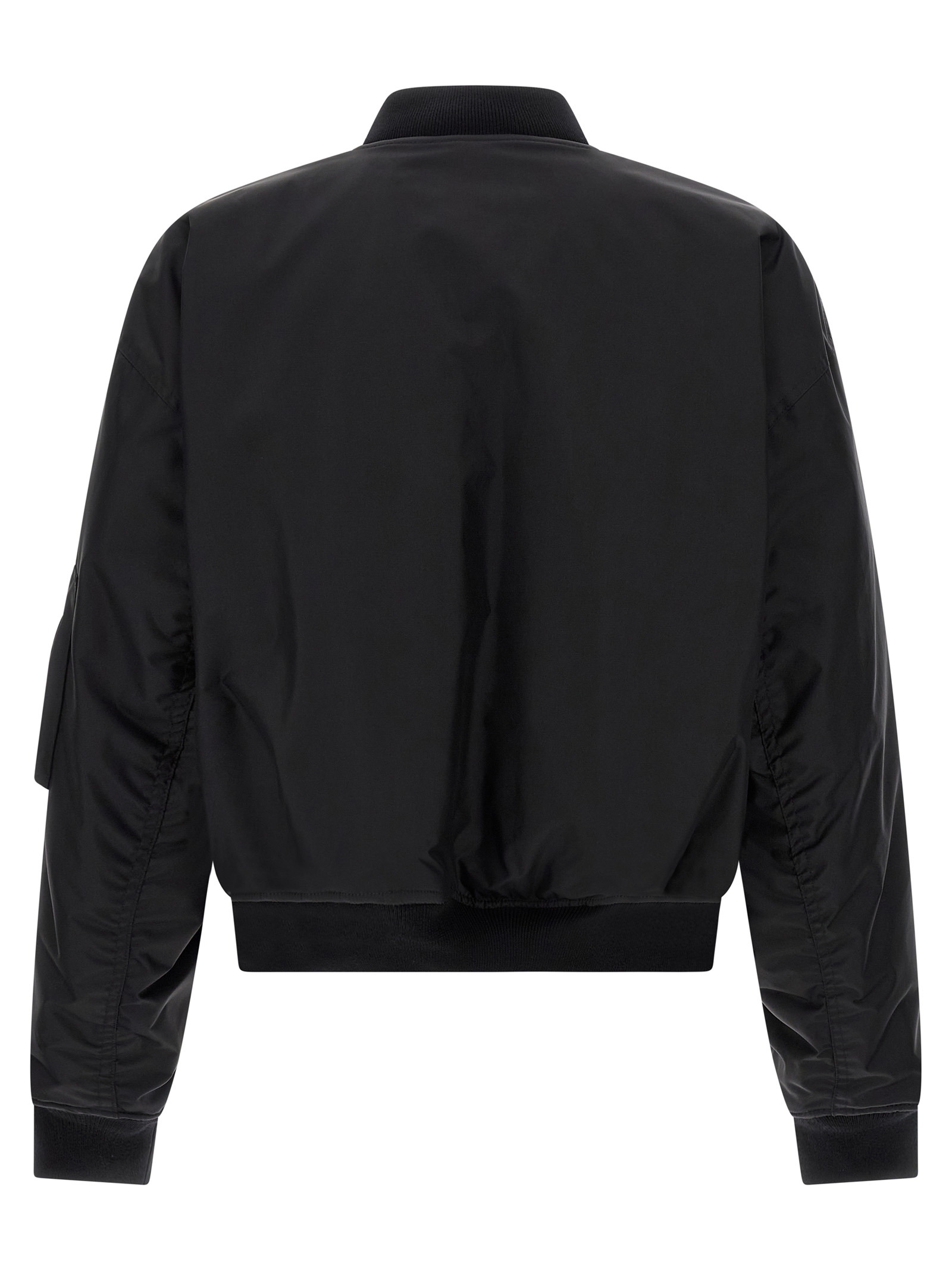 'Bomber' jacket in technical fabric with stretch ribbed knit details, patch and front zip closure, pockets, long wide sleeves with dropped shoulders, cuffs and keyring with stickers.
