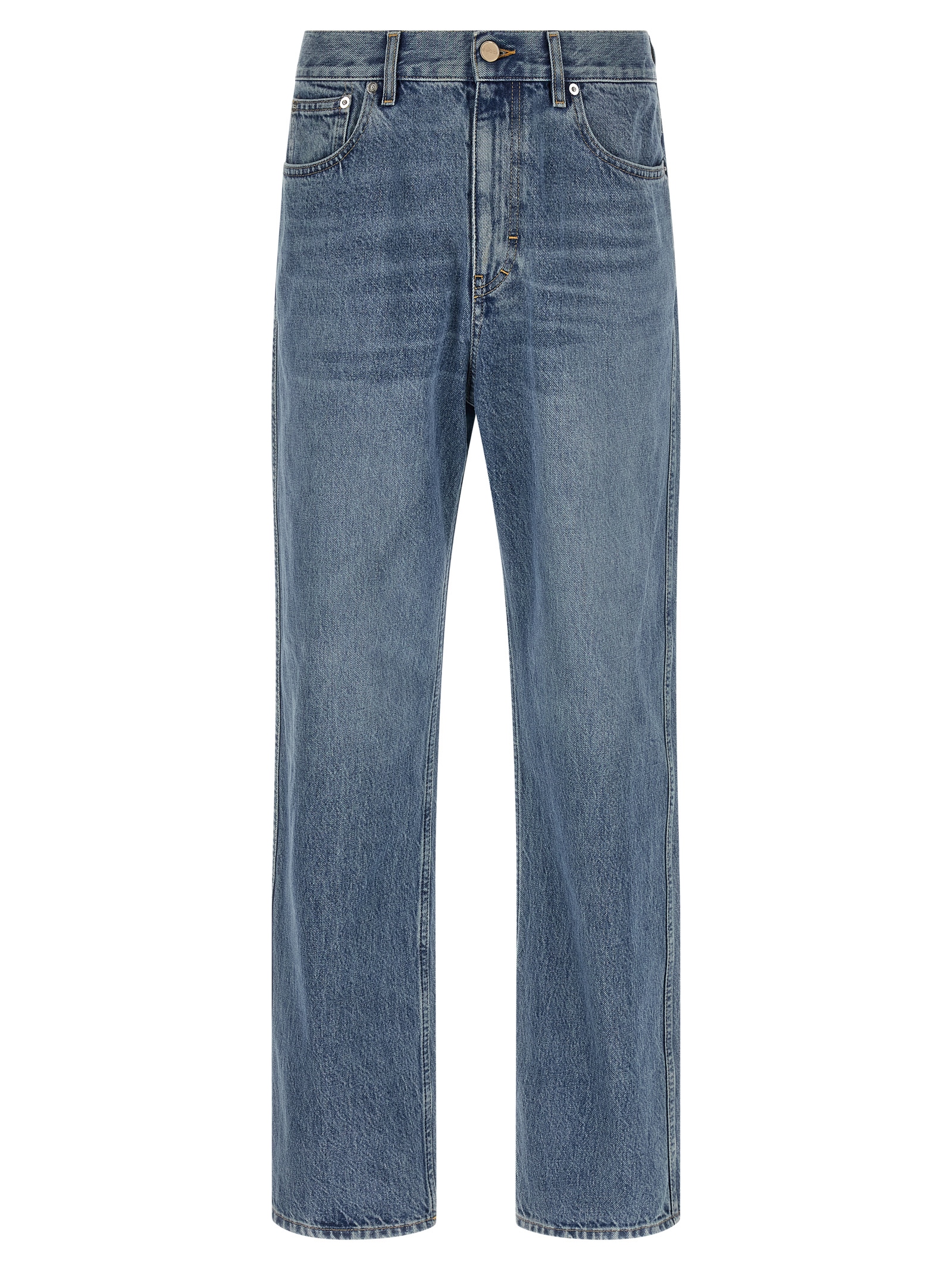 Délavé effect cotton denim jeans, straight leg, contrast stitching, zip and front button closure, five pockets, 'Gucci Rosso Ancora' naplak logo tag.