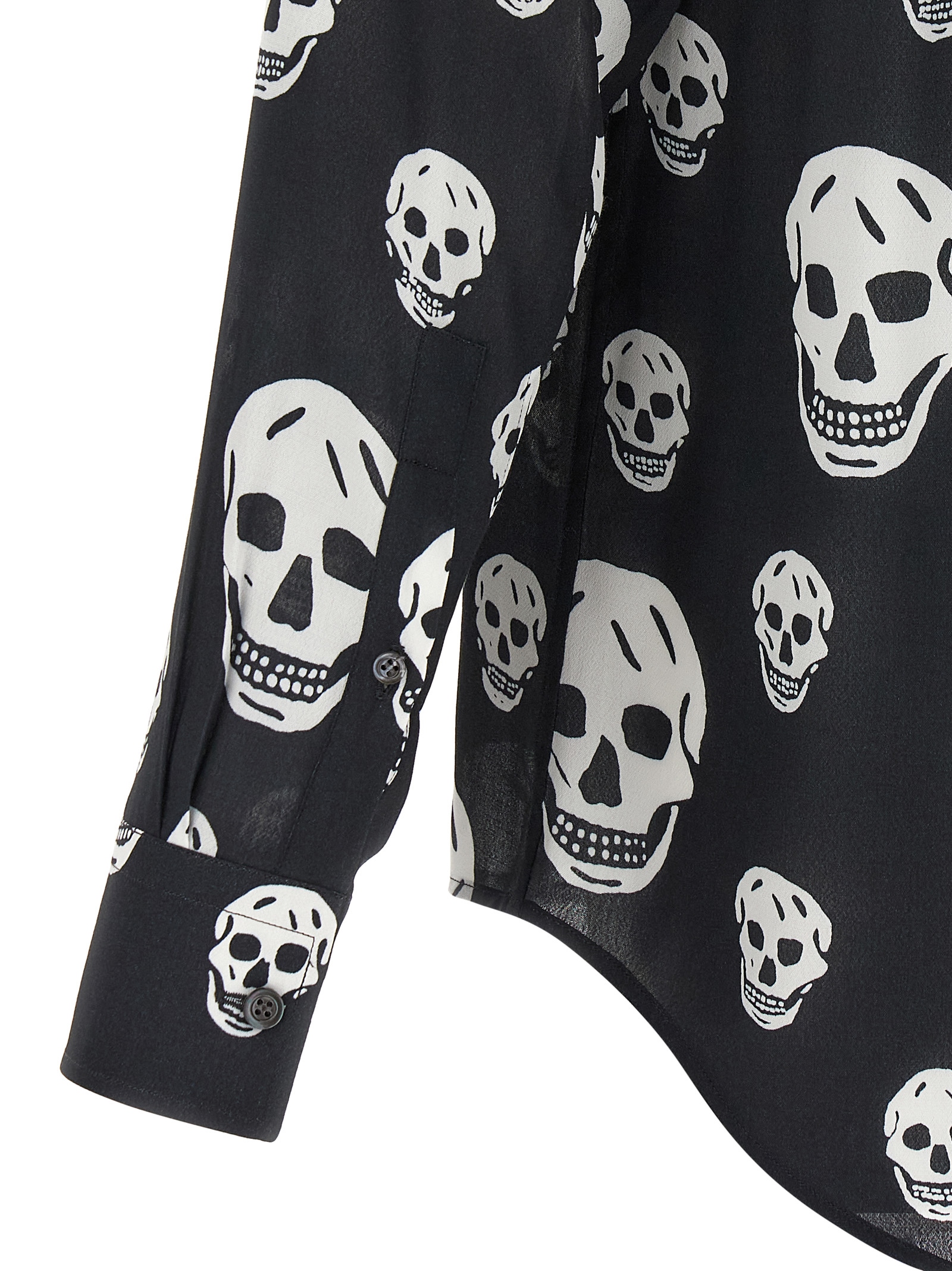 All-over 'Skull' print crepe de chine and viscose shirt, front button closure, long cuffed sleeves, and asymmetrical hem.