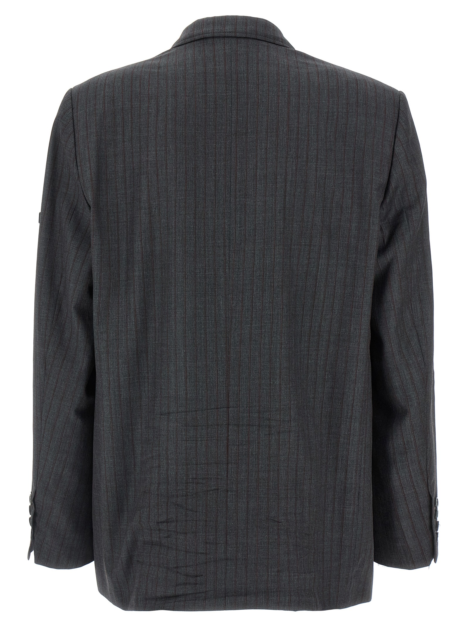 Pinstripe wool blazer with peak lapel neckline, 2 buttons front closure, wrinkled effect, padded shoulders, long sleeves with cuffs