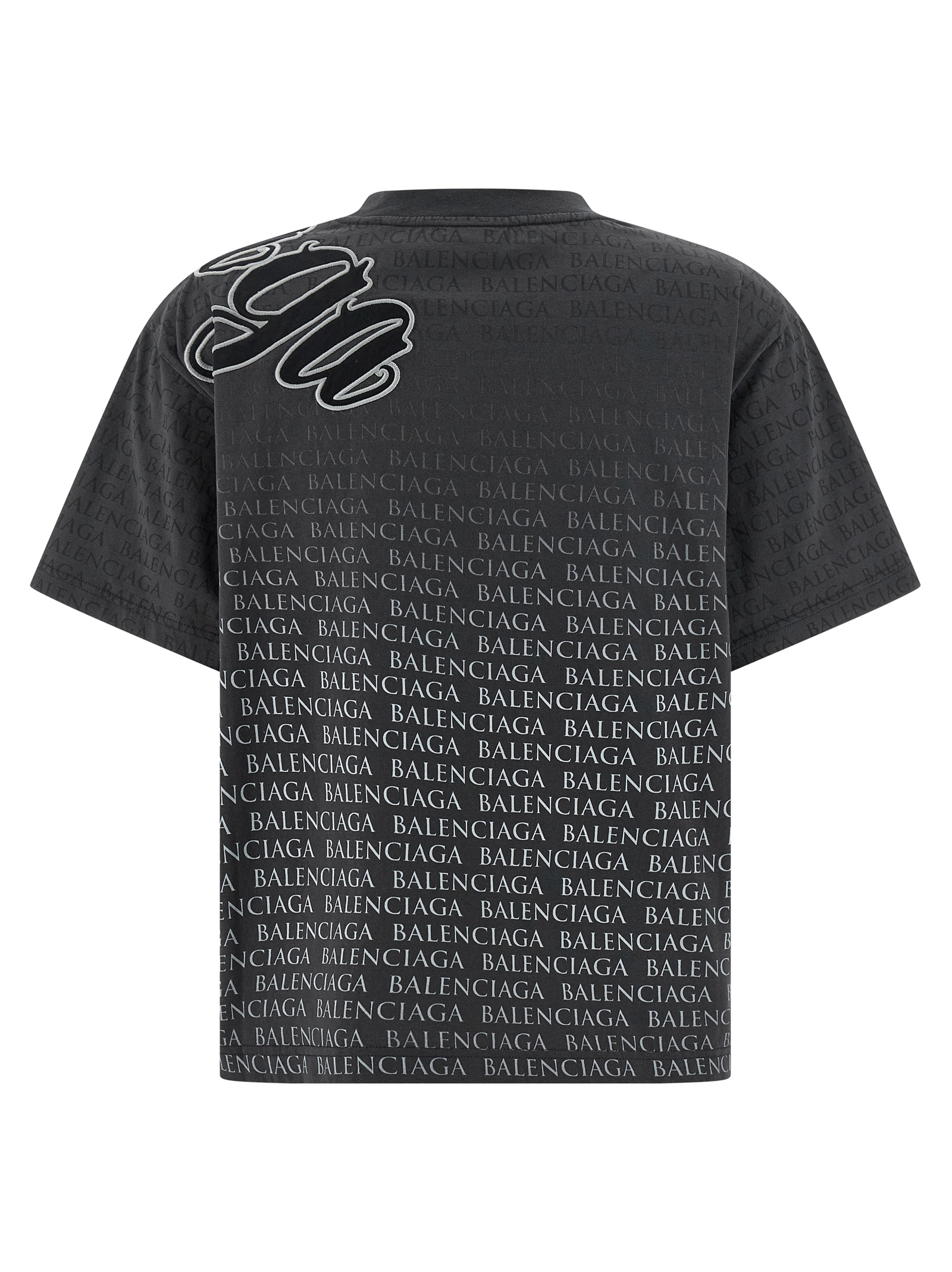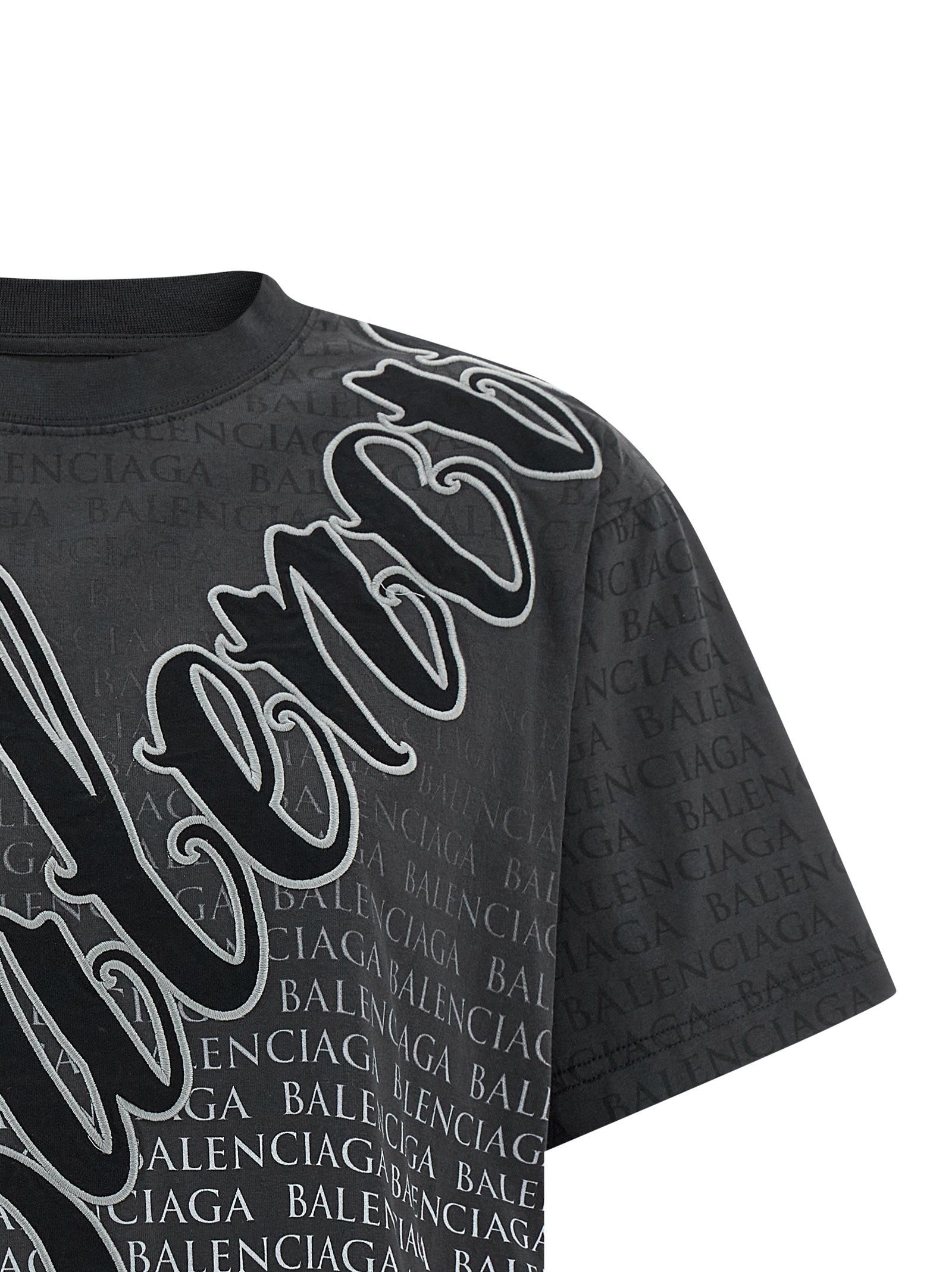 Washed-effect dry jersey t-shirt with all-over gradient logo print, 'Cursive' embroidery on the front and back, short sleeves with dropped shoulders.