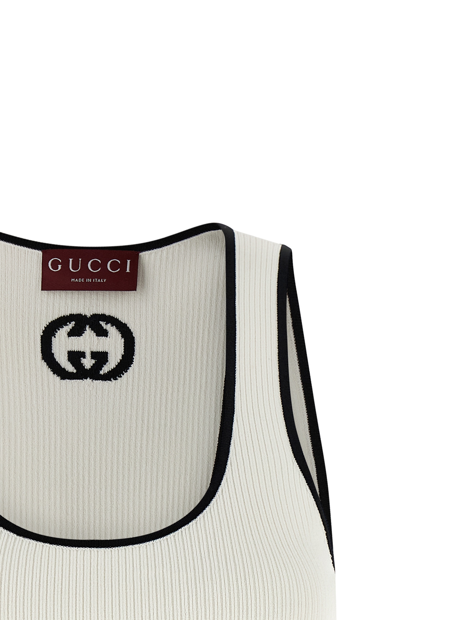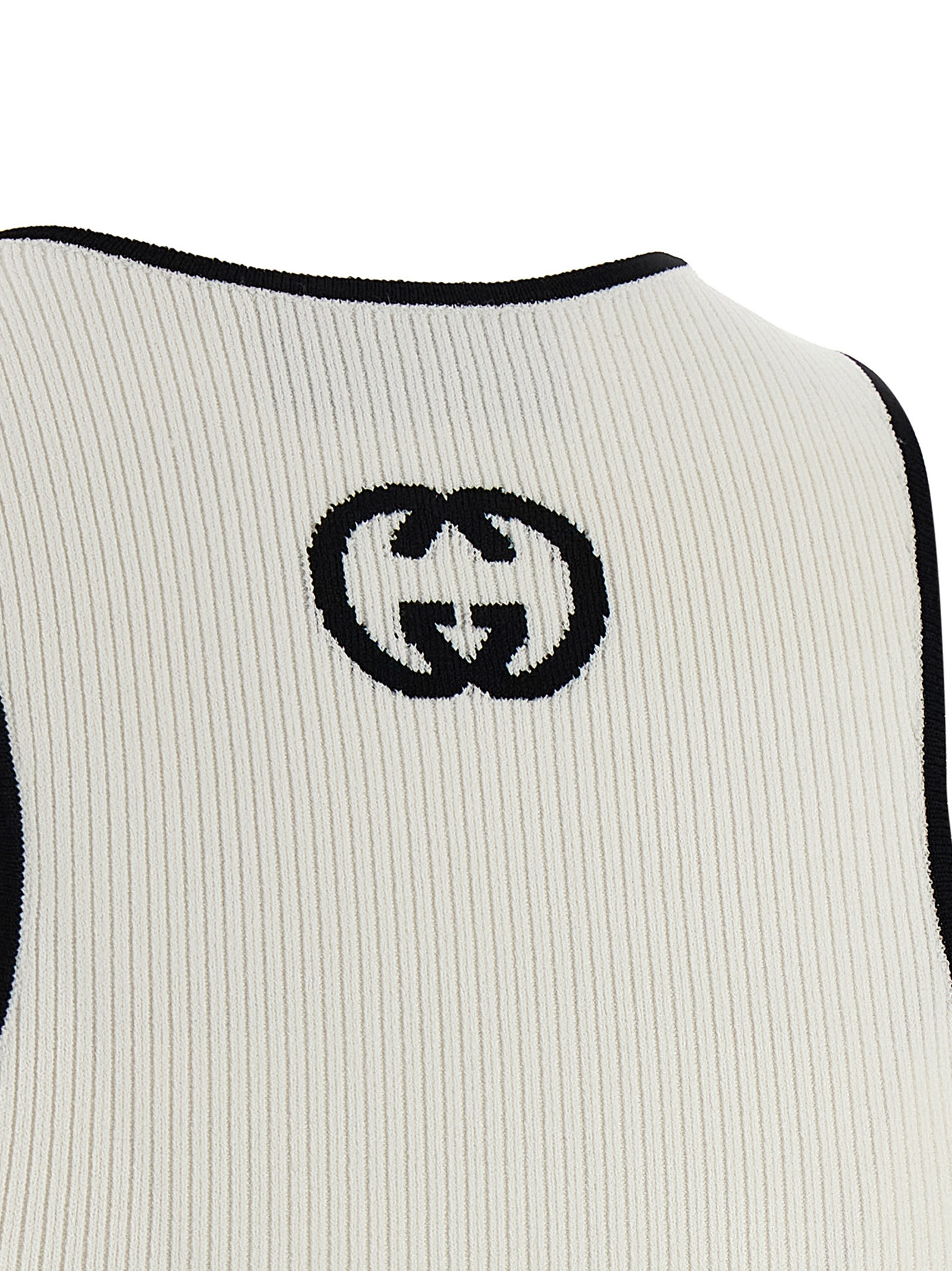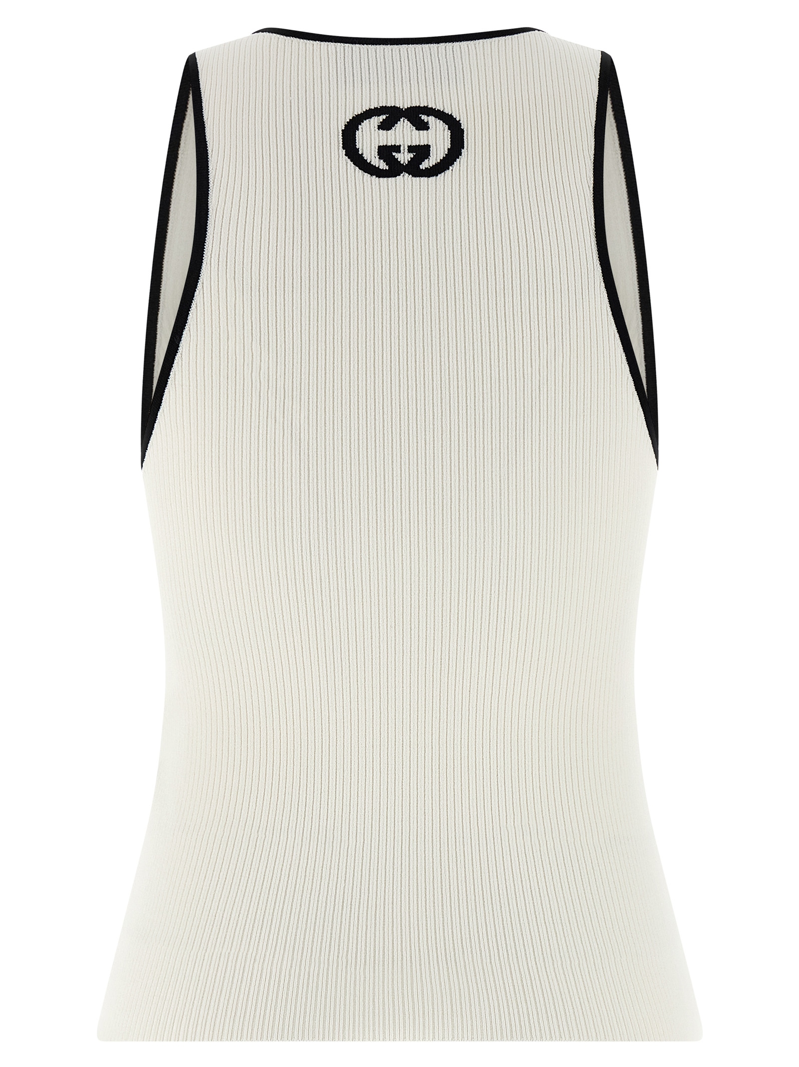 Топ из ребристой вискозы с контрастными деталями, контрастная интарсия «Incrocio GG» на спине, широкий круглый вырез горловины спереди.Характеристики товара