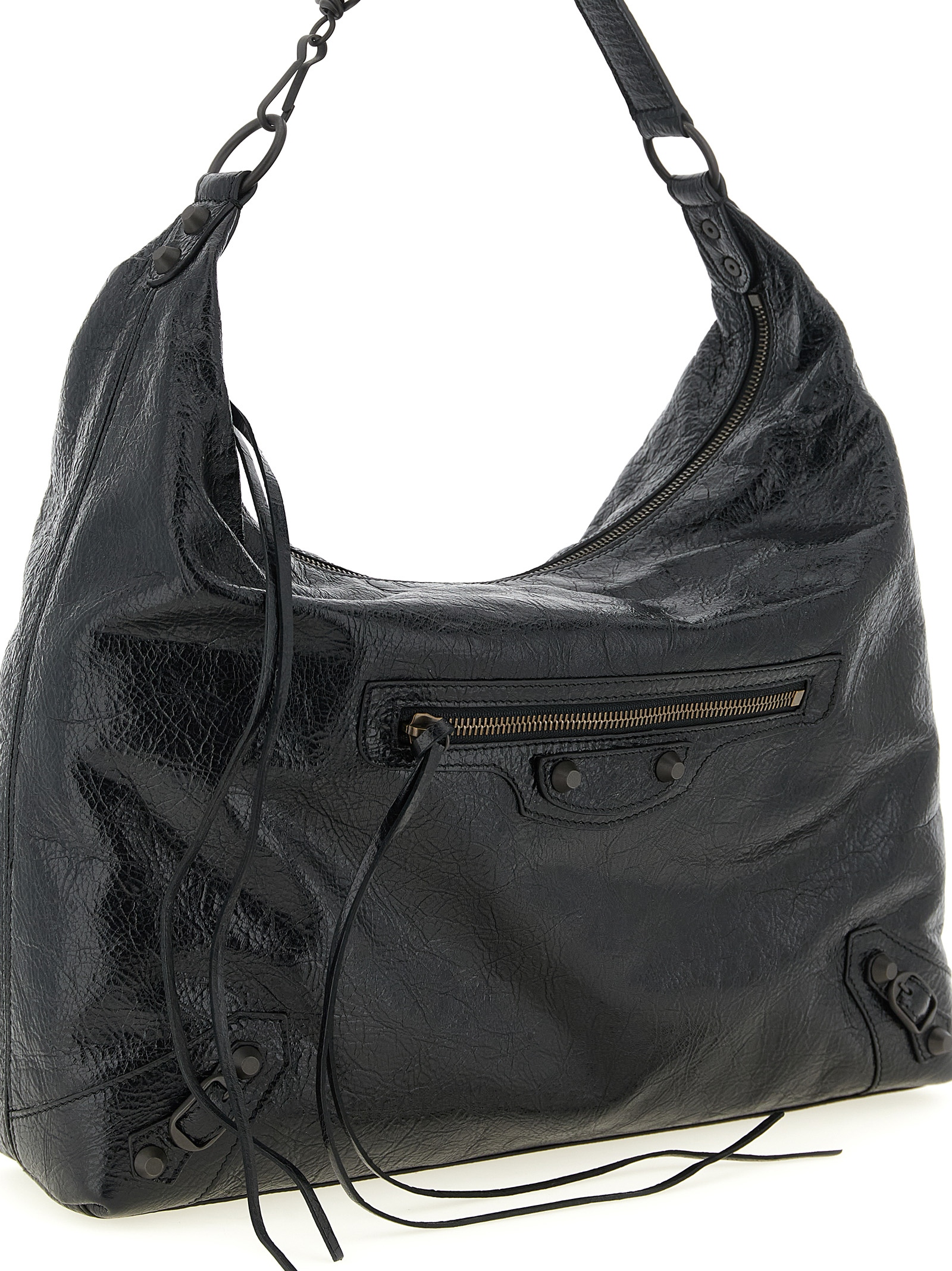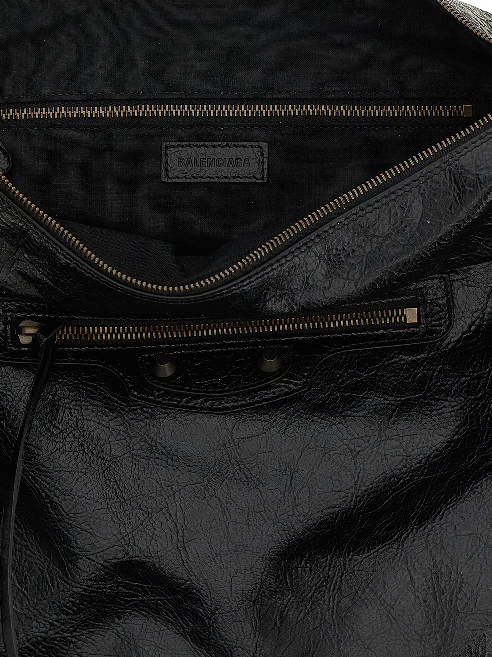 Arena 'Le City' medium shoulder bag in Arena lambskin leather with brass metal finish, Hobo model, top zip closure, handle, front zip pocket, removable shoulder strap, cotton canvas lining.
