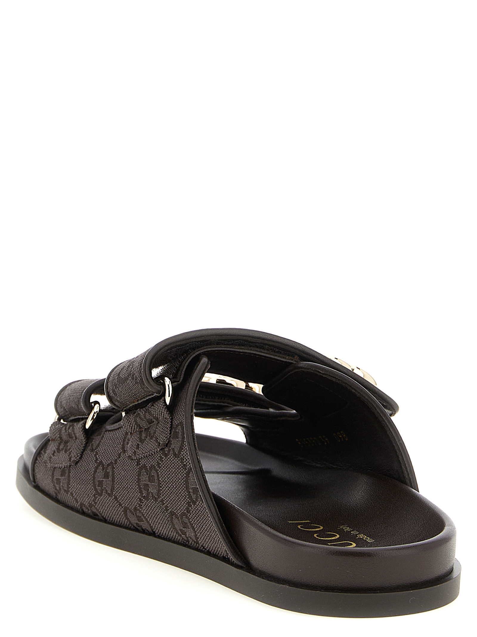 'Doppia G' slides in GG fabric, adjustable straps with velcro and metal 'Doppia G' details, leather lining, rubber sole.