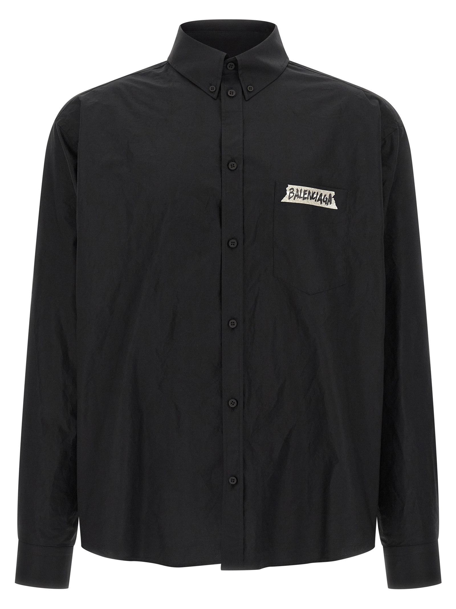 Button-down cotton poplin shirt with 'Masking Tape' print on the front and back, breast pocket, front button closure, long cuffed sleeves and dropped shoulders.