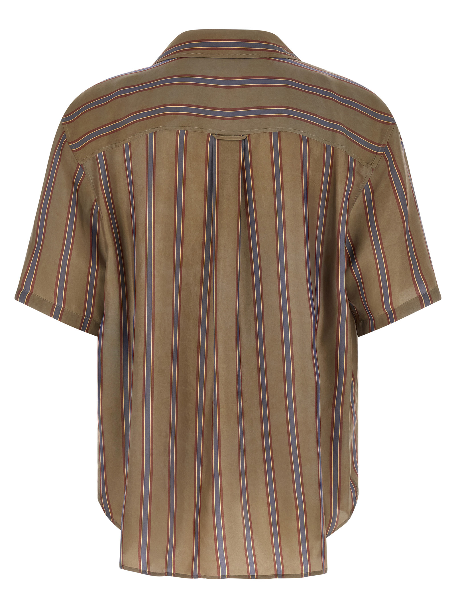 Cupro twill shirt with vertical stripes, bowling model, pocket with tone-on-tone 'Cassandre' embroidered logo, French collar, front mother-of-pearl button closure, short sleeves with dropped shoulders, back rack with cannon pleats, rounded hem.
