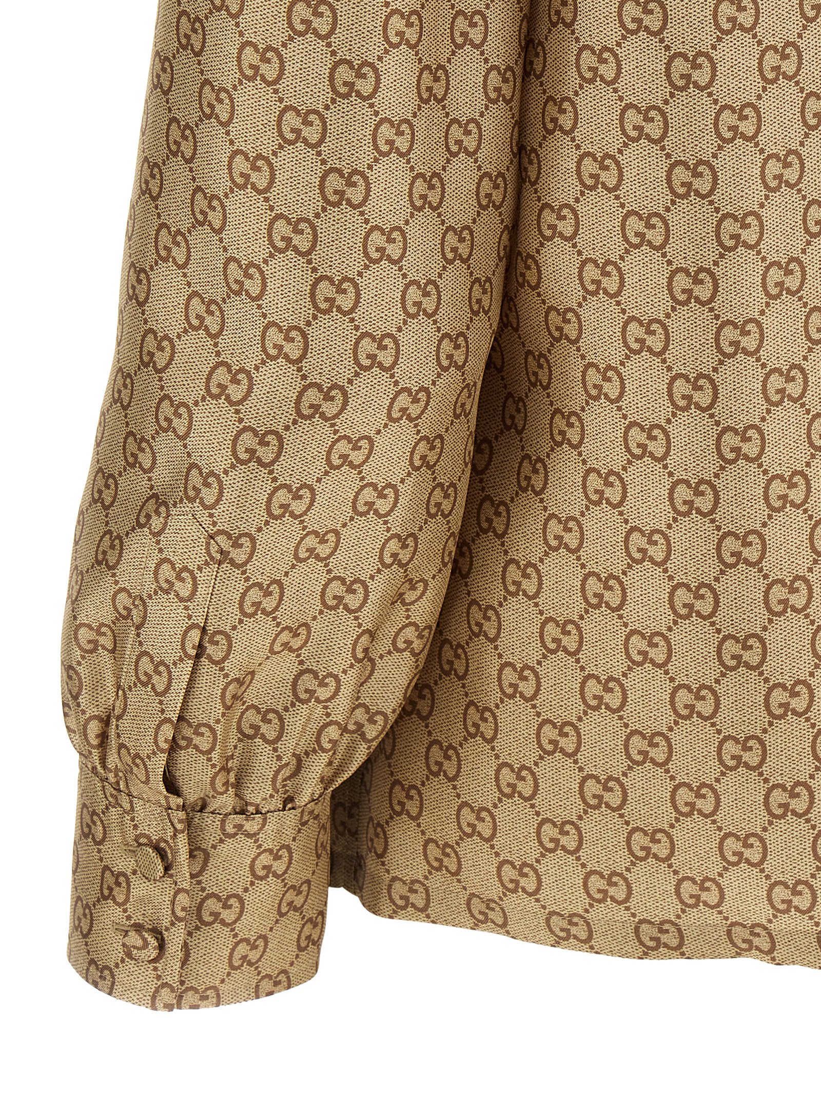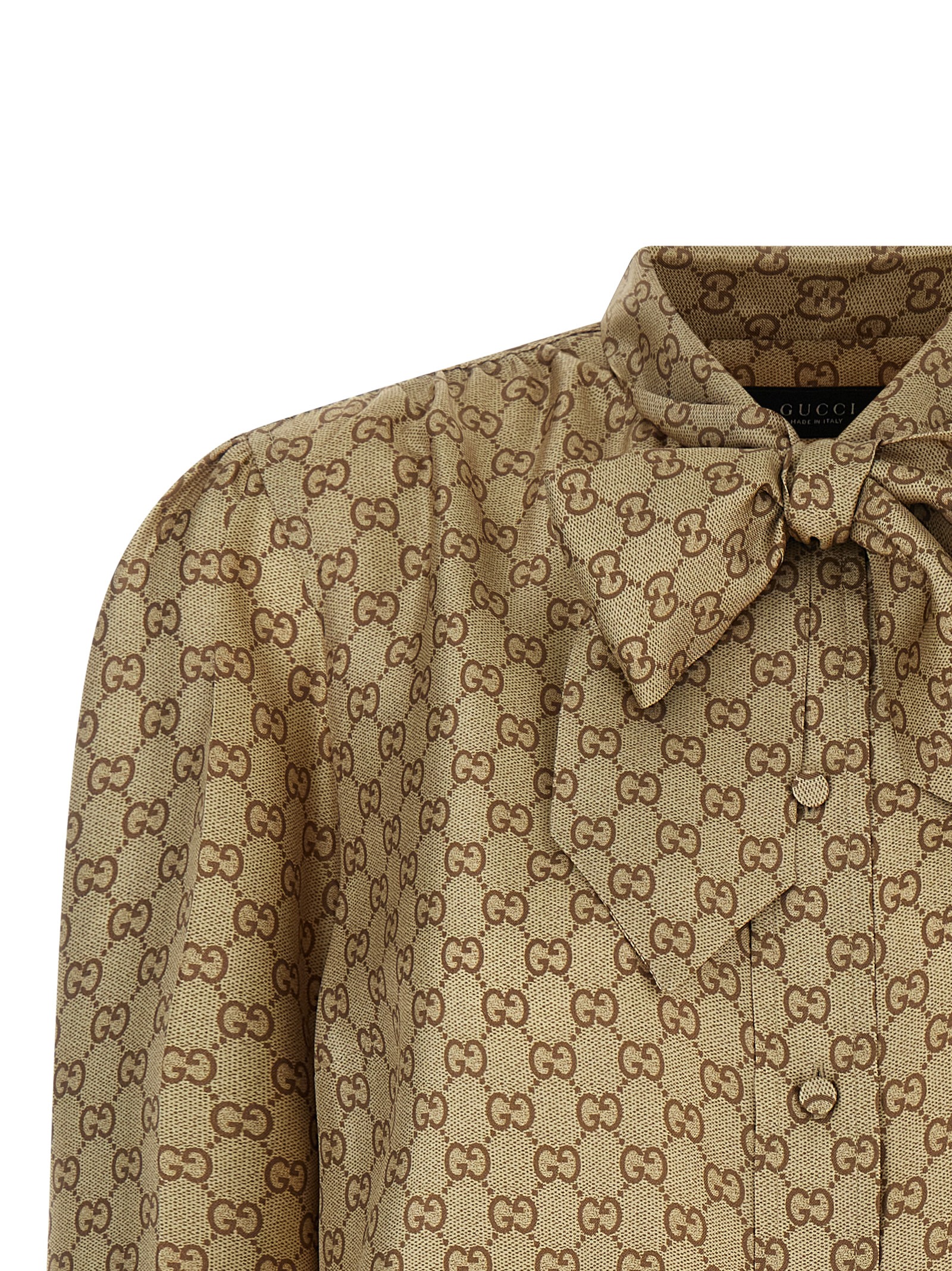 All-over 'GG' print silk twill shirt, front knotted bow collar, front closure with covered buttons, slightly puff long sleeves with curls on the shoulders and cuffs.Характеристики товара