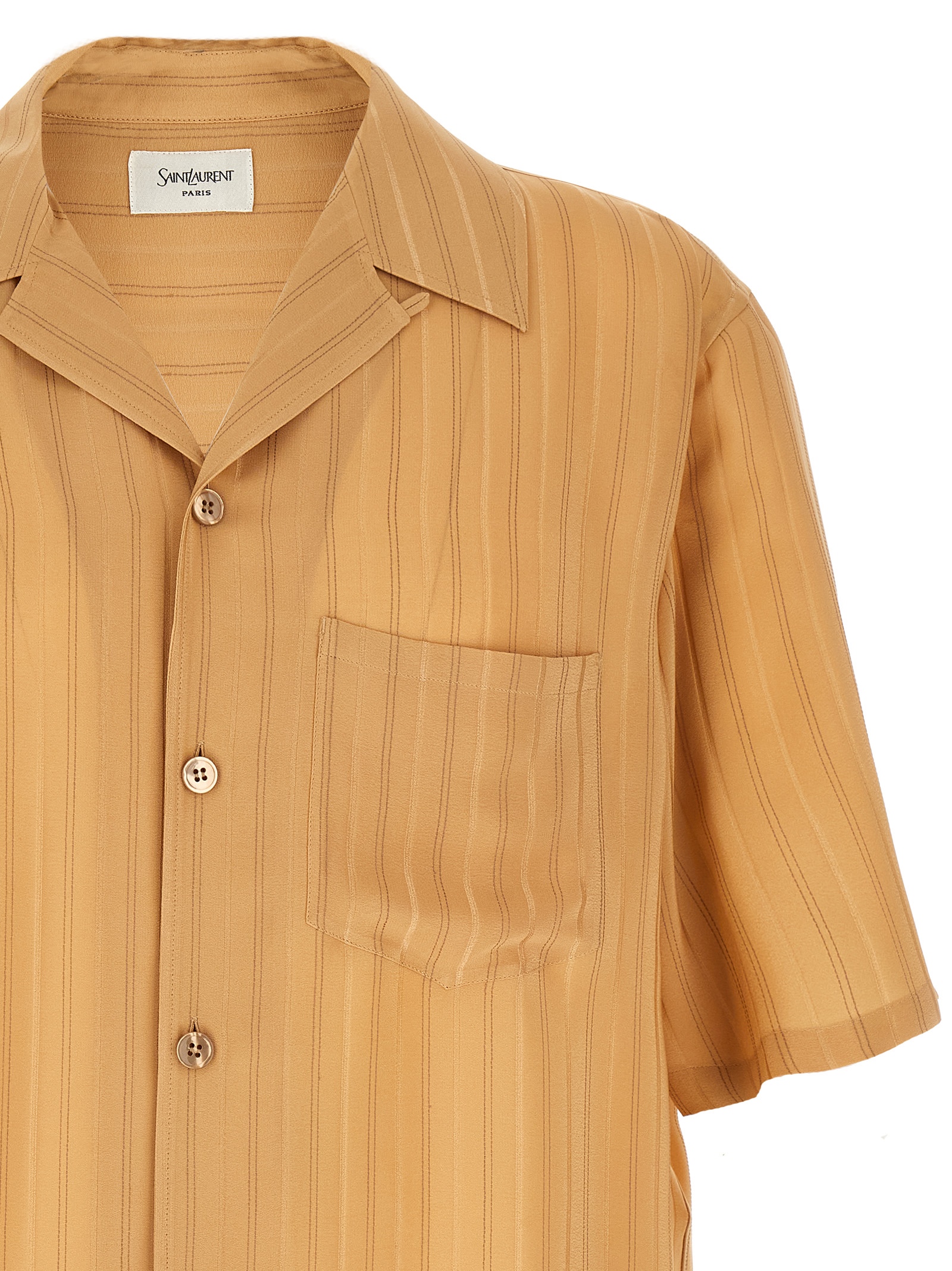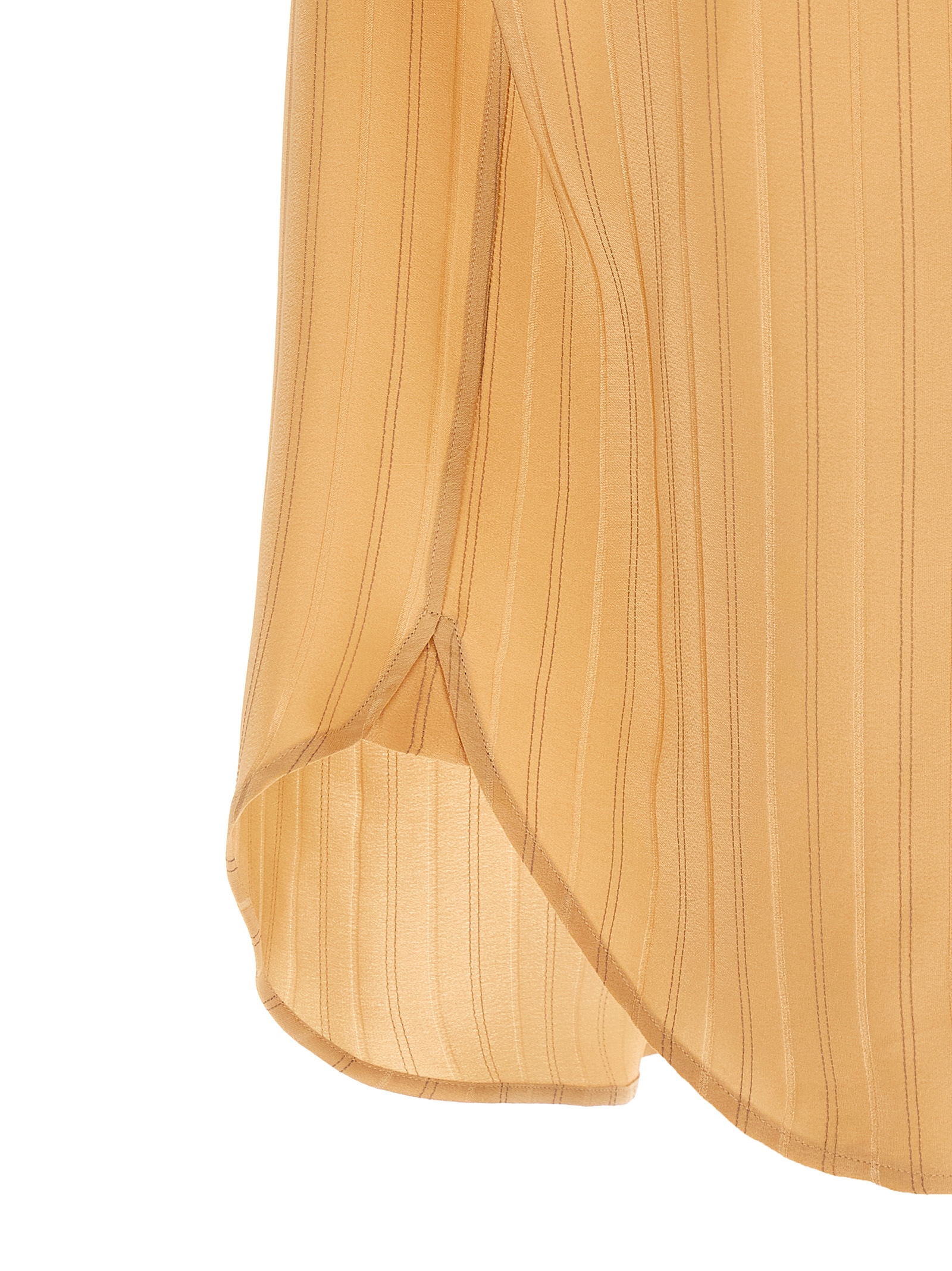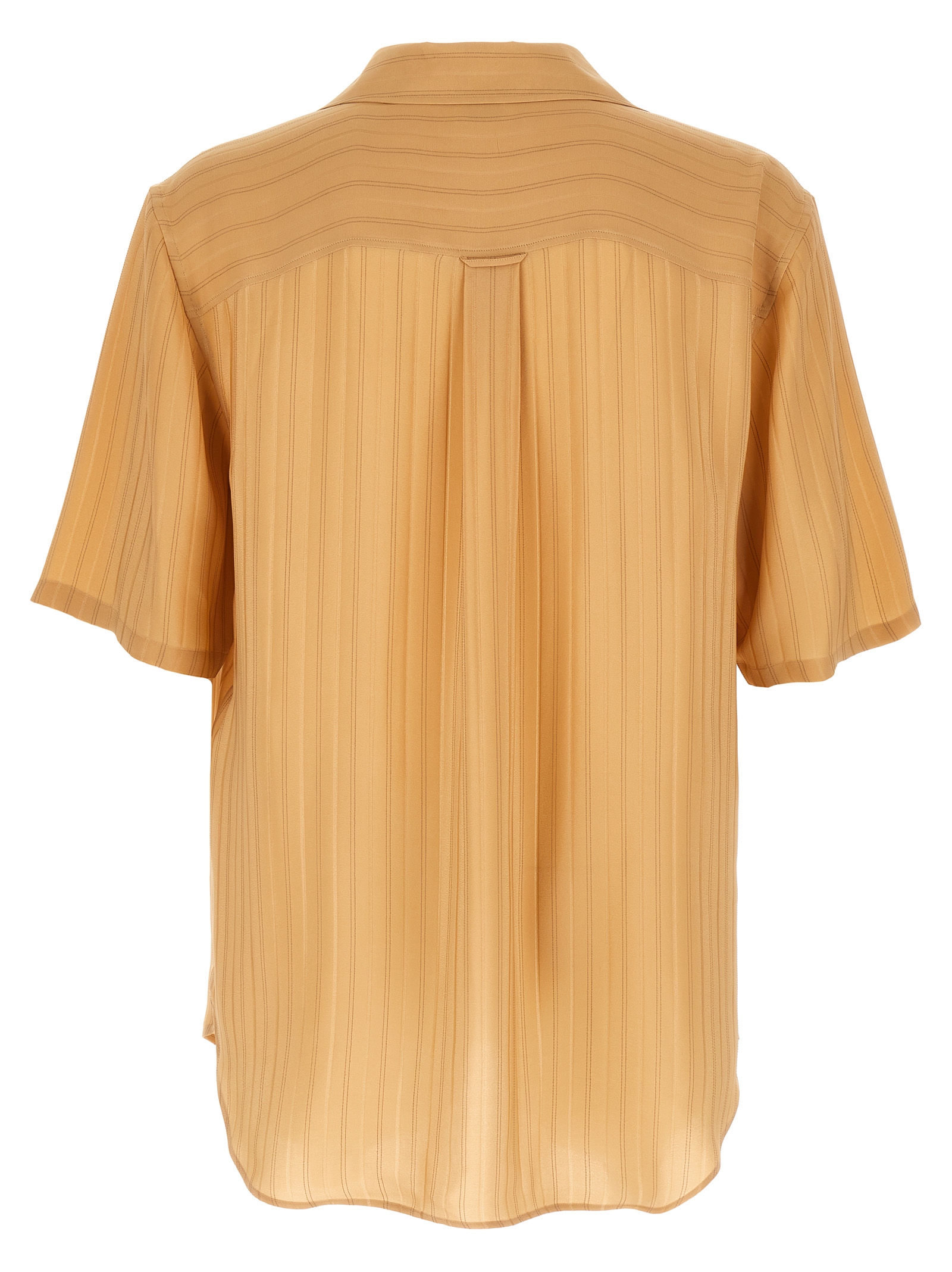 Шелковая рубашка в полоску, французский воротник, нагрудный карман, застежка на пуговицы спереди, короткие рукава со слегка приспущенными плечами, закругленный низ.Характеристики товара