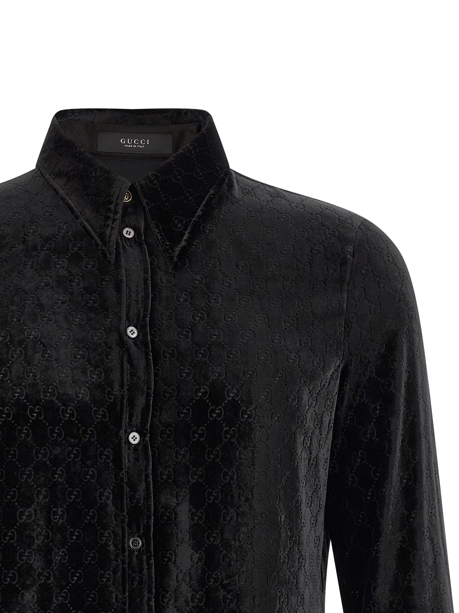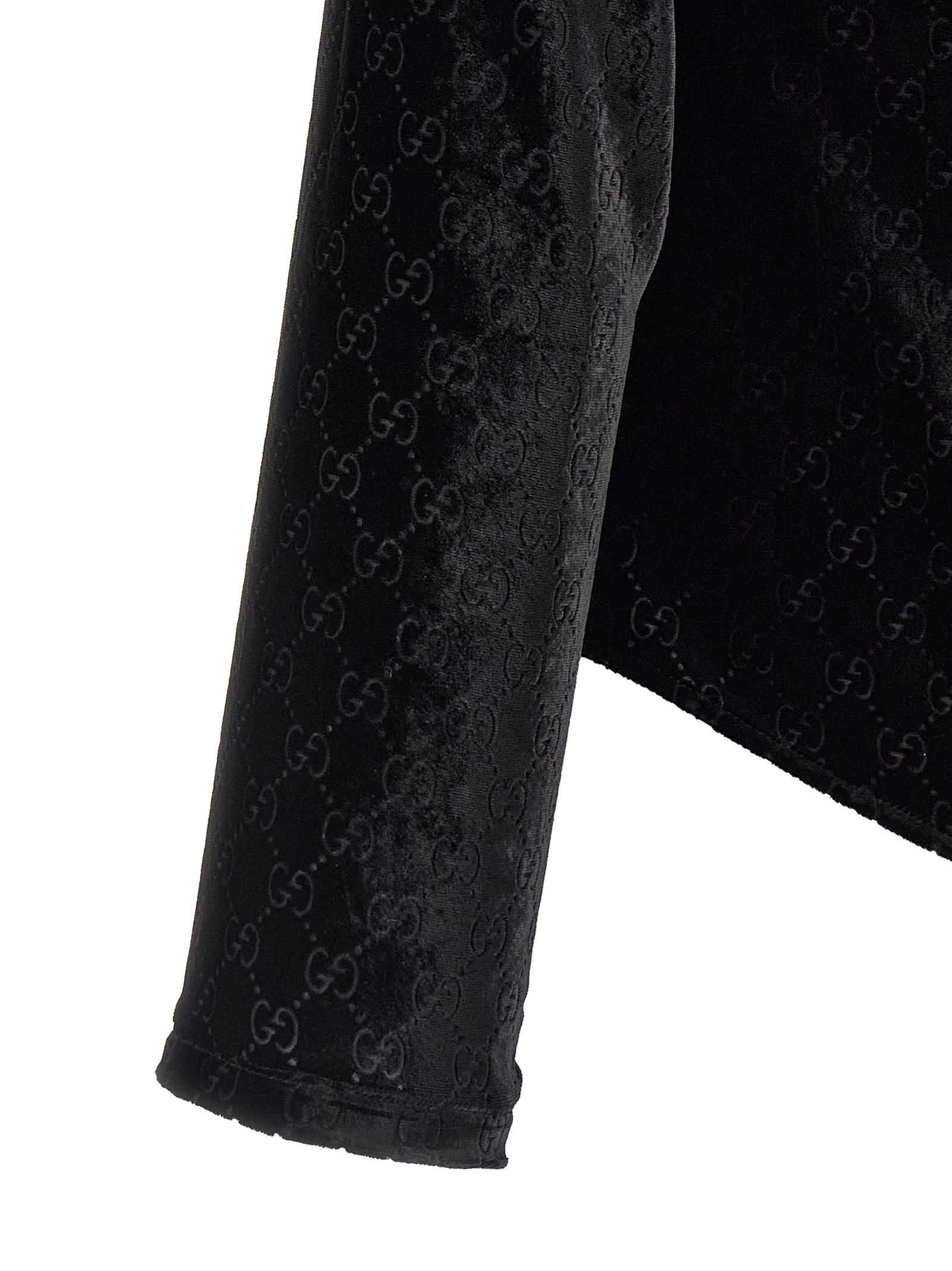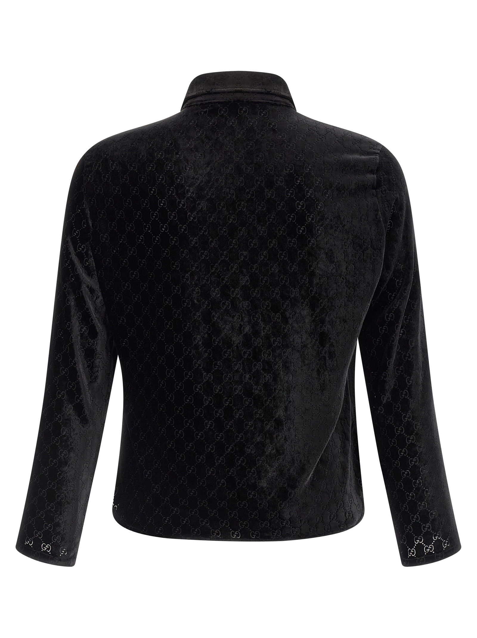 Light and fluid velvet shirt with all-over 'GG' workmanship, flared and slightly cropped style, maxi toe collar and enamelled metal jewel button with logo, front closure with tone-on-tone buttons, long sleeves.