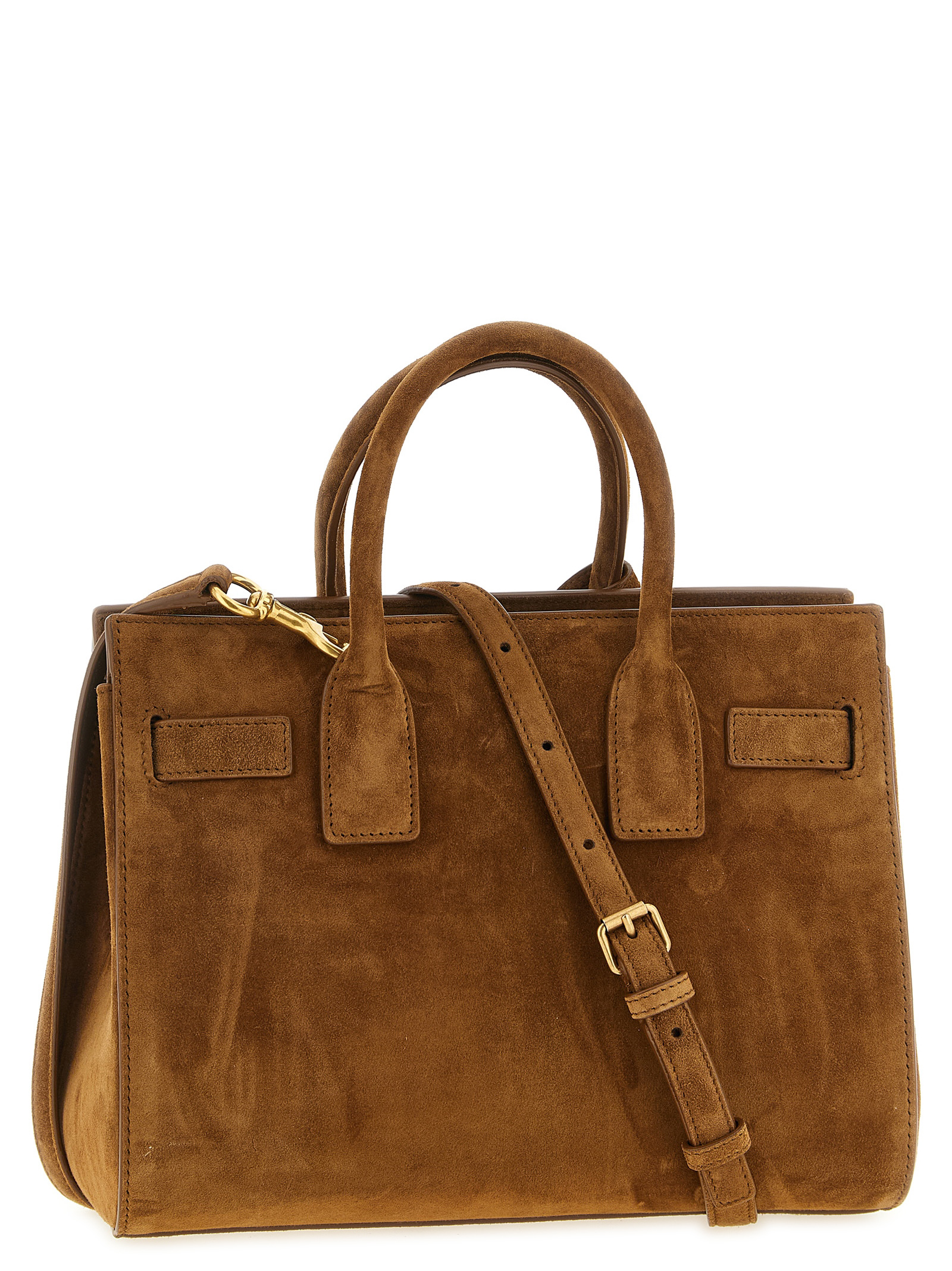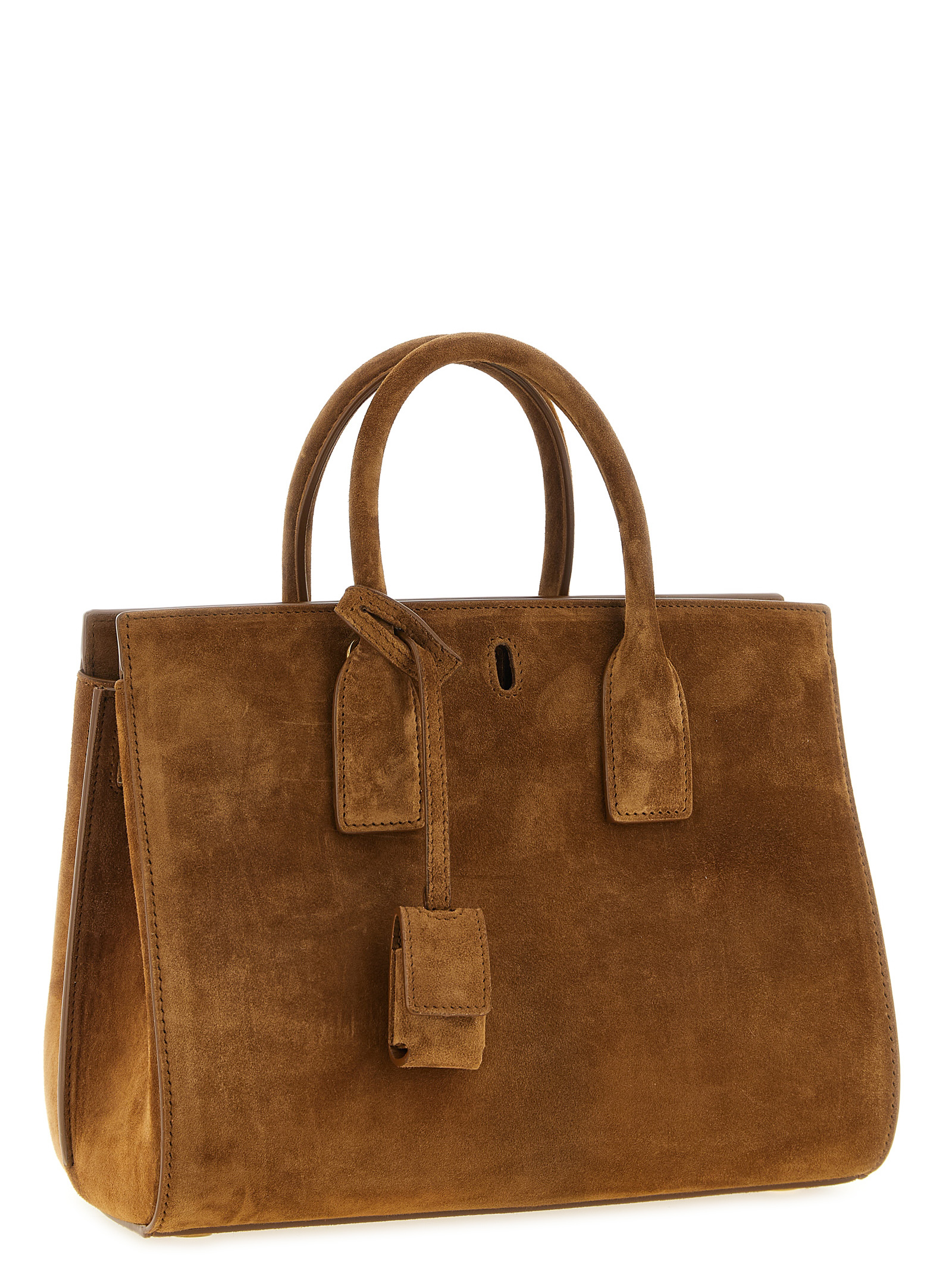 Small 'Sac De Jour' suede handbag with East-West design, extendable side gussets with adjustable inner straps, double fixed tubular handle, rigid base with metal feet, removable metal 'Cassandre' padlock detail, adjustable and removable leather shoulder strap, adjustable and removable tape shoulder strap.