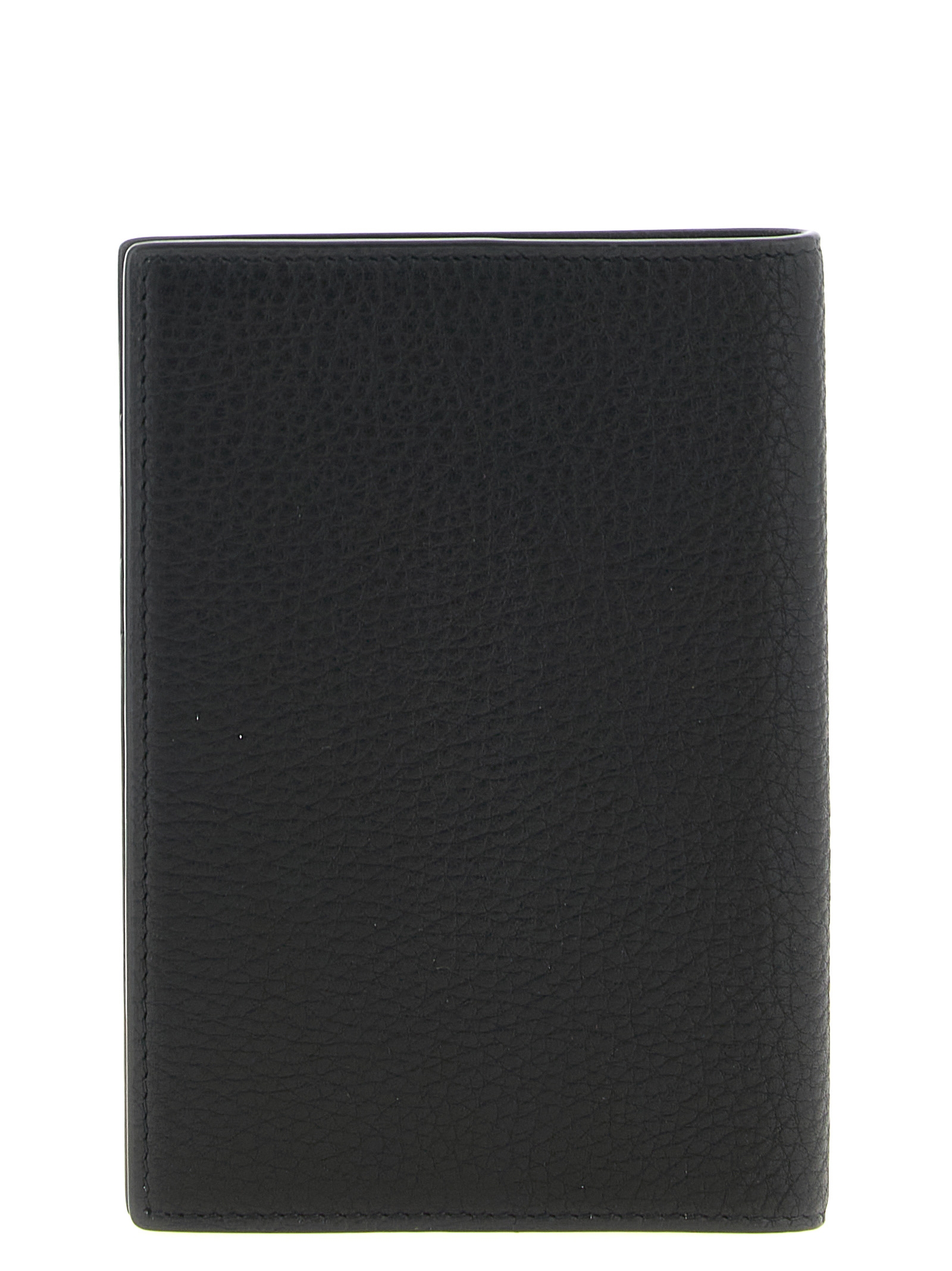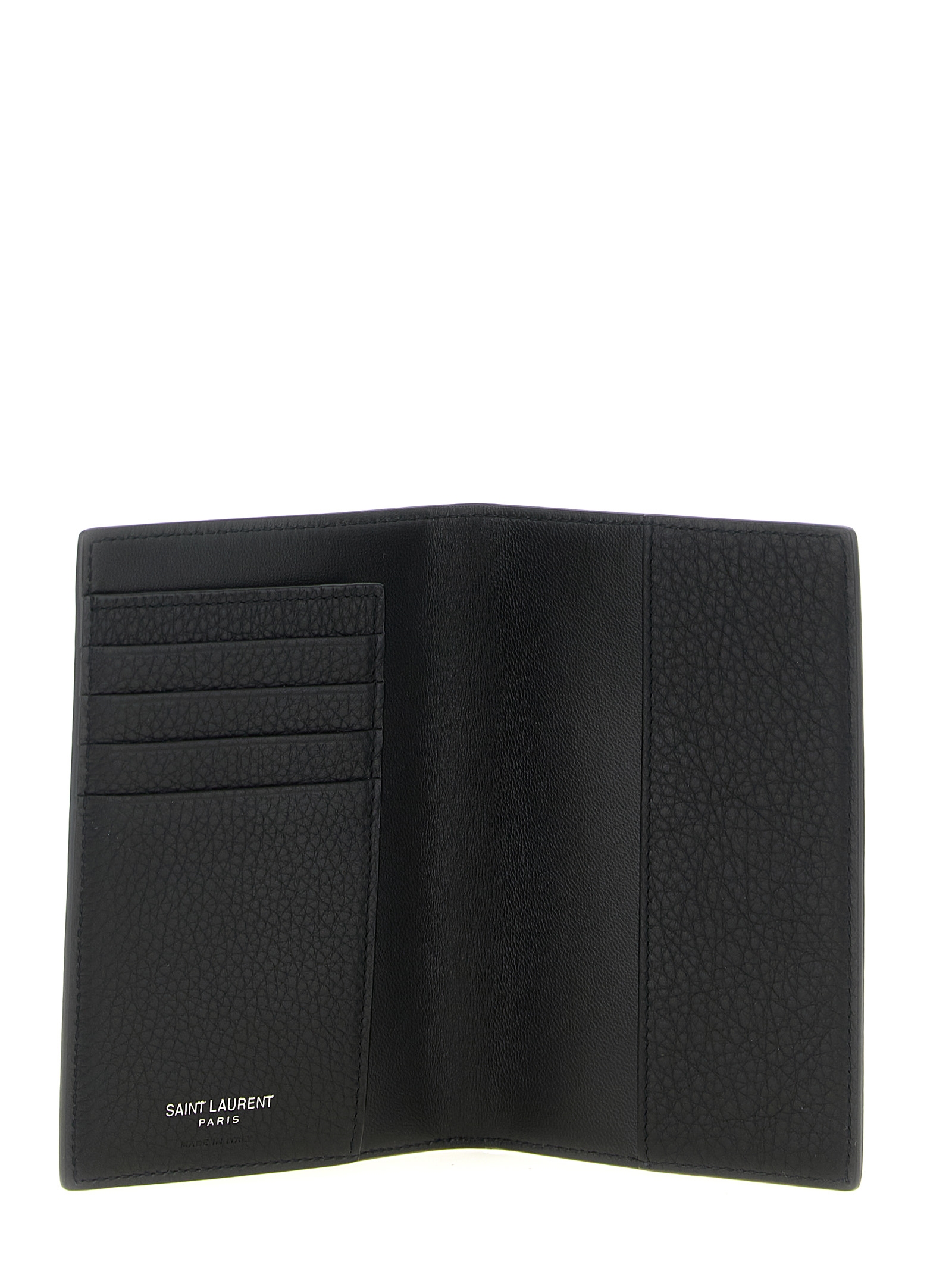 Hammered leather passport holder, front metal 'Tiny Cassandre' logo, and book opening.Характеристики товара