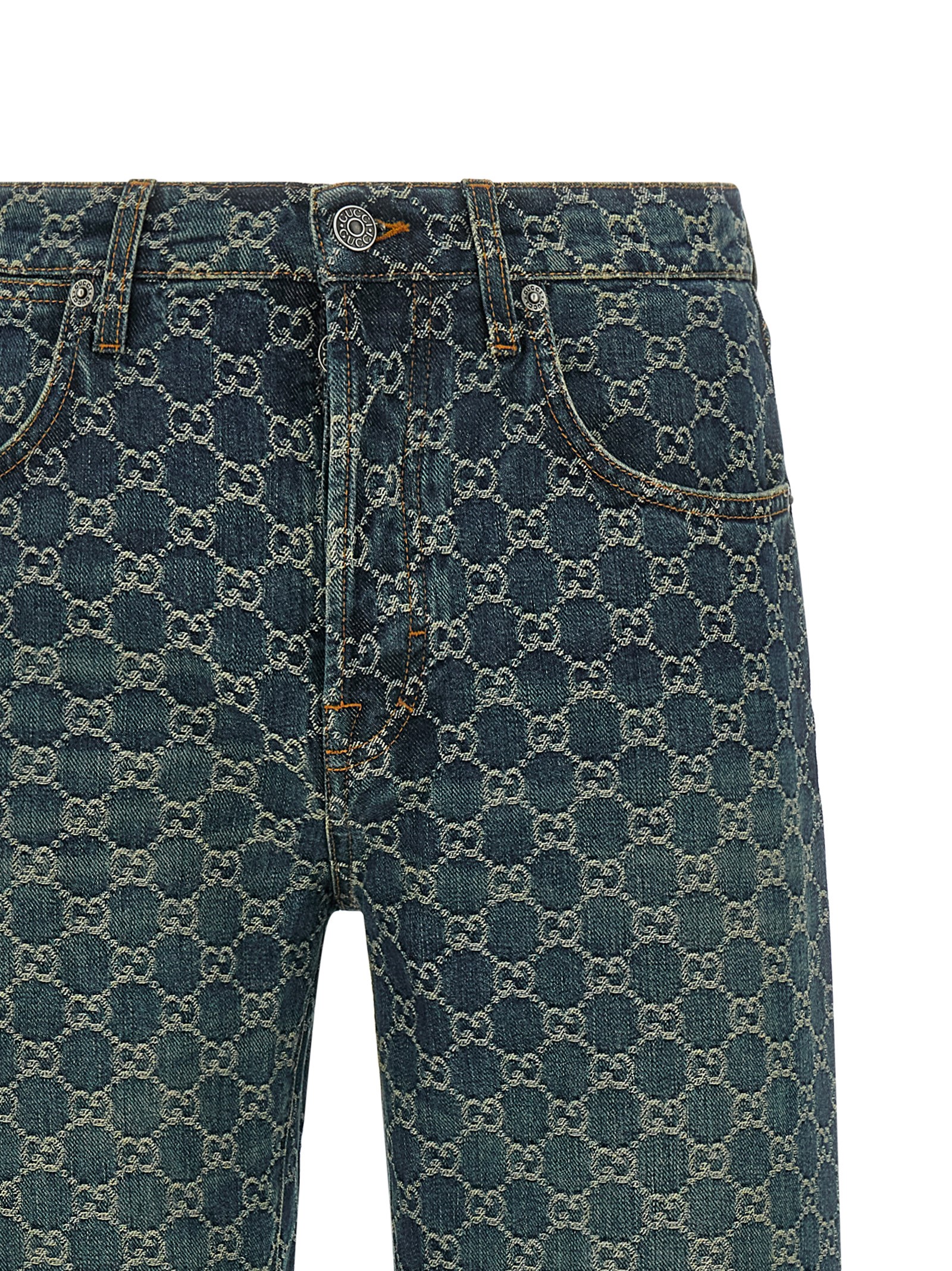GG jacquard cotton denim jeans with délavé effect, contrast stitching, wide flared leg, mid waist, front button closure, five pockets, and leather logo label at the back. This jeans is part of 'La Famiglia' collection.