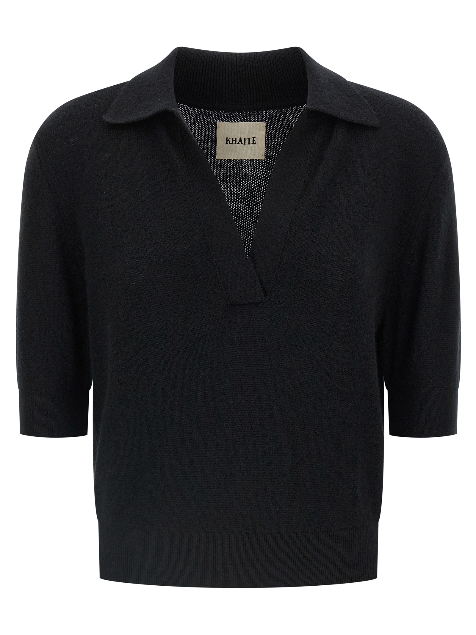 'Shrunken Jo' polo shirt in lightweight cashmere with collar and V-neck, 3/4 sleeves.