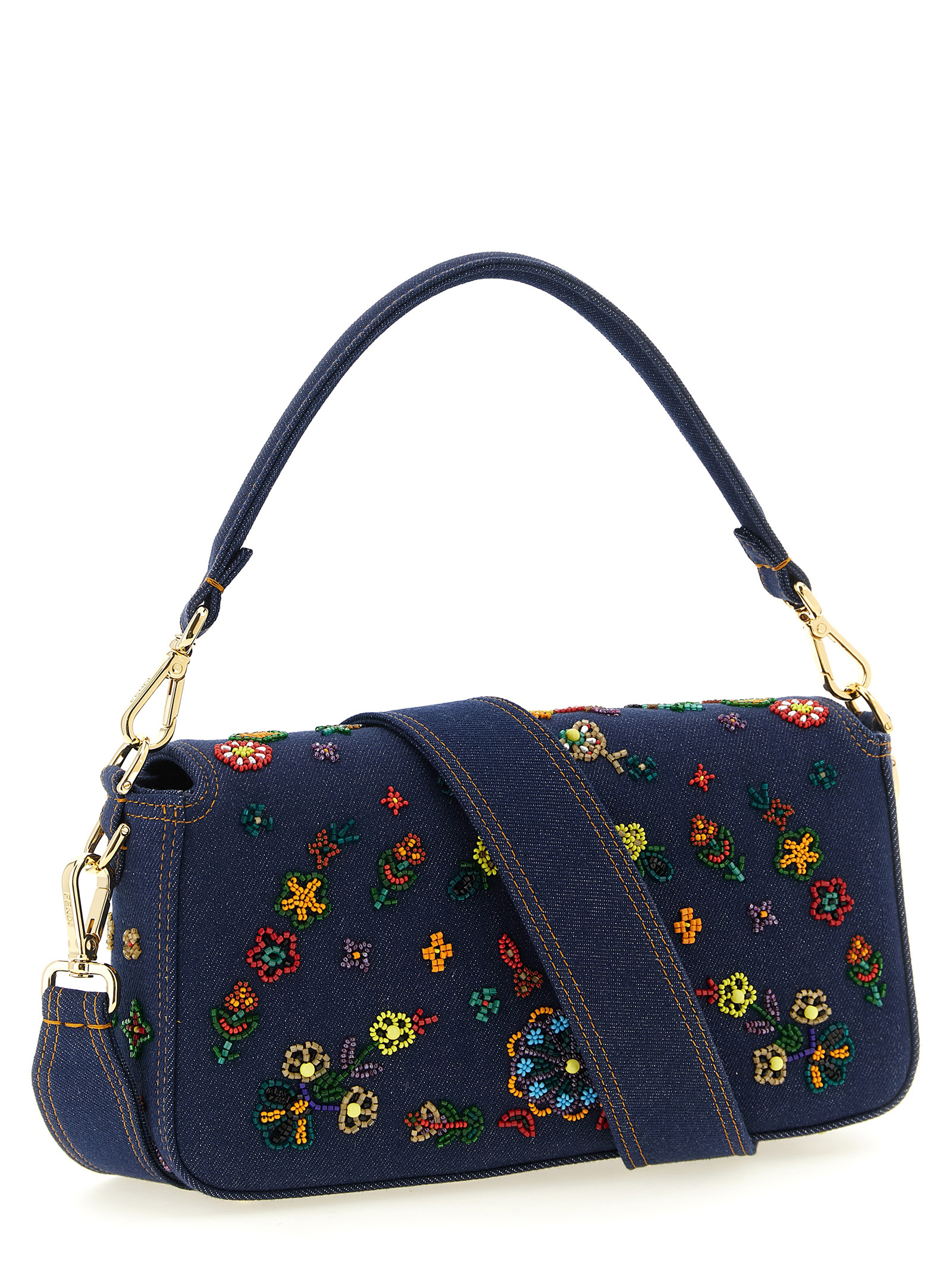 Средняя джинсовая сумка через плечо 'Baguette®' с многоцветной ручной вышивкой в виде цветочных бусин, контрастной строчкой, магнитной застежкой-клапаном с металлической пряжкой FF спереди, контрастной атласной подкладкой с внутренним карманом и логотипом 'Re-Edition', съемной ручкой и съемным плечевым ремнем.Характеристики товара