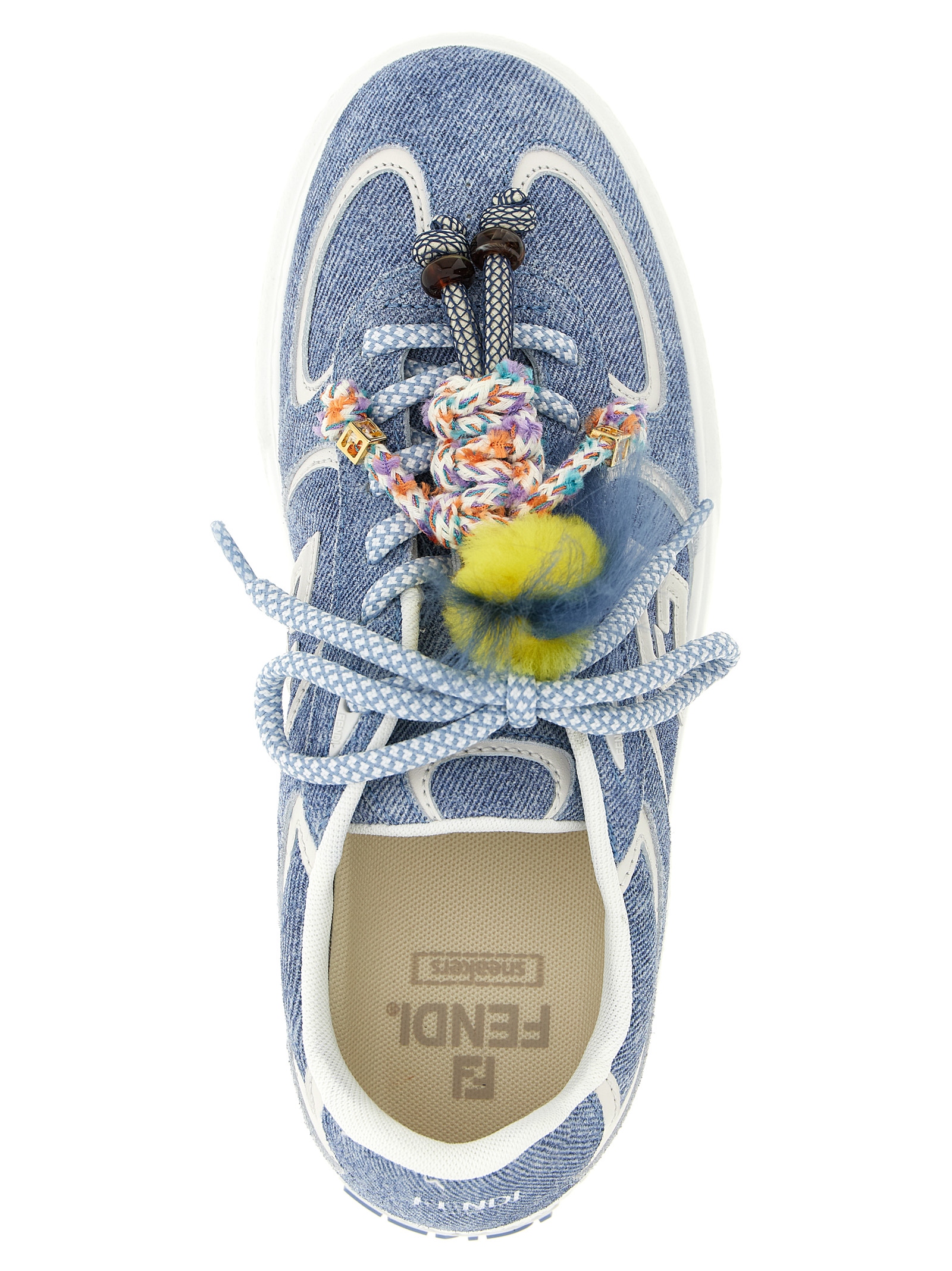 'Fendi Match' denim-effect printed suede sneakers with contrasting smooth leather details, embossed logo on the heel, embossed logo Lateral, lace-up closure with charms attached with snap hook, rubber platform sole with embossed macro logo lettering at the back.