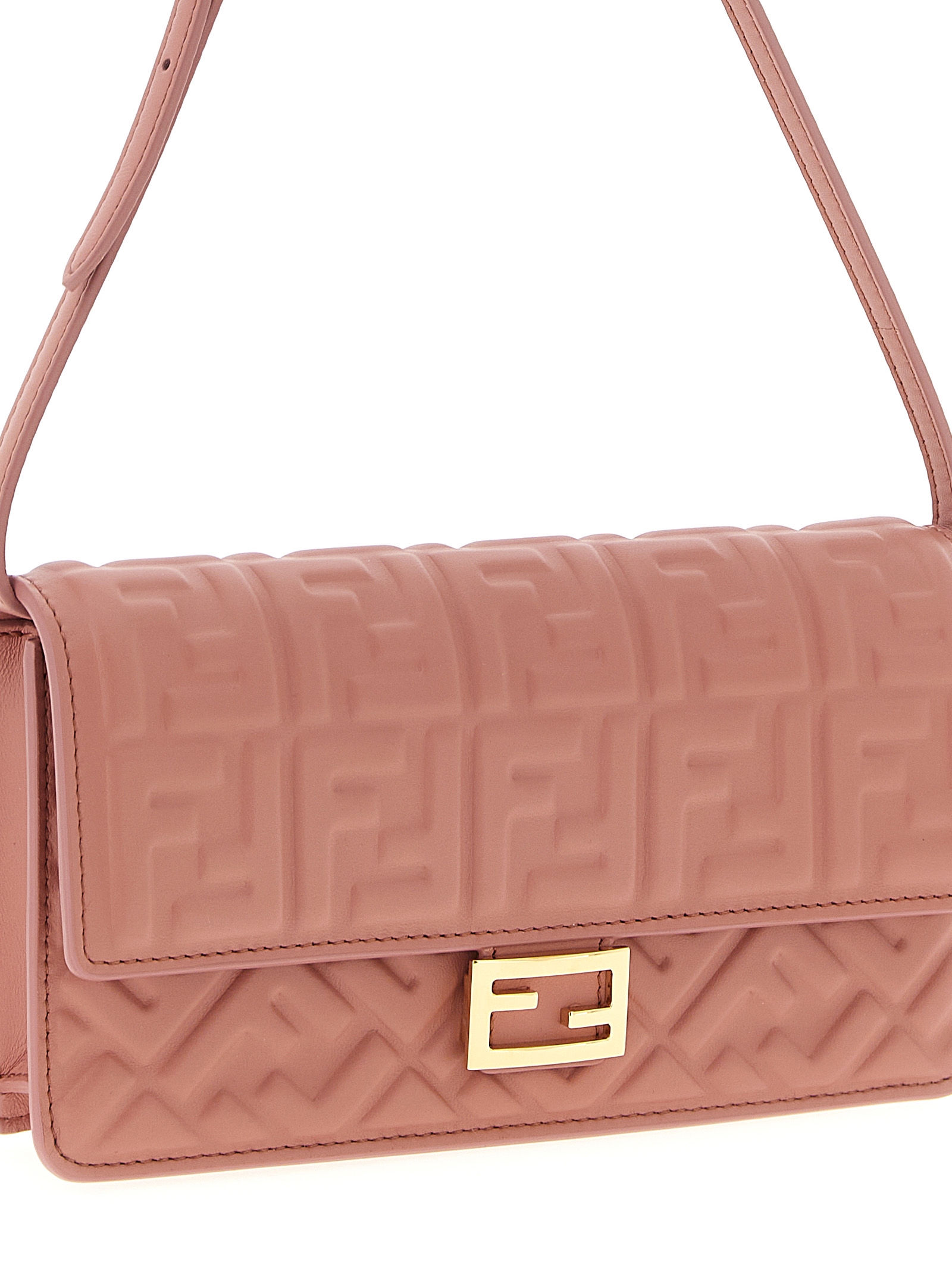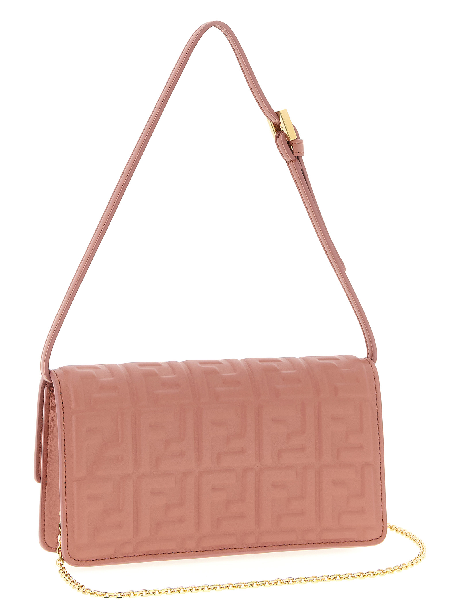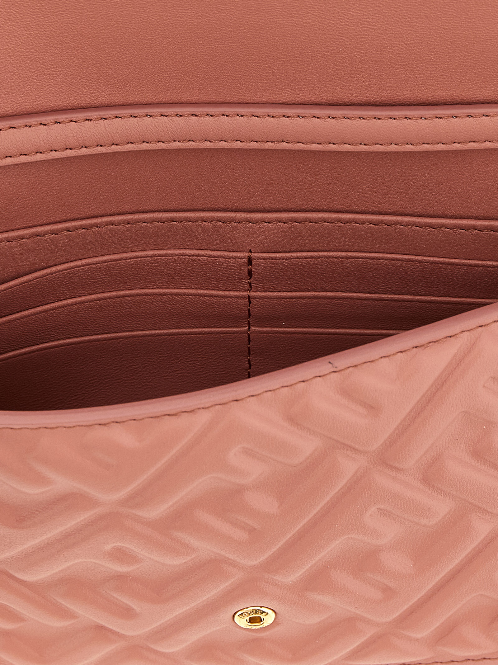 Кошелек Baguette из кожи наппа на цепочке с культовым тисненым узором FF, создающим трехмерный эффект, магнитной застежкой-клапаном с металлическим логотипом FF спереди, регулируемым и съемным коротким кожаным плечевым ремнем и съемным плечевым ремнем-цепочкой.Характеристики товара