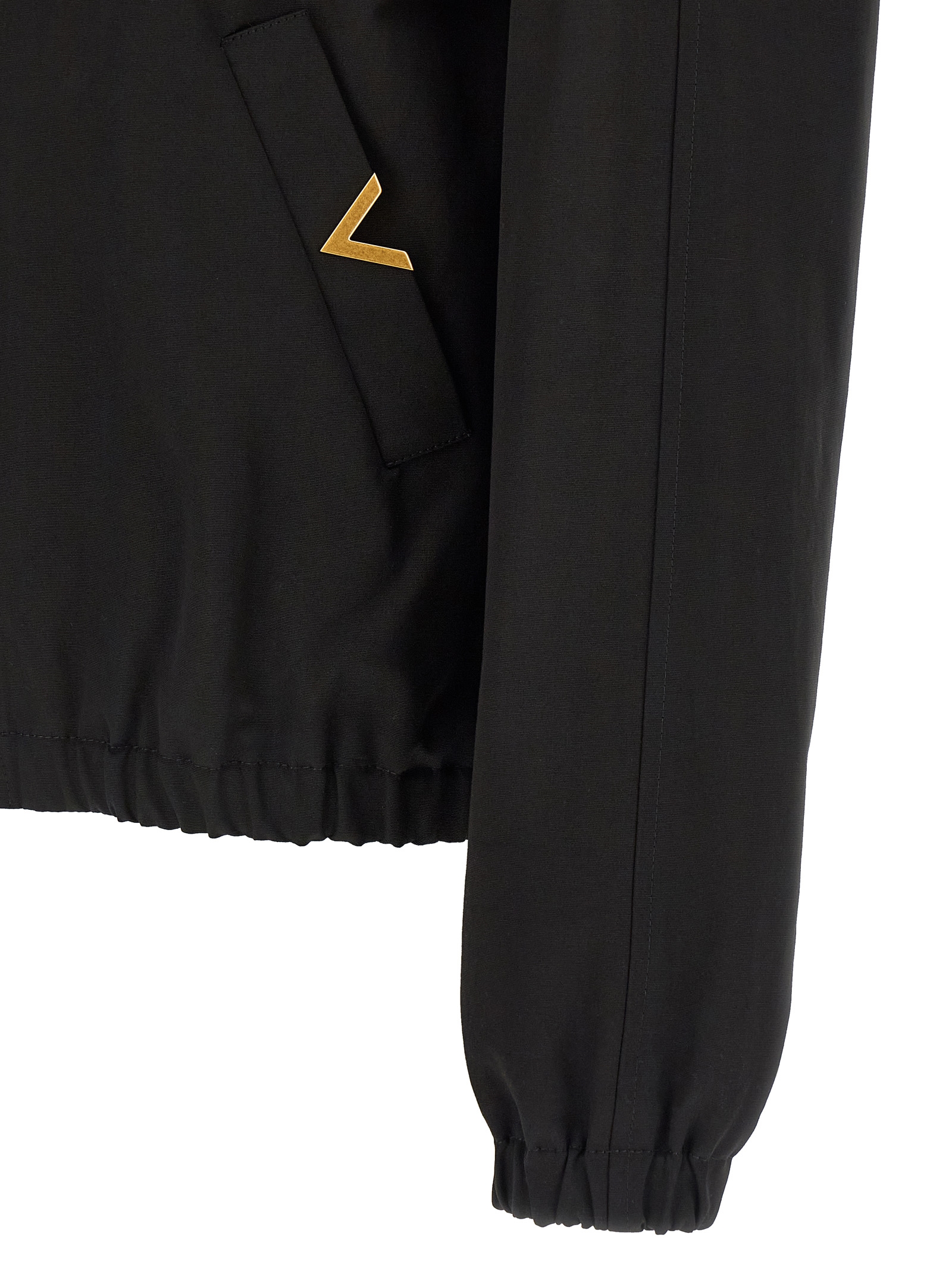 'Valentino' cotton bomber jacket with cupro lining, shirt collar, front zip closure, pockets with antiqued metal 'VGold' logo detail, long raglan sleeves with elastic cuffs, elastic hem.