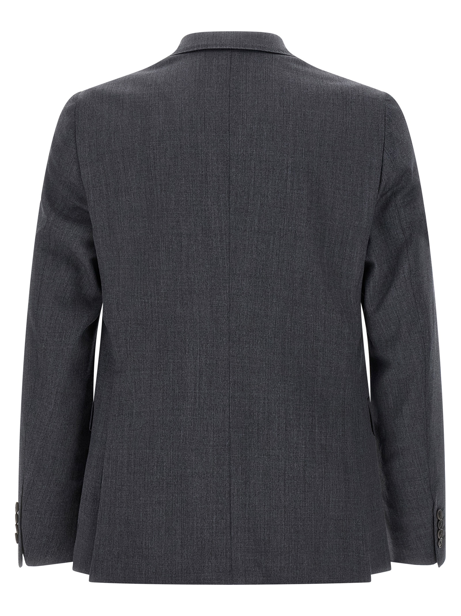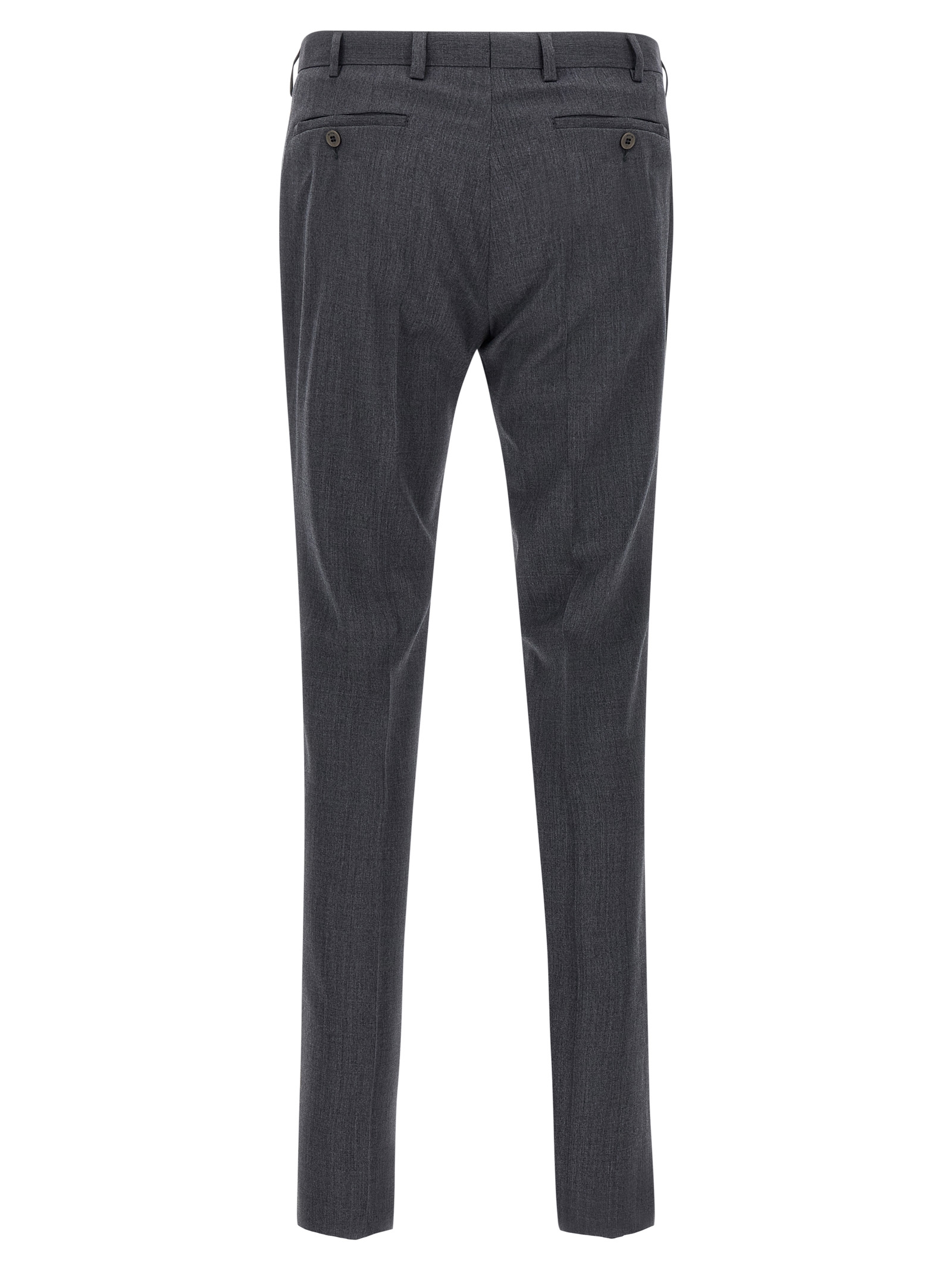 3-piece 'Linea Cerimonia' dress in stretch wool composed of: - single-breasted blazer with front button closure, mirror lapels with removable metal brooch, breast pocket, flap pockets, cupro lining, two inner pockets, cuffs with opening buttonholes, back vents; - V-neck vest, front button closure, adjustable strap at the back, patch pockets; - Stretched pleat trousers, front 'americane' pockets, back welt pockets, front zip and button closure, viscose lining.