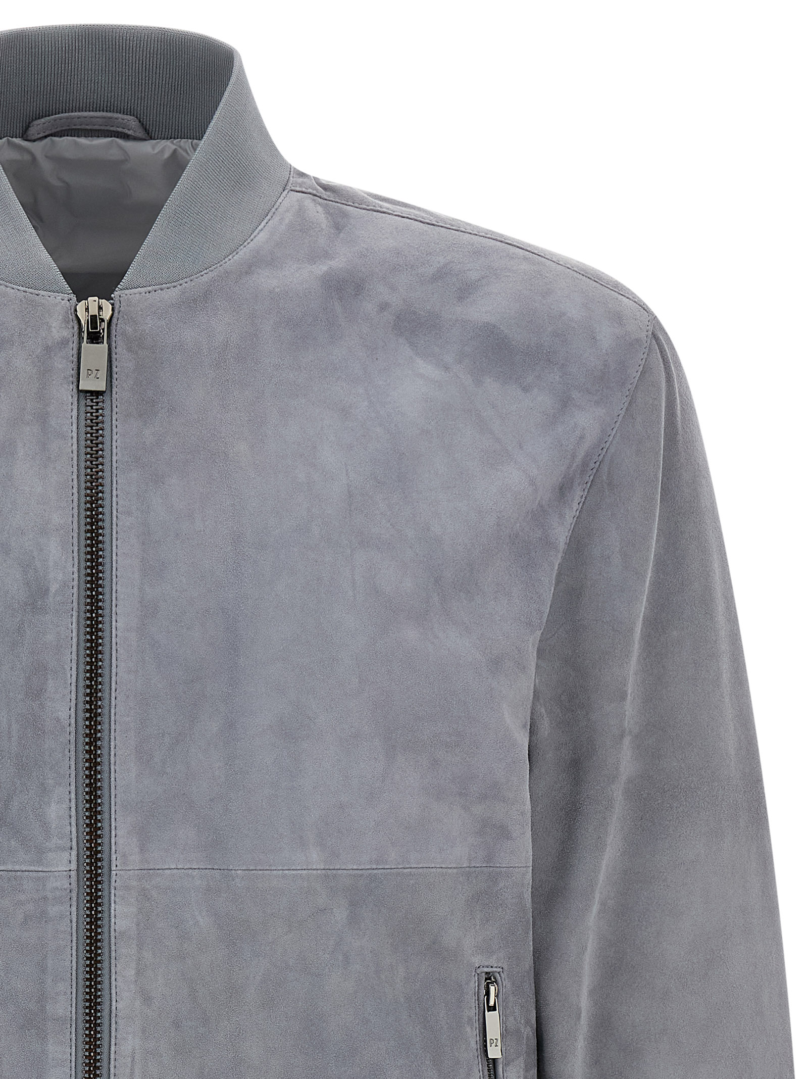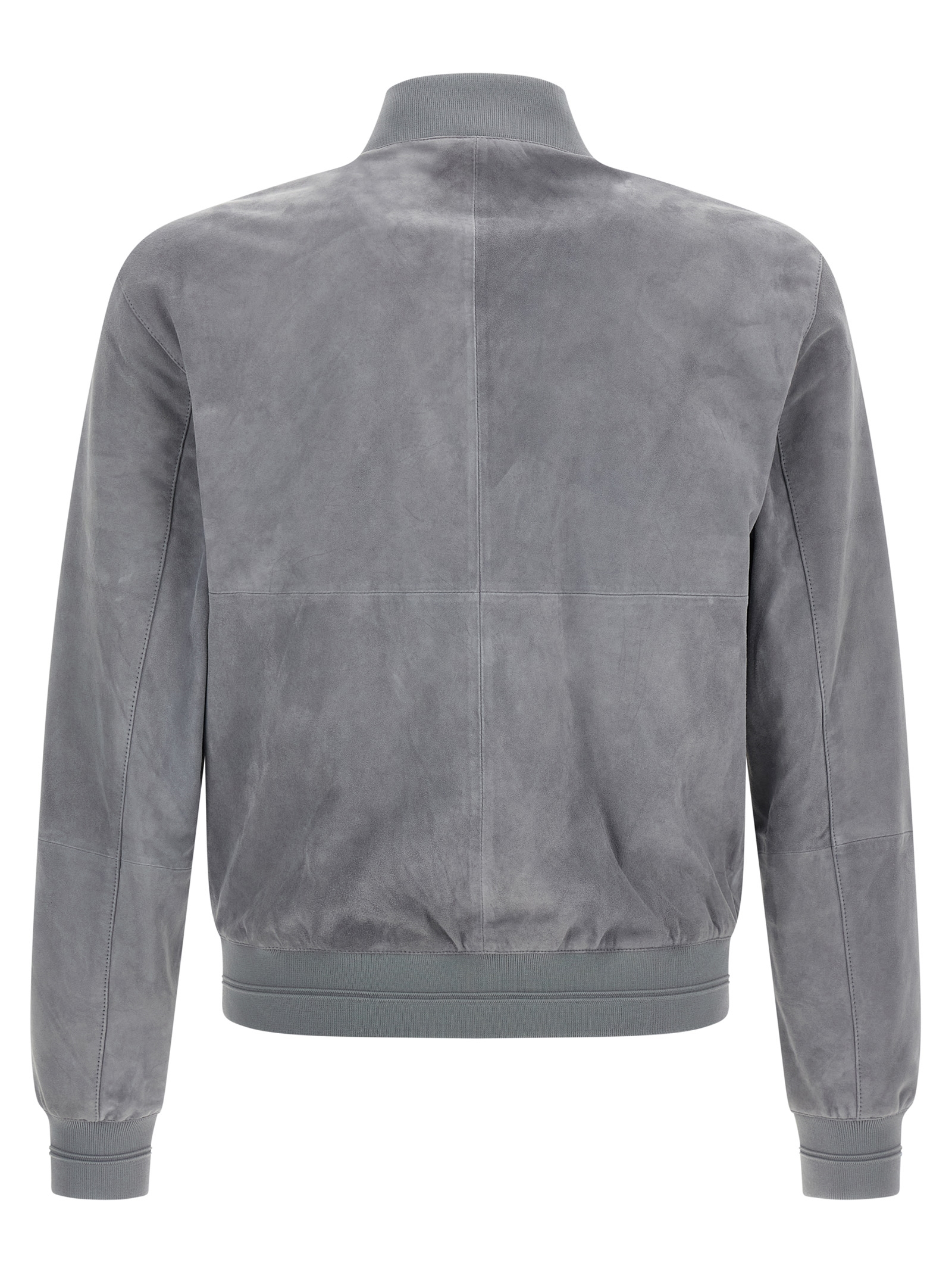 Suede jacket with tone-on-tone ribbed stretch knit detailing, nylon lining, panel construction, high neck, front zip closure, pockets, long cuffed sleeves, and headband.