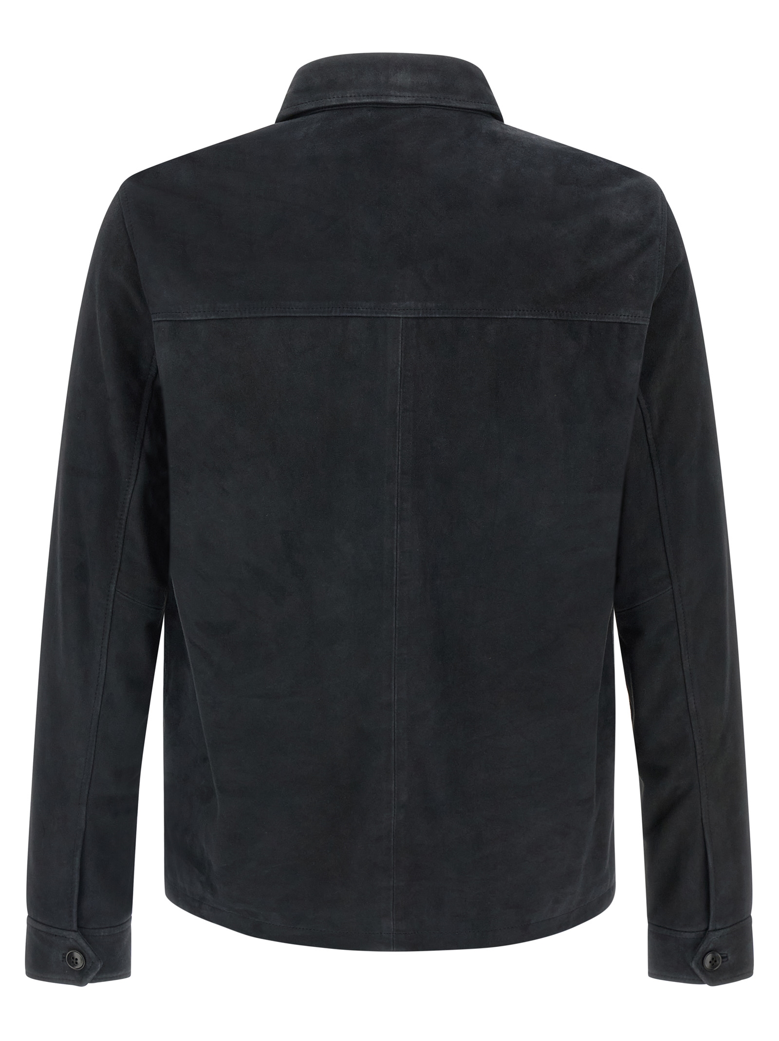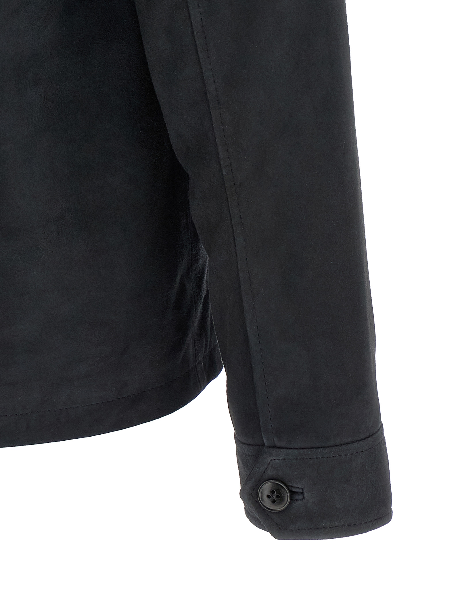 Suede overshirt, nylon lining, front button closure, pockets, long cuffed sleeves.