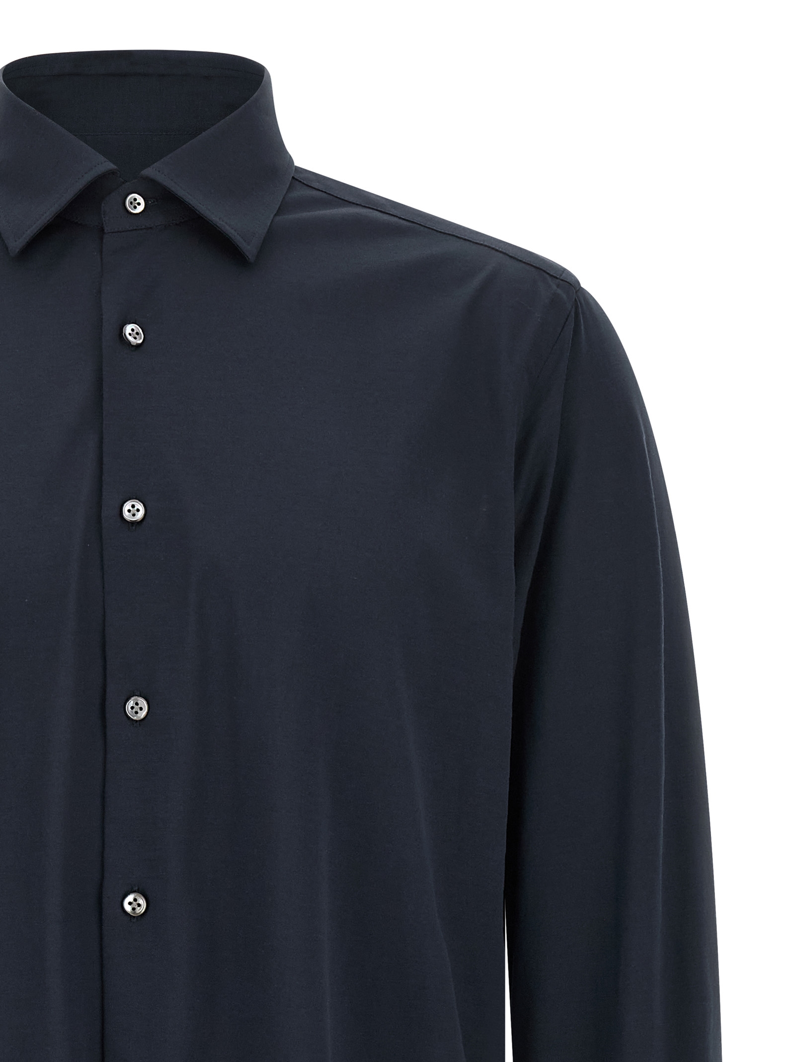 'Effortless' capsule shirt in effortless cotton jersey, Milano collar, front button closure, long cuffed sleeves, rounded hem.