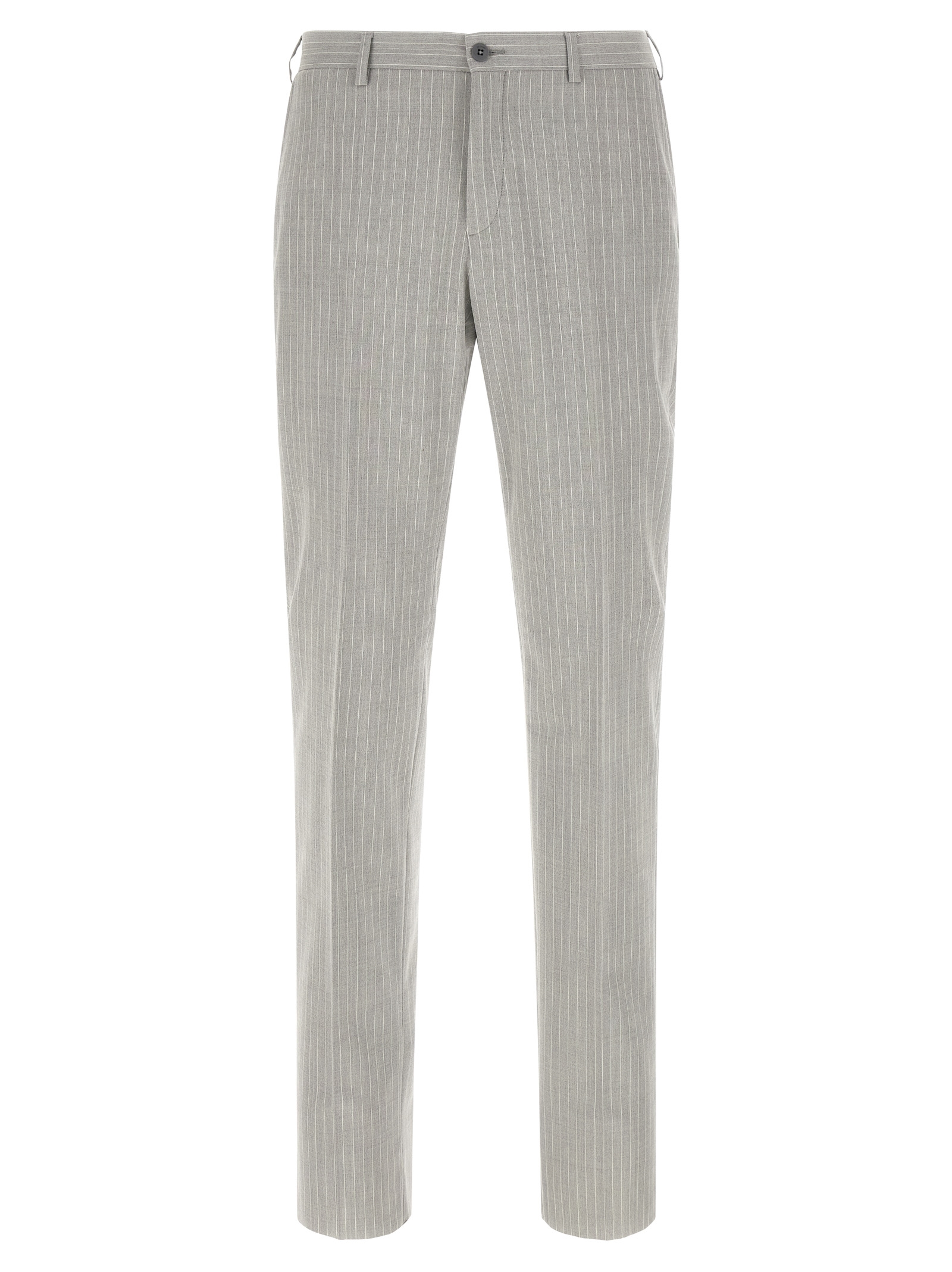 'Lord' pinstripe patterned wool blend dress consisting of double-breasted blazer with front button closure, peak lapels with removable metal brooch, breast pocket, flap pockets, cupro lining, two inner pockets, cuffs with opening buttonholes, back slits and trousers with stretched pleat, front 'americane pockets', back welt pockets, front zip and button closure, viscose lining.