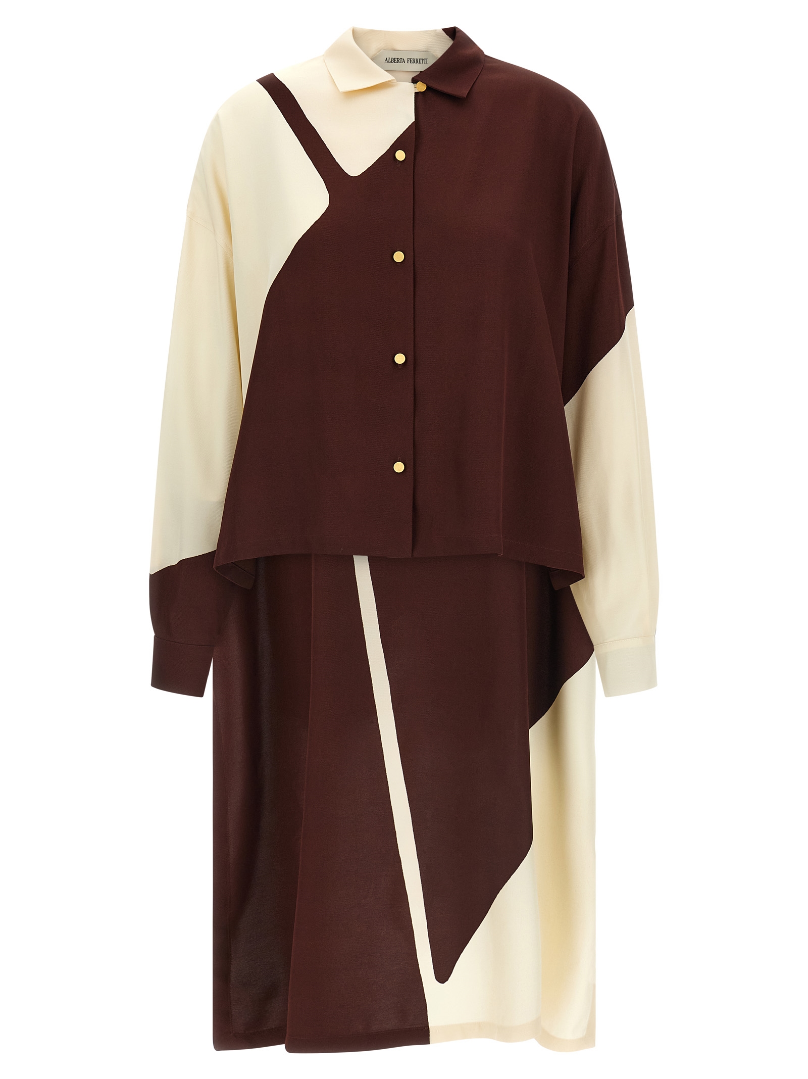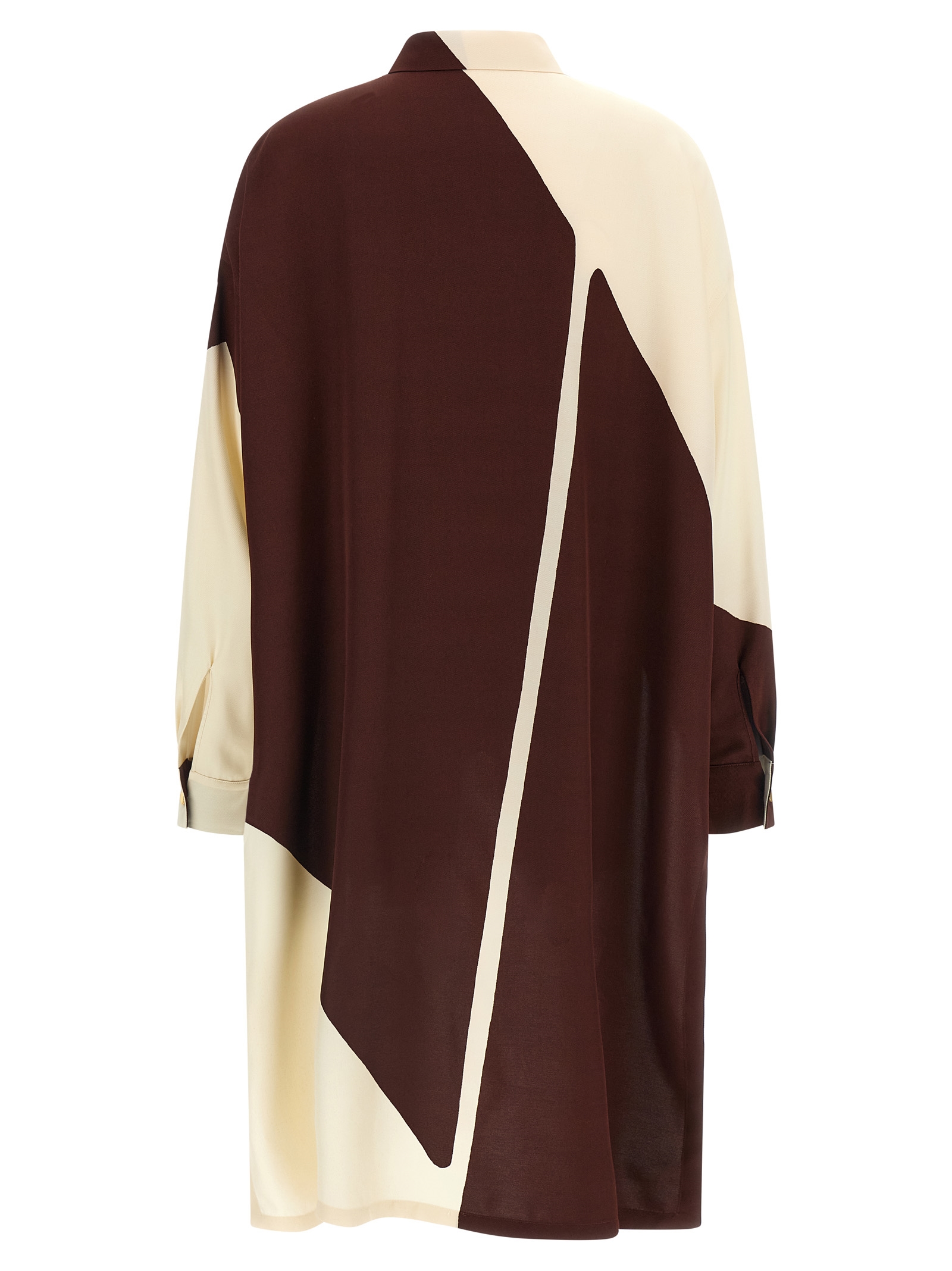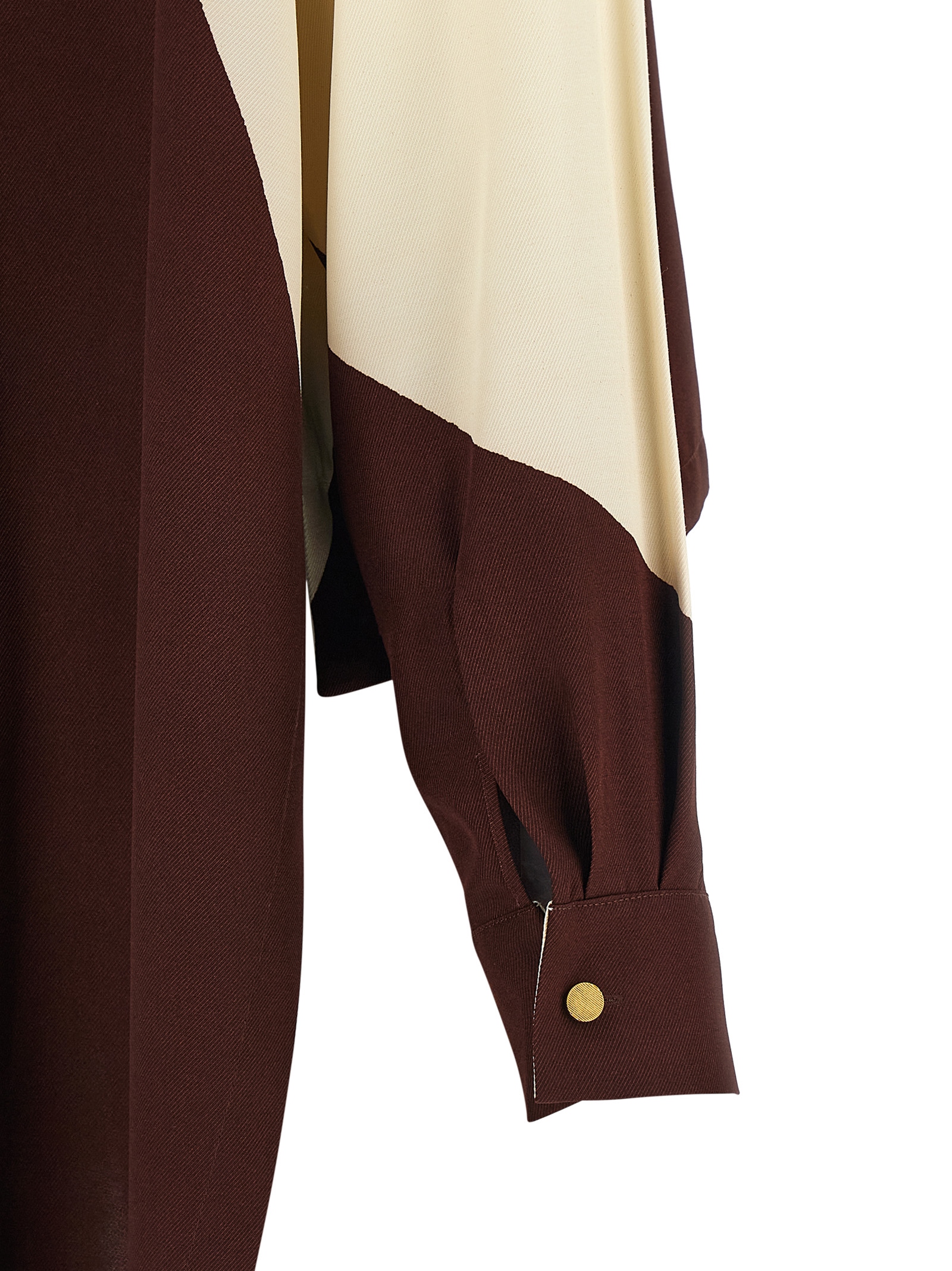 Рубашка из струящейся вискозы с графическим принтом в виде цветовых блоков, застежка на металлические пуговицы спереди, длинные рукава с манжетами и приспущенными плечами, боковые разрезы по асимметричному низу с шлейфом.Характеристики товара
