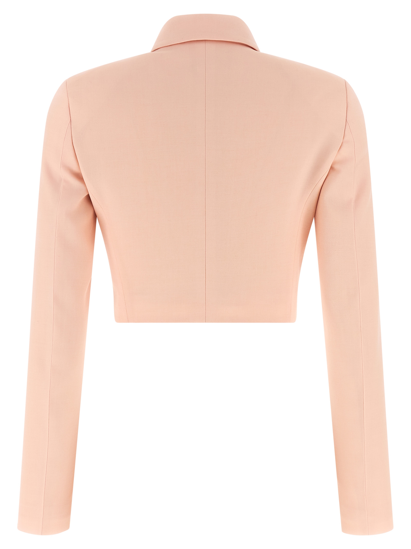 Tropical wool bolero blazer with shirt collar, front hook closure, structured shoulder strap, long sleeves, monogram viscose lining.