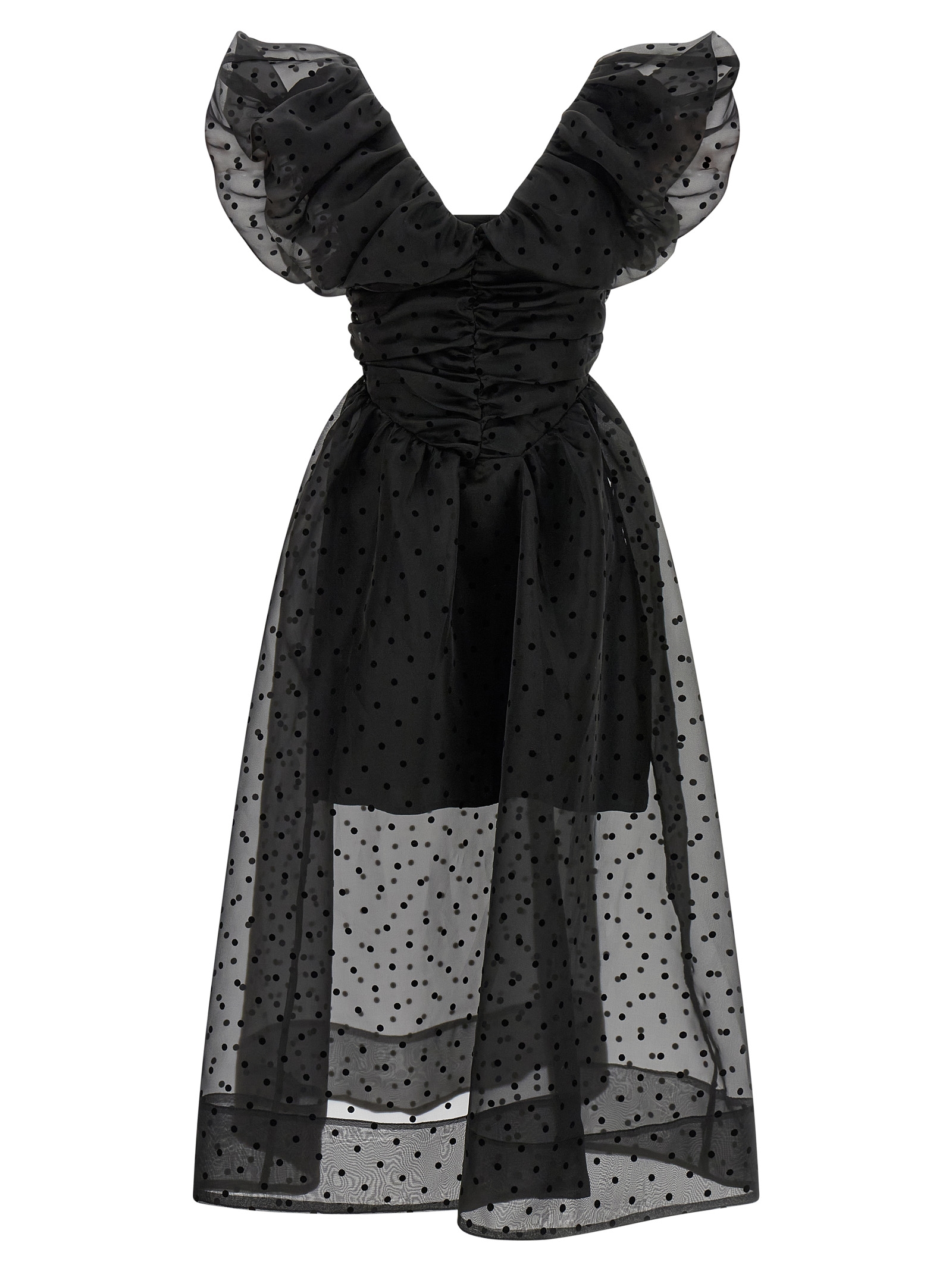 'Black Organza Ruched' midi dress in semi-transparent polka dot organza, V-neck and curled bodice front and back, short puff sleeves, side zip closure, viscose petticoat with thin removable straps.