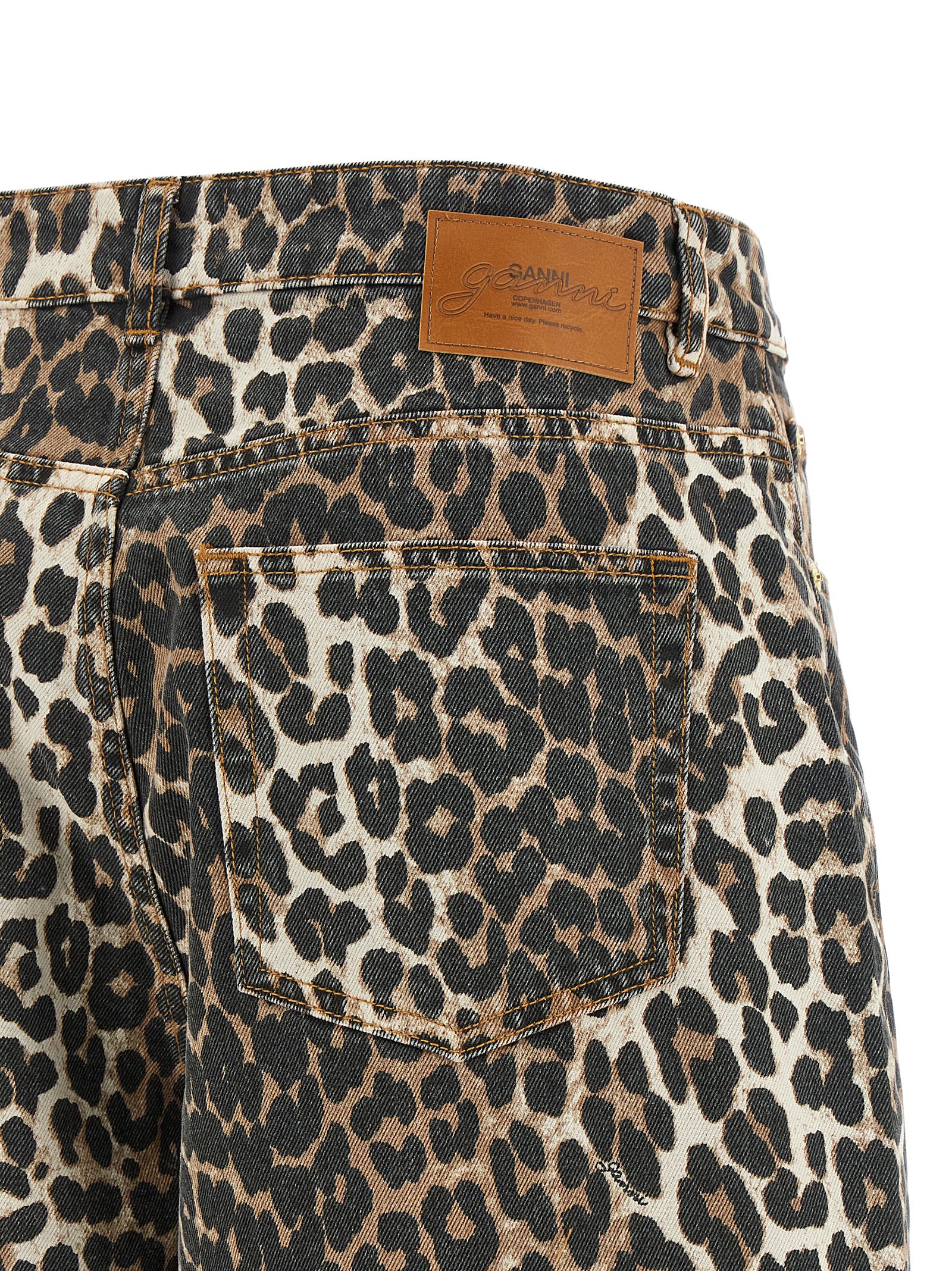 Джинсы 'Leopard Printed Stary' из неэластичного денима с леопардовым принтом GANNI, средняя посадка, укороченный крой, широкие штанины с закругленными боковыми швами, застежка на молнию и пуговицу спереди, пять карманов, бирка с логотипом сзади. ЭКОЛОГИЧНОСТЬ: Изделие изготовлено из органического хлопка.Характеристики товара