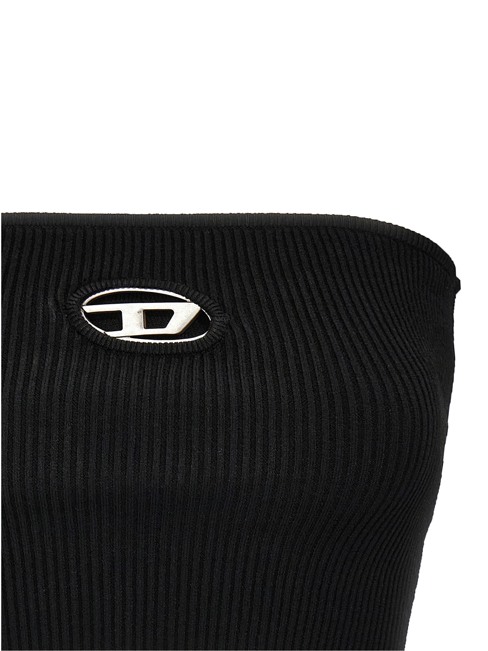 'M-Clarksvillex' ribbed stretch jersey top with front metal logo plaque with cut-out detail, off-the-shoulder bandeau design.