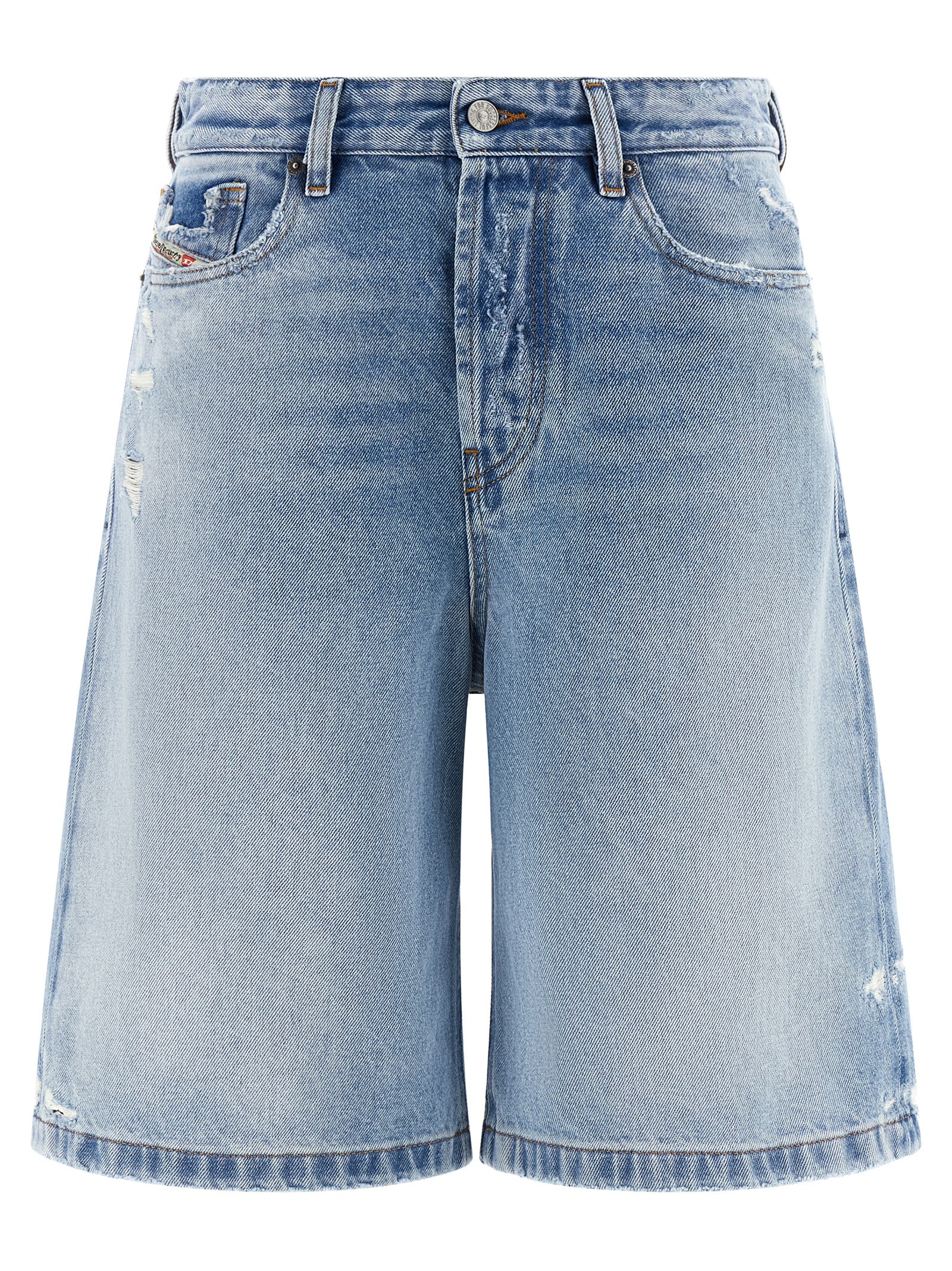 'De-Sire-Short' bermuda shorts in light blue washed cotton denim with distressed details, wide and straight leg, front button closure, five pockets, back logo tag. SUSTAINABLE: This product is made with organic cotton.